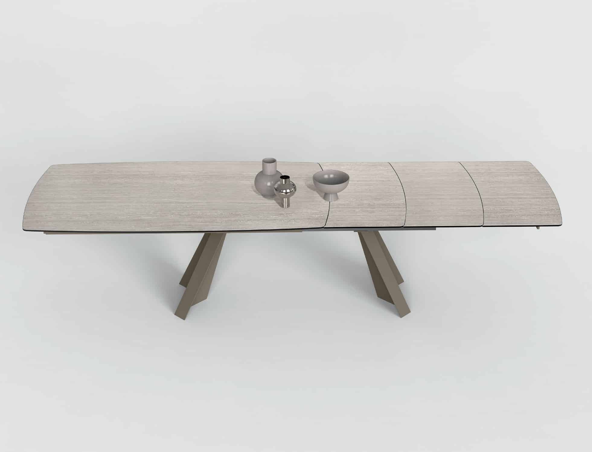 Tavolo con piano a “Botte” allungabile da un lato, piano disponibile in laminato, impiallacciato in Rovere, versione “Rovere spaccato” (RSP) vero legno vecchio, supporto in HDF tecnologico spessore 20mm con bordo rastremato a 8mm perimetralmente; meccanismo di allungo laterale sincronizzato autocentrante interamente in Alluminio anodizzato, piano principale in un unico pezzo, allunghe contenute all’interno del tavolo; base in metallo e sistema di allungo verniciati a polvere epossidica e o smalto materico, dotato di piedini regolabili.
