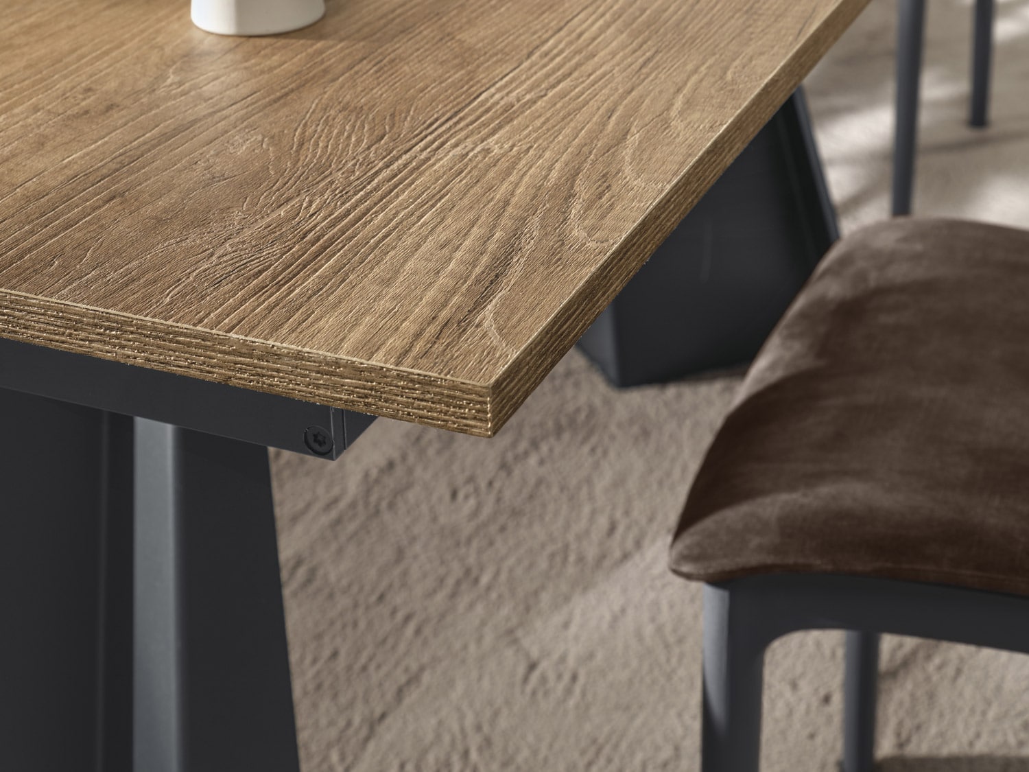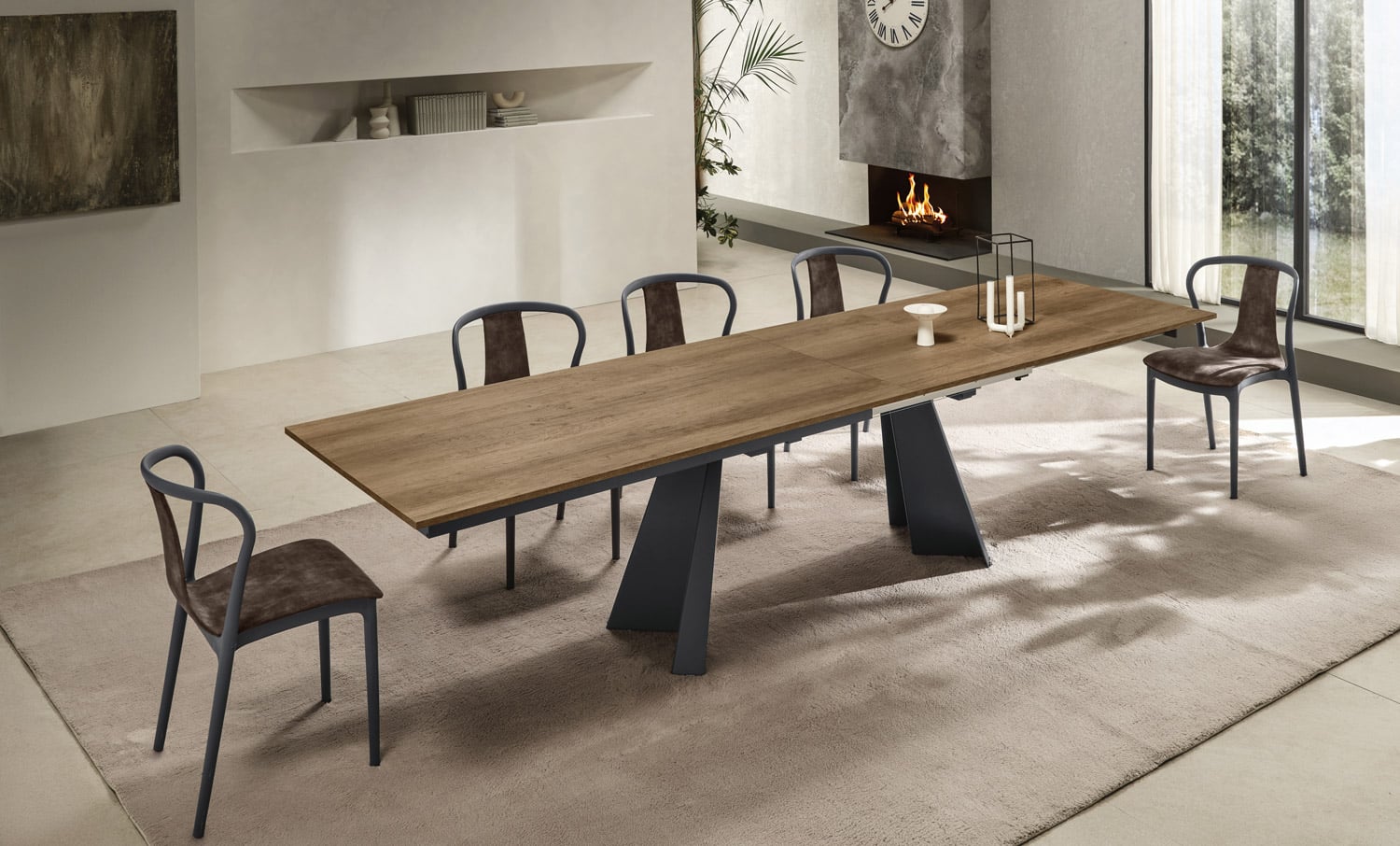 Tavolo rettangolare allungabile da un lato, piano disponibile in nobilitato e laminato, spessore rispettivamente 18 e 20mm; meccanismo di allungo laterale sincronizzato autocentrante interamente in Alluminio anodizzato, piano principale in un unico pezzo, allunghe contenute all’interno del tavolo, base in metallo e sistema di allungo verniciati a polvere epossidica e o smalto materico, dotato di piedini regolabili.