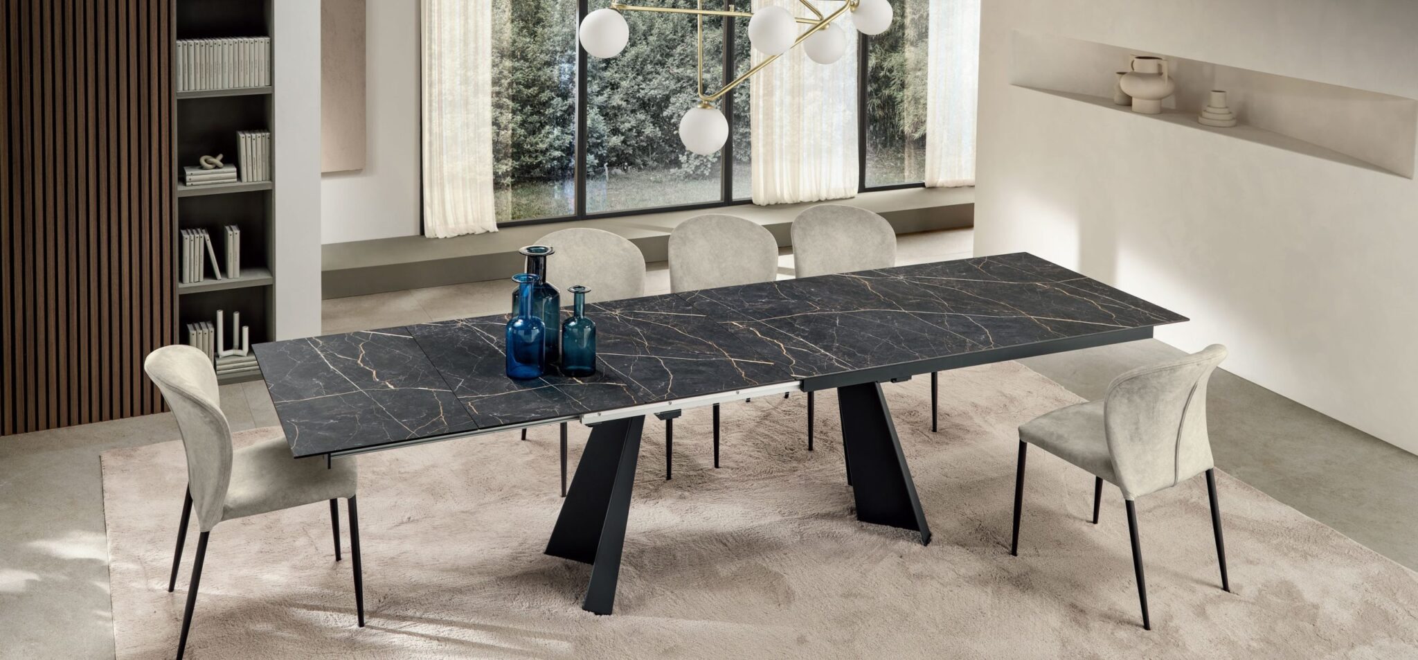 Tavolo rettangolare allungabile da un lato, piano disponibile in laminato, impiallacciato in Rovere, versione “Rovere spaccato” (RSP) vero legno vecchio, supporto in HDF tecnologico spessore 20mm con bordo rastremato a 8mm perimetralmente, o in vetro-ceramica spessore 11/12mm (solo versione 160.31) allunghe in nobilitato in abbinamento; meccanismo di allungo laterale sincronizzato autocentrante interamente in Alluminio anodizzato, piano principale in un unico pezzo, allunghe contenute all’interno del tavolo, base in metallo e sistema di allungo verniciati a polvere epossidica e o smalto materico, dotato di piedini regolabili.