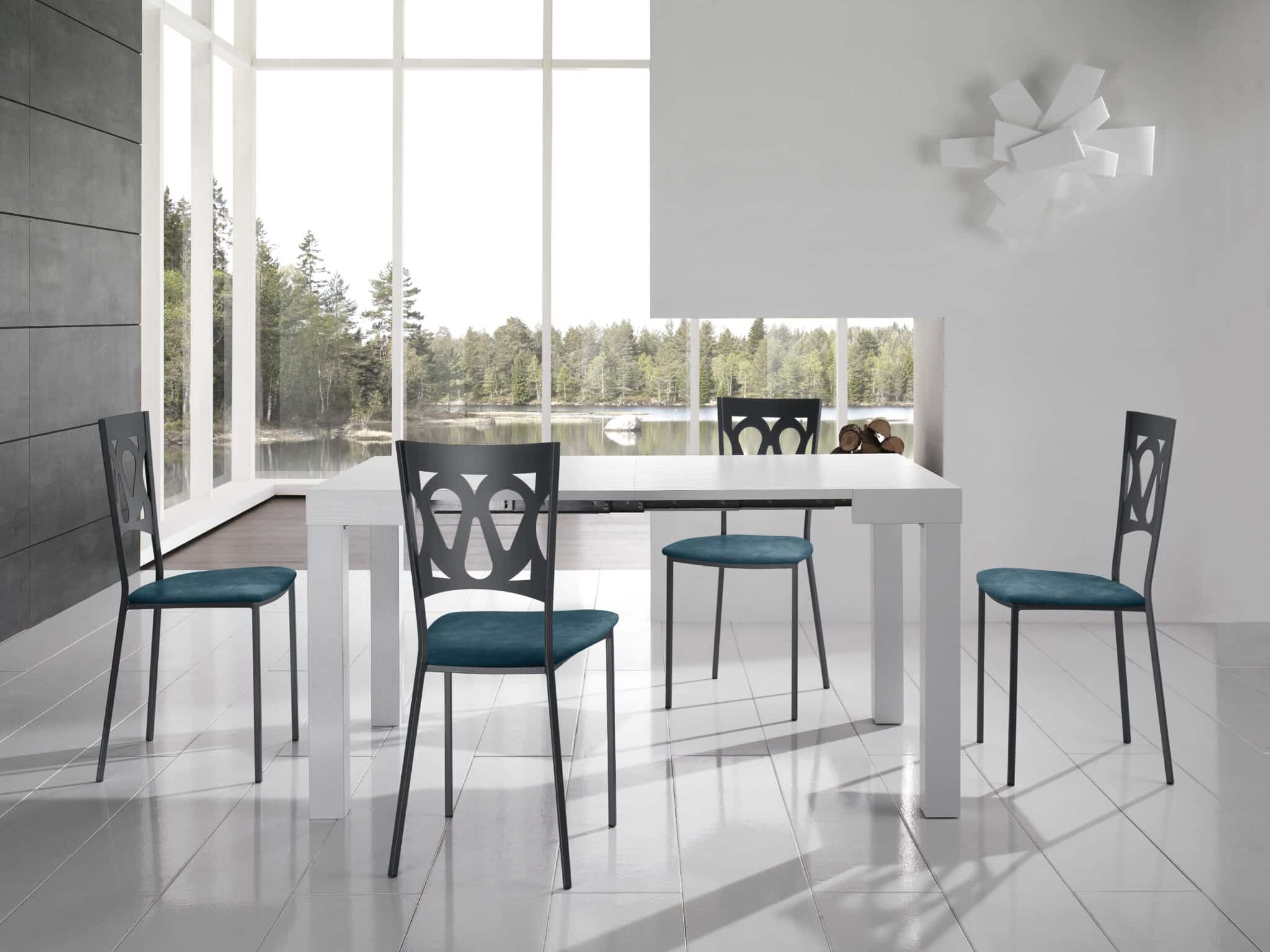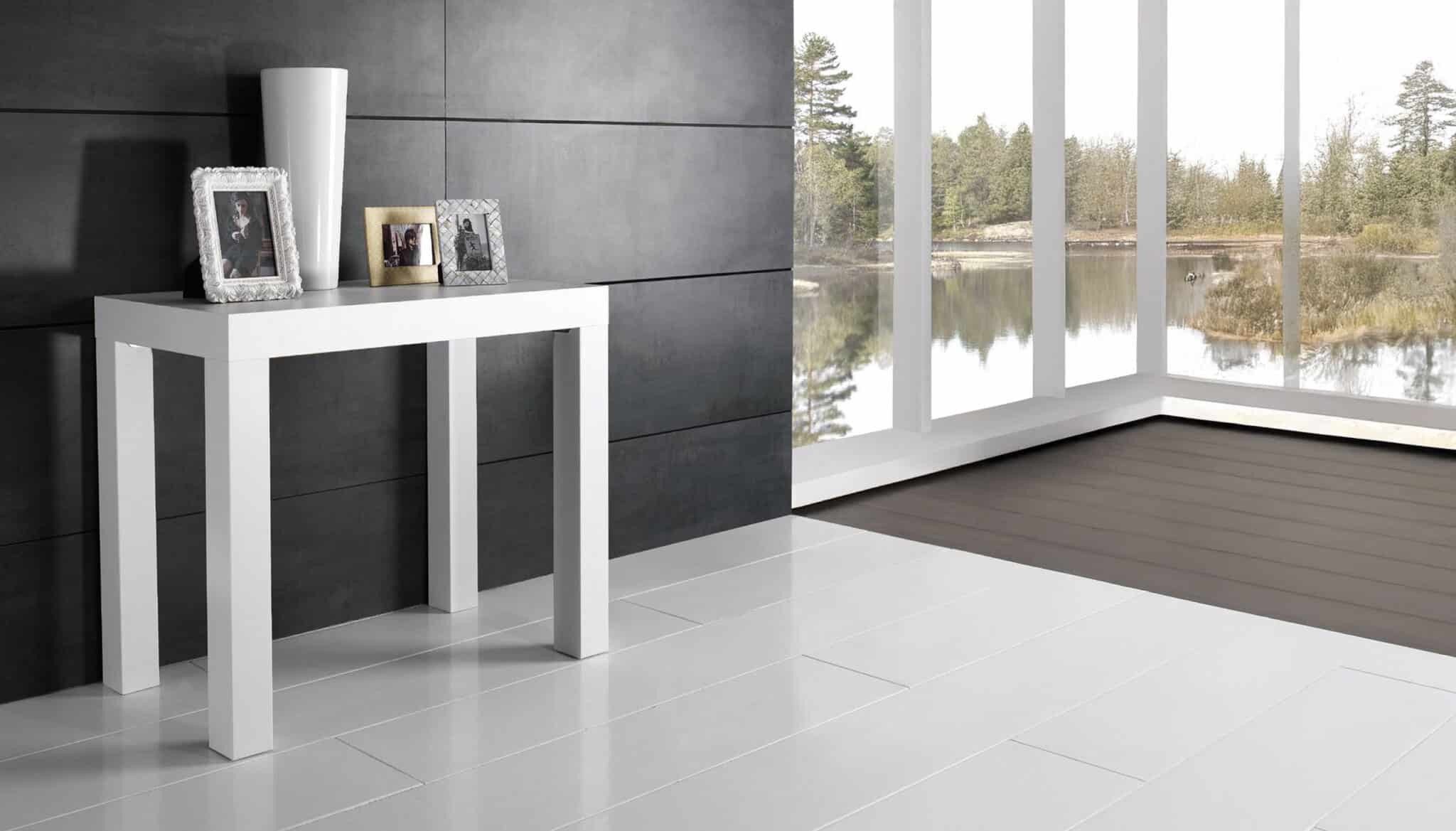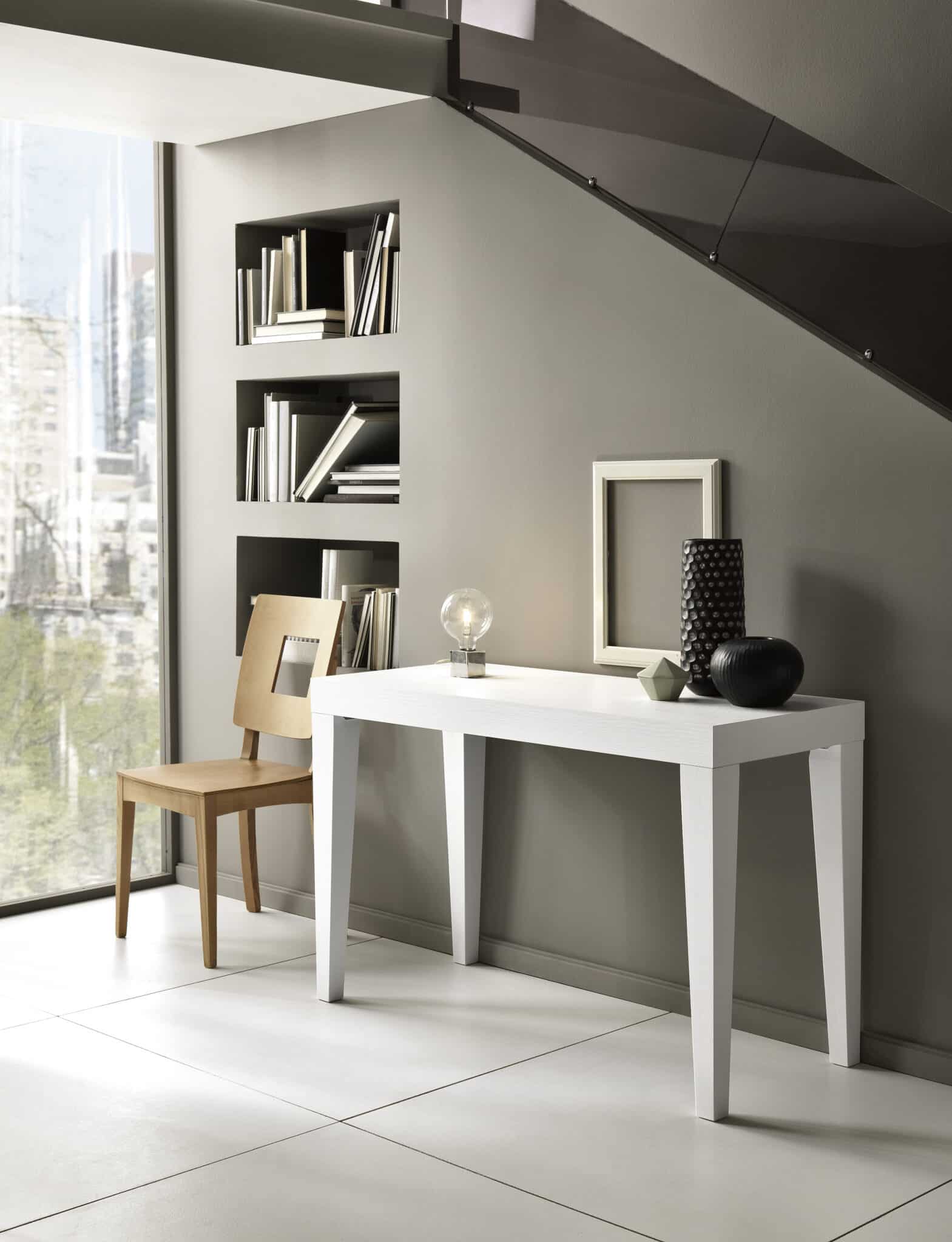 Tavolo consolle fisso o allungabile al centro, con gambi sempre perimetrali; piano a lavorazione “folding”, altezza bordo 80mm; piano e allunghe disponibili in nobilitato (solo versioni 900 – 920 – 105 – 105.20 – 120 – 120.20), laminato, impiallacciato in Frassino o in Rovere, versione “Rovere Spaccato” (RSP) in vero legno vecchio; meccanismo di allungo in acciaio zincato o alluminio; allunghe non contenute all’interno del tavolo; gambi in alluminio, legno massiccio e/o rivestiti in accordo con la finitura del piano, oppure in acciaio inox (ove possibile); nella versione allungabile una coppia di gambi è dotata di ruotino di scorrimento per facilitare l’allungamento (esclusi gambi in alluminio e Inox).