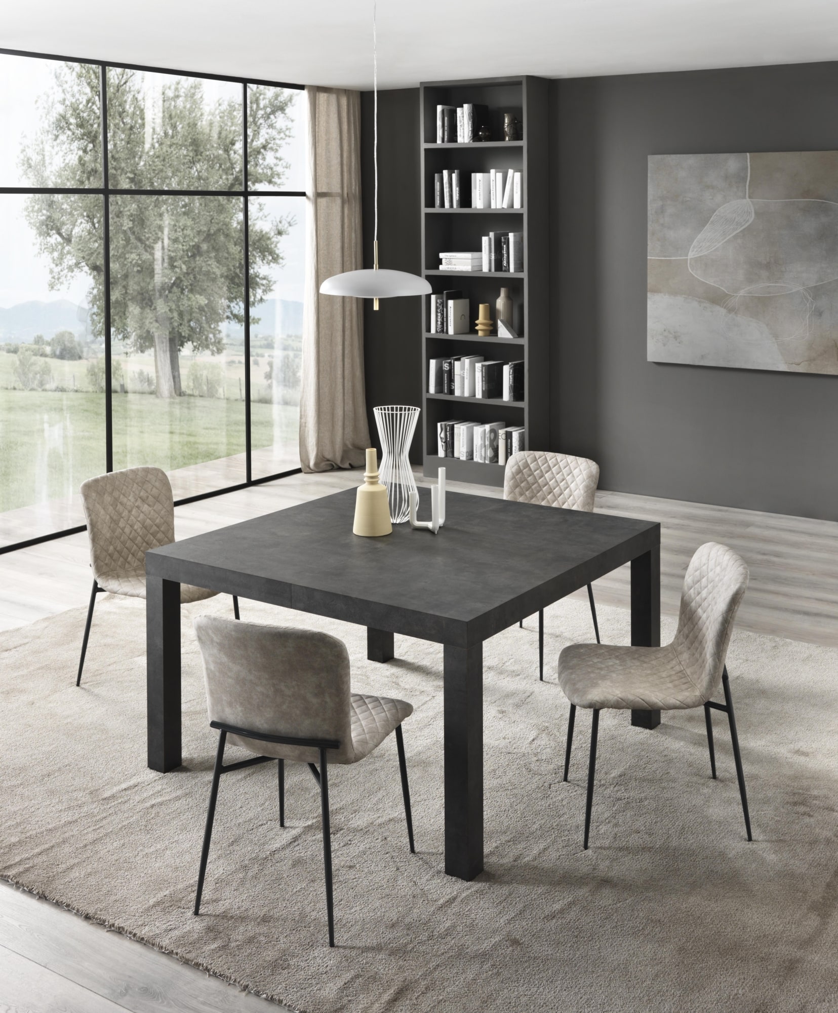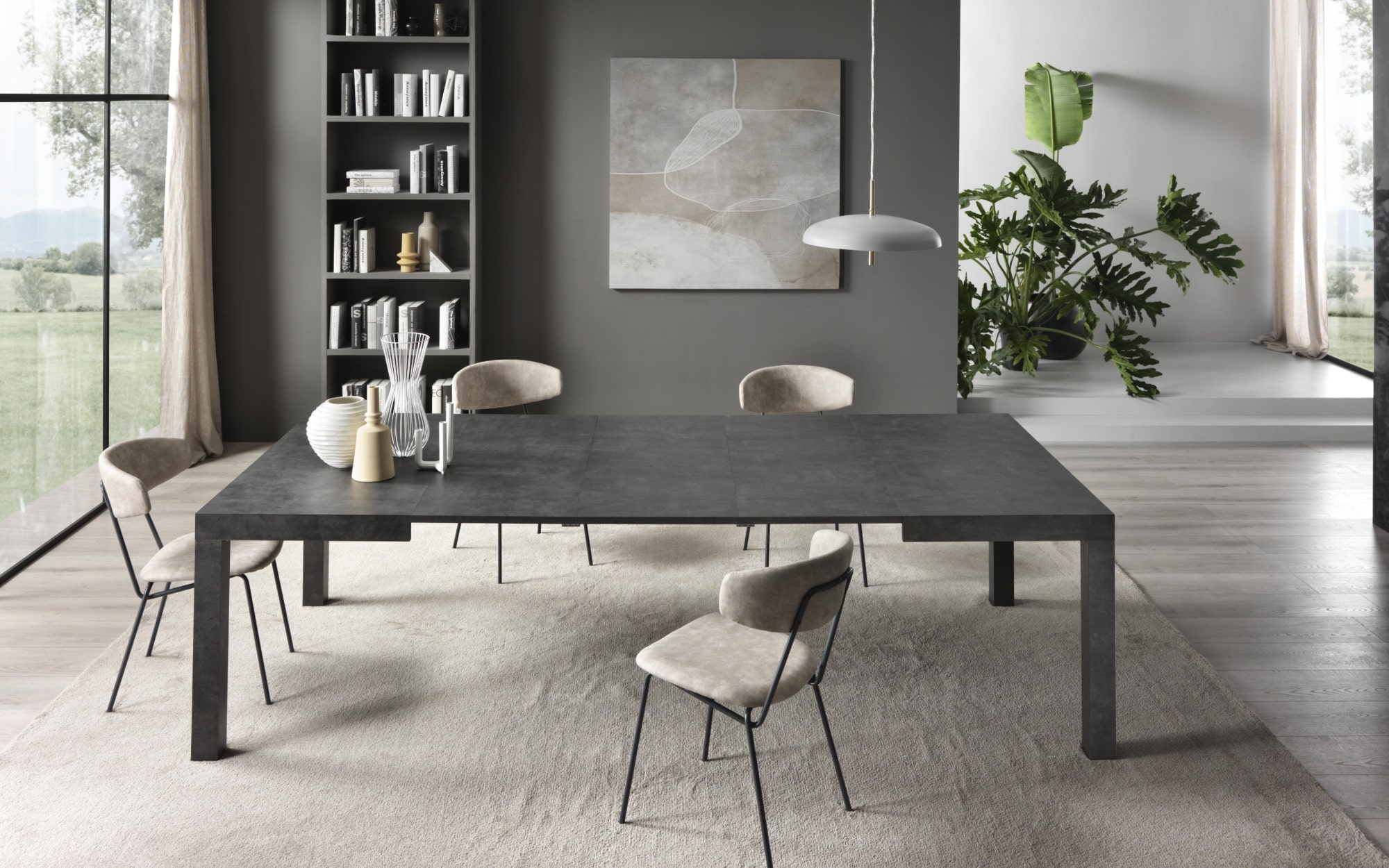 Tavolo fisso (solo versione 105) o allungabile al centro, con gambi sempre perimetrali. Il piano è a lavorazione “folding”, con altezza del bordo di 80 mm. Il piano e le allunghe sono disponibili in laminato, impiallacciato in Frassino o impiallacciato in Rovere, con la versione “Rovere Spaccato” (RSP) realizzata in vero legno vecchio. Il meccanismo di allungo è sincronizzato, in acciaio zincato e alluminio, bloccabile in qualsiasi posizione. Le allunghe sono contenute all’interno del tavolo. I gambi sono in legno massiccio o rivestiti, in accordo con la finitura del piano. Nella versione allungabile, una coppia di gambi è dotata di ruotino di scorrimento per facilitare l’allungamento.