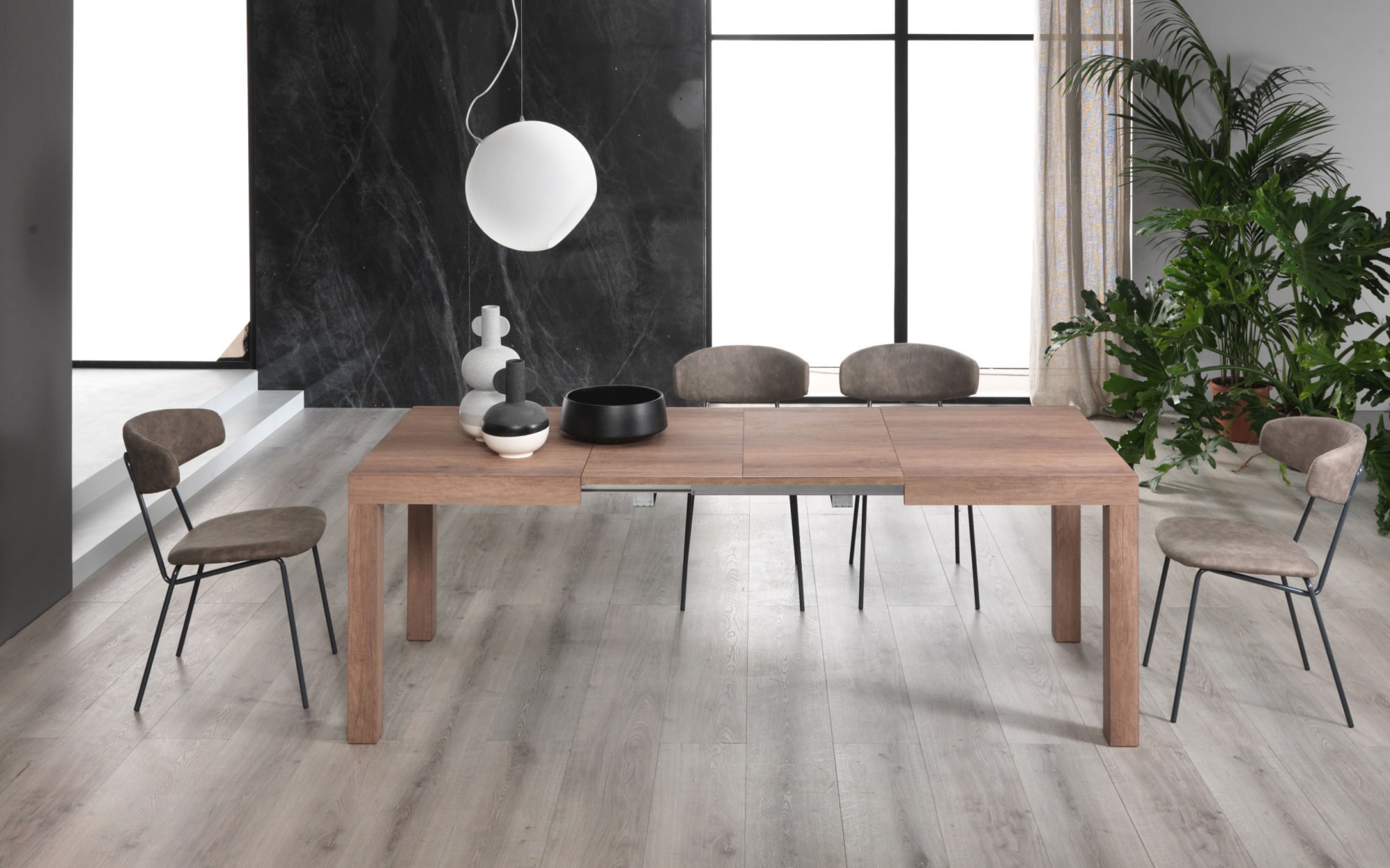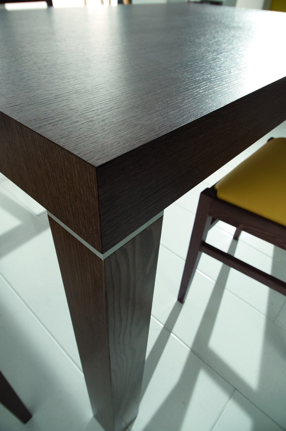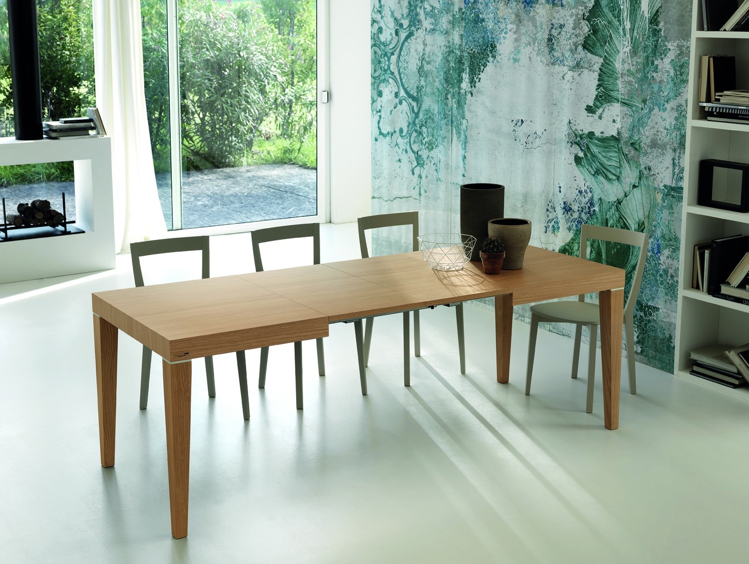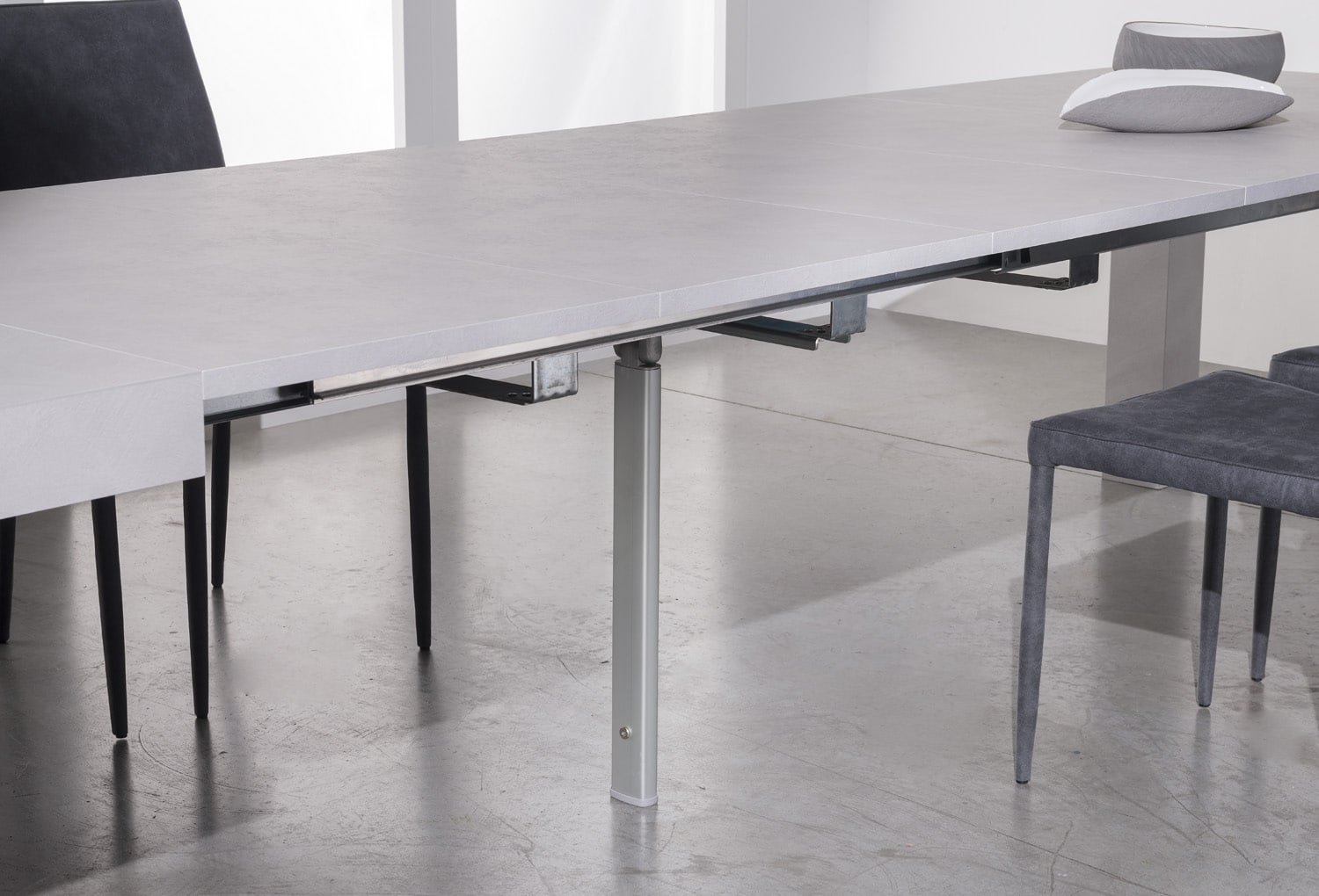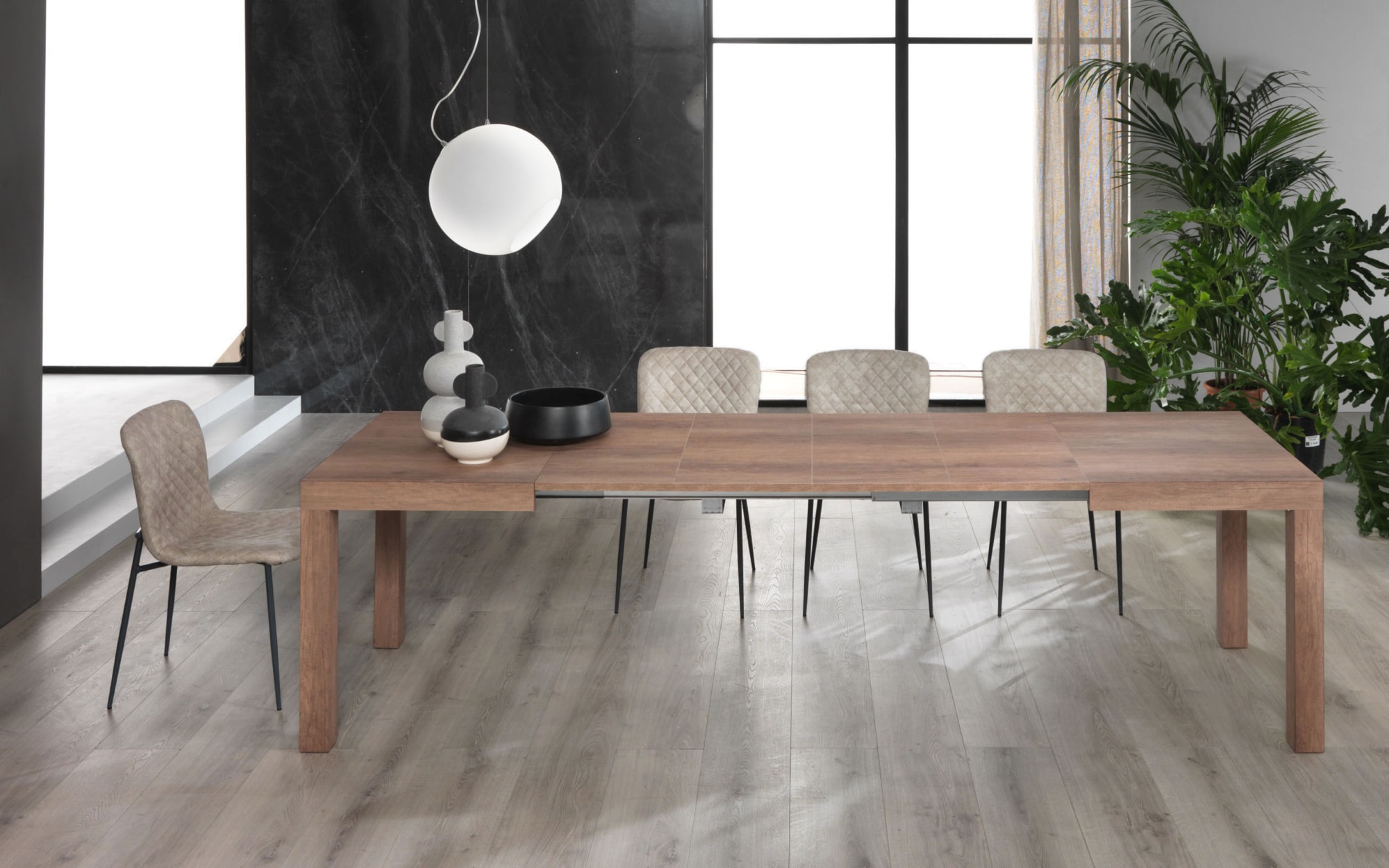 Tavolo fisso o allungabile al centro, con gambi sempre perimetrali. Il piano a lavorazione “folding” ha un bordo di 80 mm di altezza. Il piano e le allunghe sono disponibili in nobilitato (eccetto per le versioni 110, 180 e 200), laminato, o impiallacciato in Frassino o Rovere, con la versione “Rovere Spaccato” (RSP) che riproduce il vero legno vecchio. Il meccanismo di allungo sincronizzato è in acciaio zincato e alluminio, ed è bloccabile in qualsiasi posizione. Le allunghe sono contenute all’interno del tavolo (eccetto nella versione MAXI). I gambi sono disponibili in alluminio, legno massiccio o rivestiti in accordo con la finitura del piano, oppure in acciaio inox (dove possibile). Nella versione allungabile, una coppia di gambi è dotata di ruotino di scorrimento per facilitare l’allungamento (eccetto per i gambi in alluminio e inox).