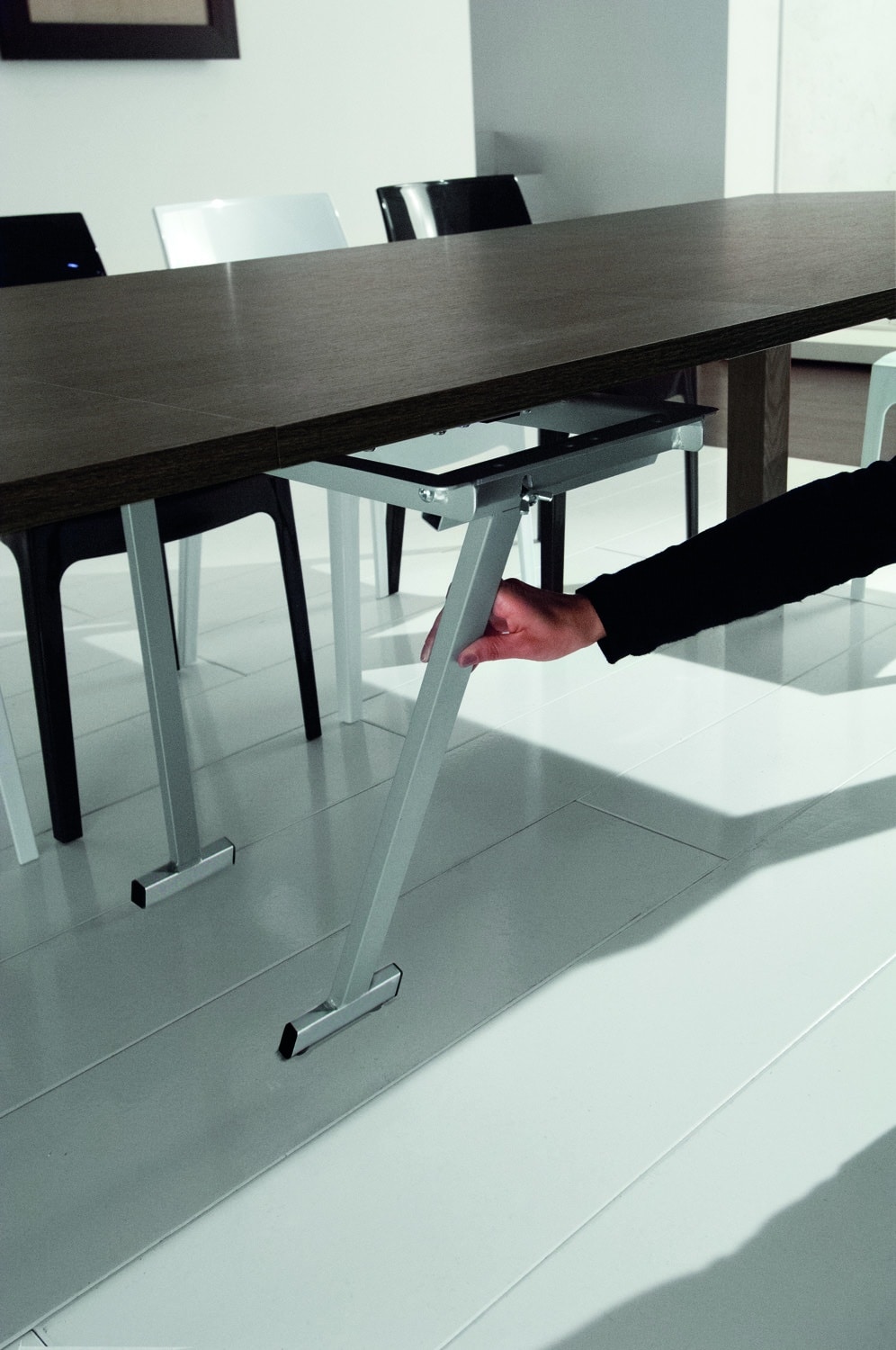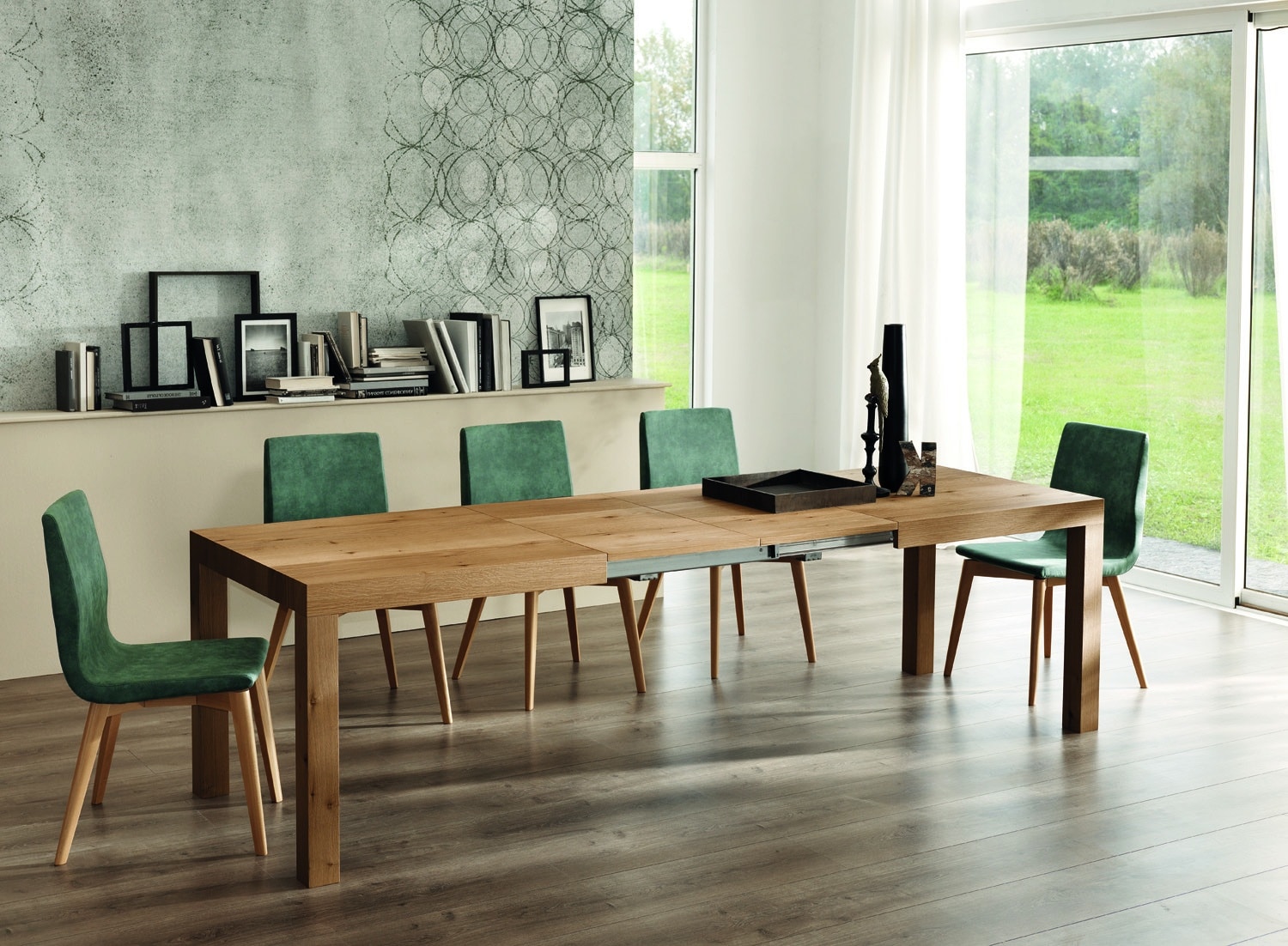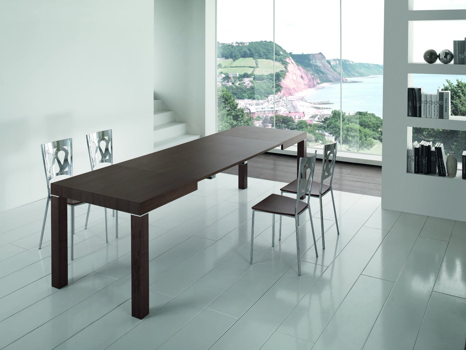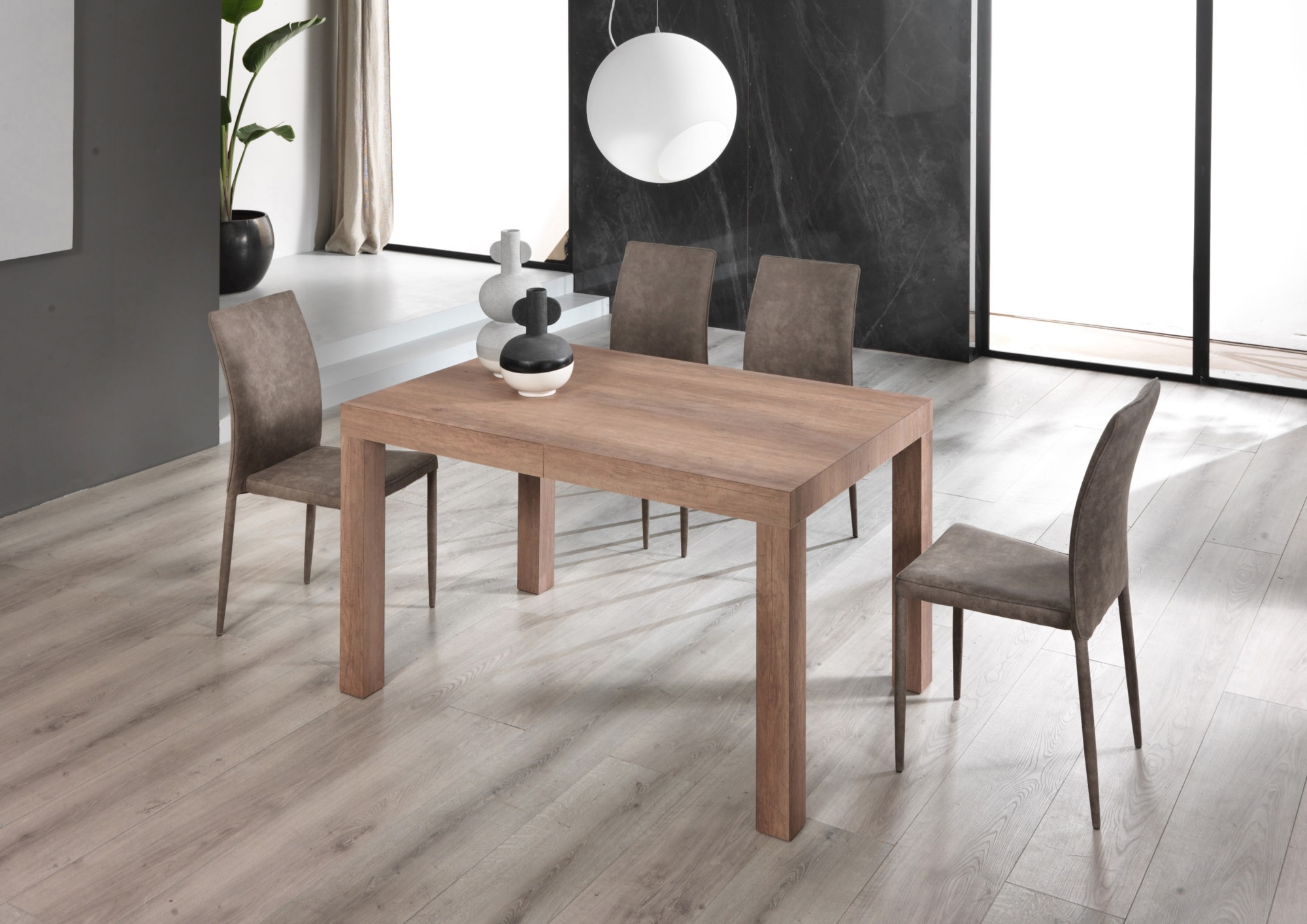 Tavolo fisso o allungabile al centro, con gambi sempre perimetrali. Il piano a lavorazione “folding” ha un bordo di 80 mm di altezza. Il piano e le allunghe sono disponibili in nobilitato (eccetto per le versioni 110, 180 e 200), laminato, o impiallacciato in Frassino o Rovere, con la versione “Rovere Spaccato” (RSP) che riproduce il vero legno vecchio. Il meccanismo di allungo sincronizzato è in acciaio zincato e alluminio, ed è bloccabile in qualsiasi posizione. Le allunghe sono contenute all’interno del tavolo (eccetto nella versione MAXI). I gambi sono disponibili in alluminio, legno massiccio o rivestiti in accordo con la finitura del piano, oppure in acciaio inox (dove possibile). Nella versione allungabile, una coppia di gambi è dotata di ruotino di scorrimento per facilitare l’allungamento (eccetto per i gambi in alluminio e inox).