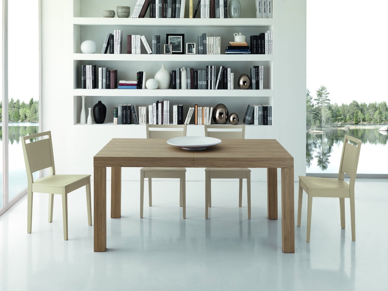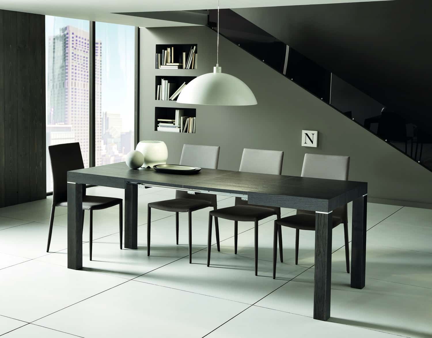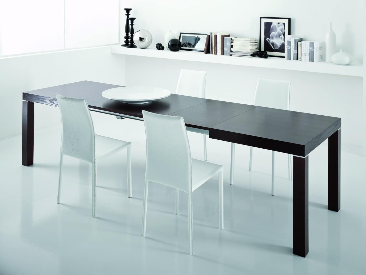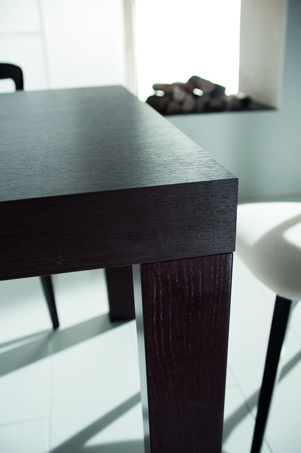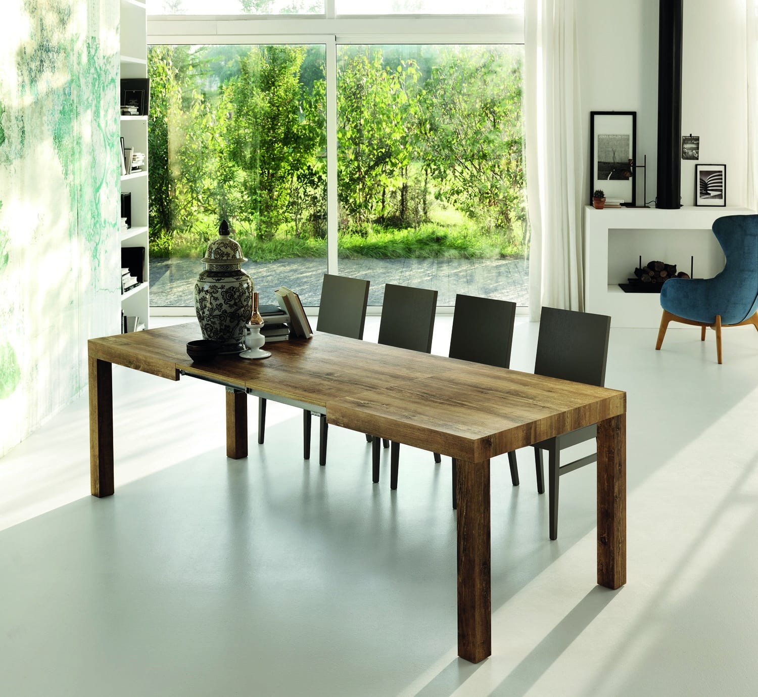 Tavolo fisso o allungabile al centro, con gambi sempre perimetrali. Il piano a lavorazione “folding” ha un bordo di 80 mm di altezza. Il piano e le allunghe sono disponibili in nobilitato (eccetto per le versioni 110, 180 e 200), laminato, o impiallacciato in Frassino o Rovere, con la versione “Rovere Spaccato” (RSP) che riproduce il vero legno vecchio. Il meccanismo di allungo sincronizzato è in acciaio zincato e alluminio, ed è bloccabile in qualsiasi posizione. Le allunghe sono contenute all’interno del tavolo (eccetto nella versione MAXI). I gambi sono disponibili in alluminio, legno massiccio o rivestiti in accordo con la finitura del piano, oppure in acciaio inox (dove possibile). Nella versione allungabile, una coppia di gambi è dotata di ruotino di scorrimento per facilitare l’allungamento (eccetto per i gambi in alluminio e inox).