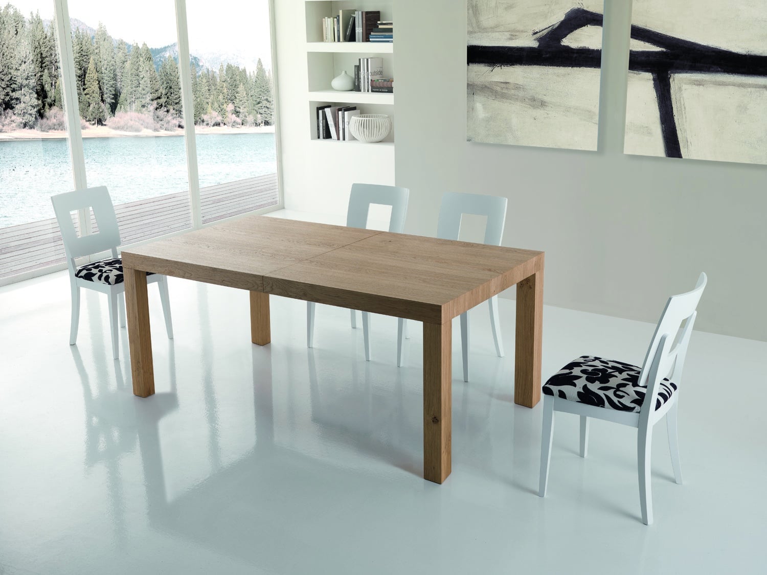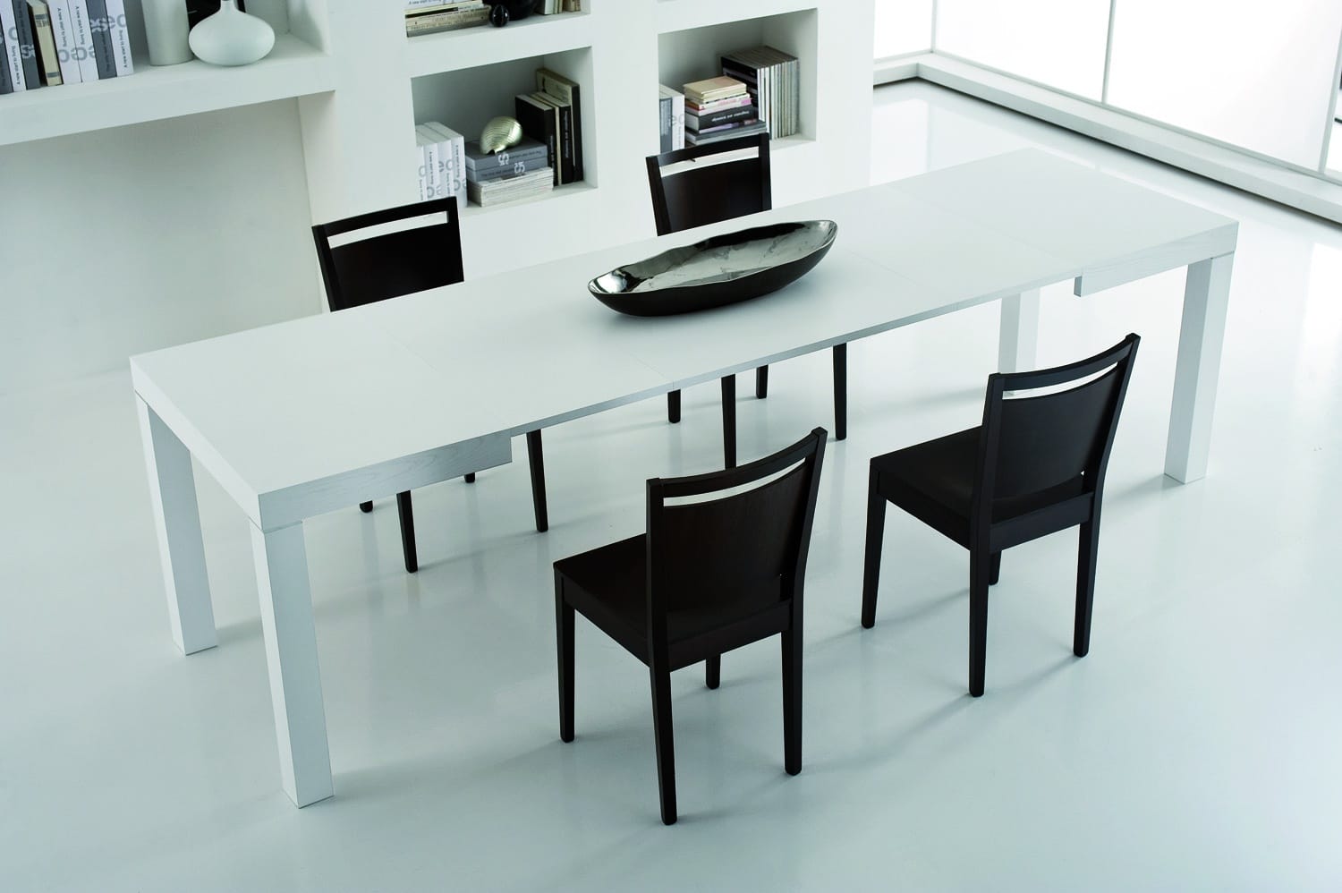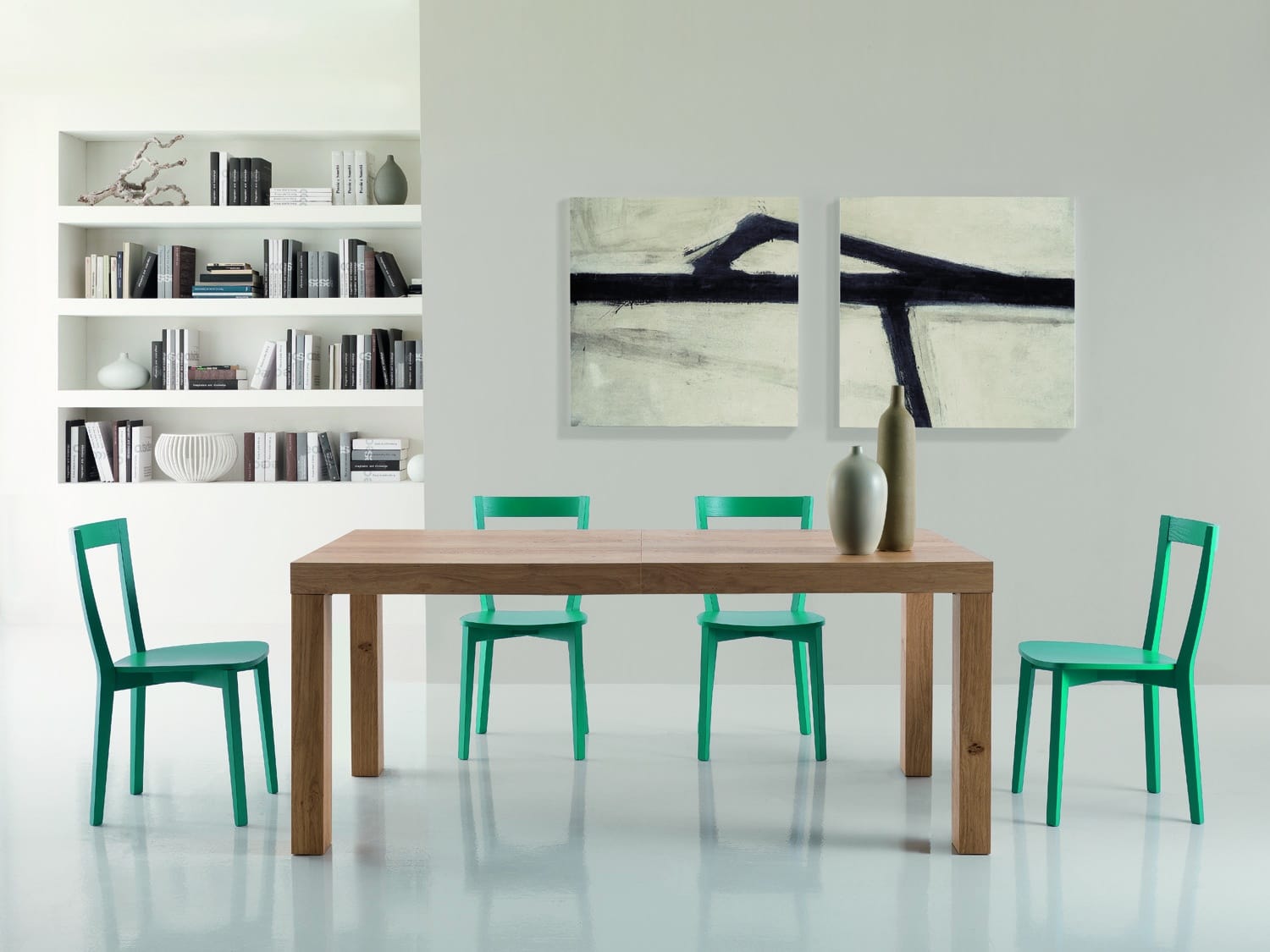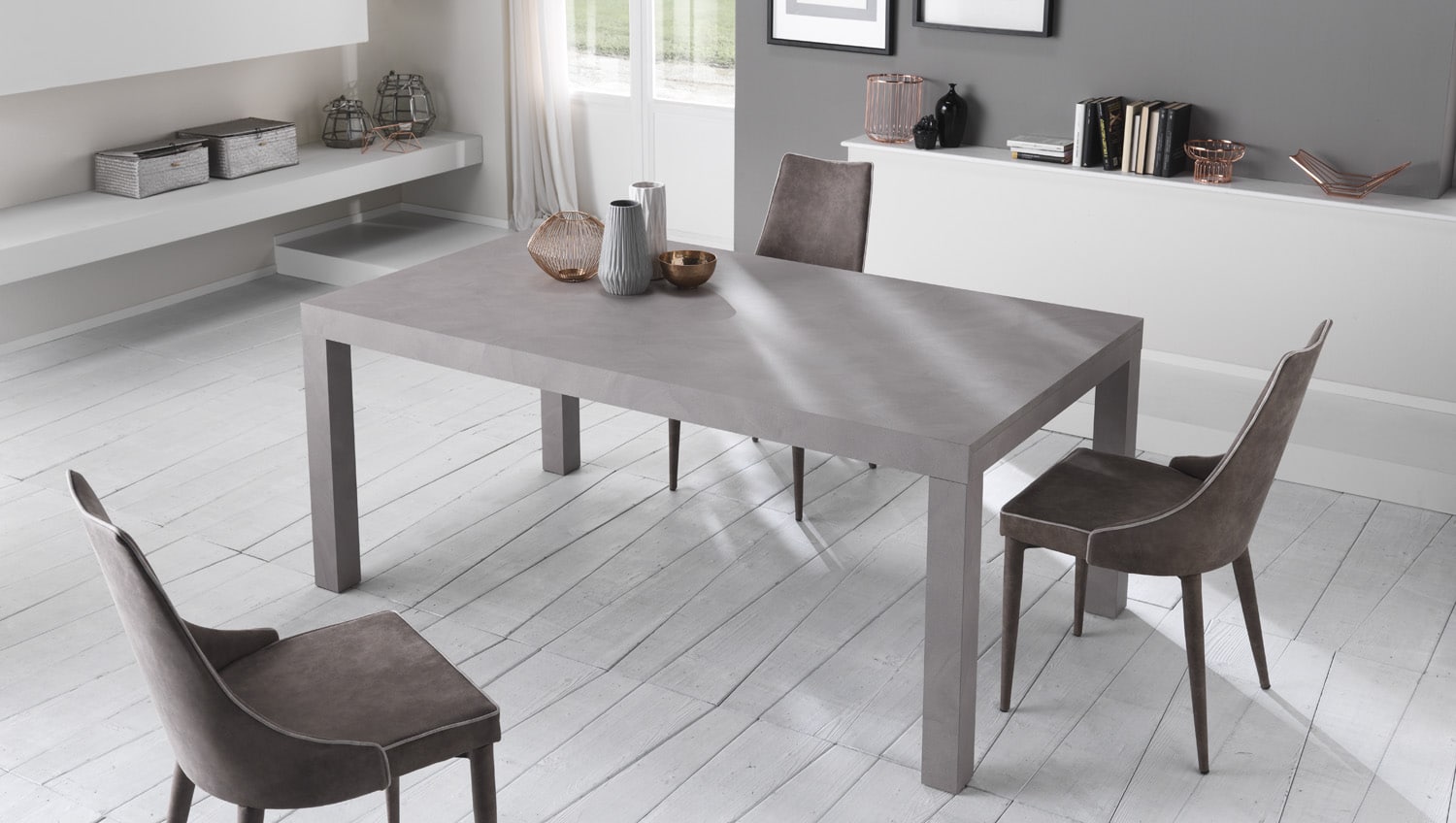 Tavolo fisso o allungabile al centro, con gambi sempre perimetrali. Il piano a lavorazione “folding” ha un bordo di 80 mm di altezza. Il piano e le allunghe sono disponibili in nobilitato (eccetto per le versioni 110, 180 e 200), laminato, o impiallacciato in Frassino o Rovere, con la versione “Rovere Spaccato” (RSP) che riproduce il vero legno vecchio. Il meccanismo di allungo sincronizzato è in acciaio zincato e alluminio, ed è bloccabile in qualsiasi posizione. Le allunghe sono contenute all’interno del tavolo (eccetto nella versione MAXI). I gambi sono disponibili in alluminio, legno massiccio o rivestiti in accordo con la finitura del piano, oppure in acciaio inox (dove possibile). Nella versione allungabile, una coppia di gambi è dotata di ruotino di scorrimento per facilitare l’allungamento (eccetto per i gambi in alluminio e inox).