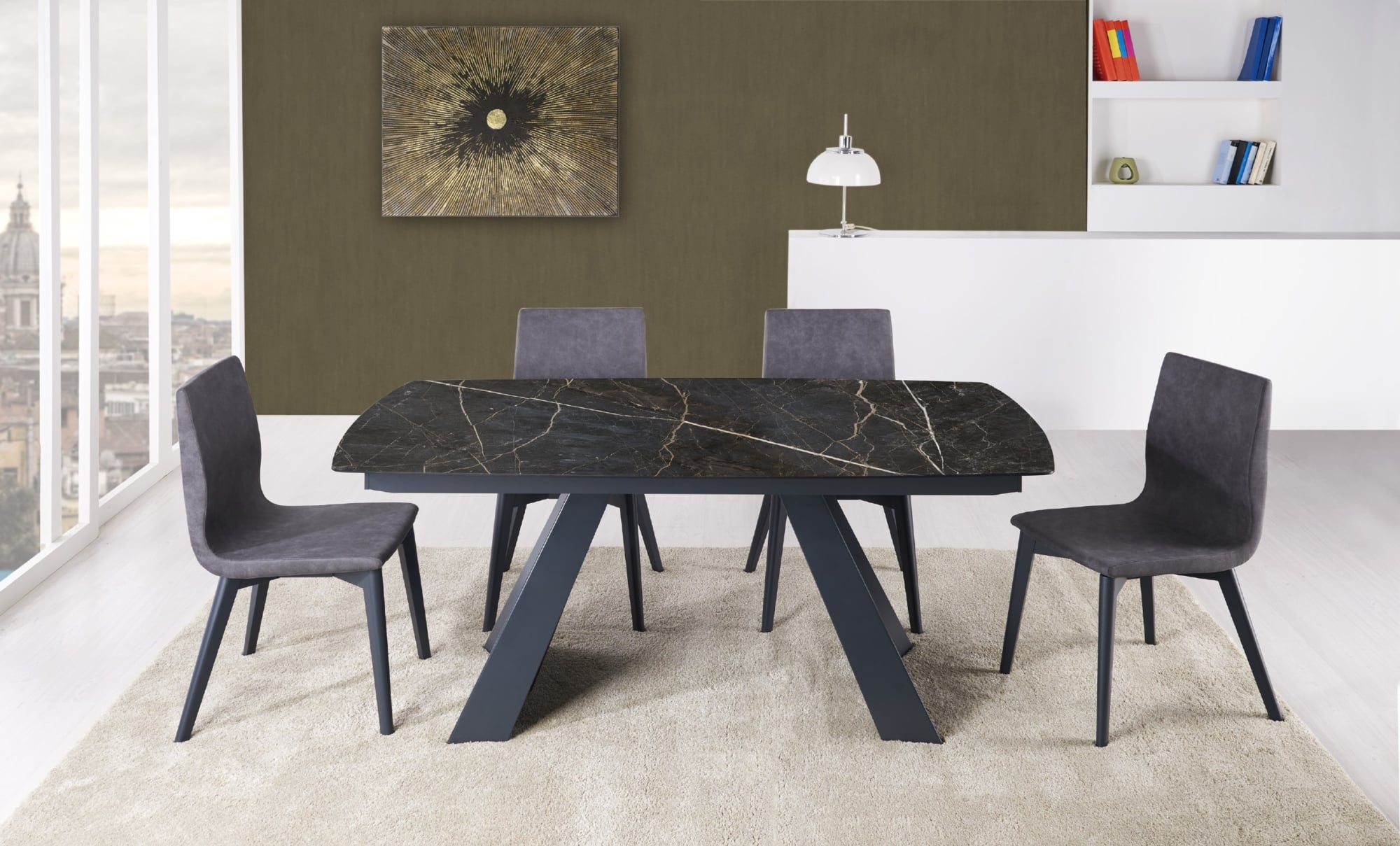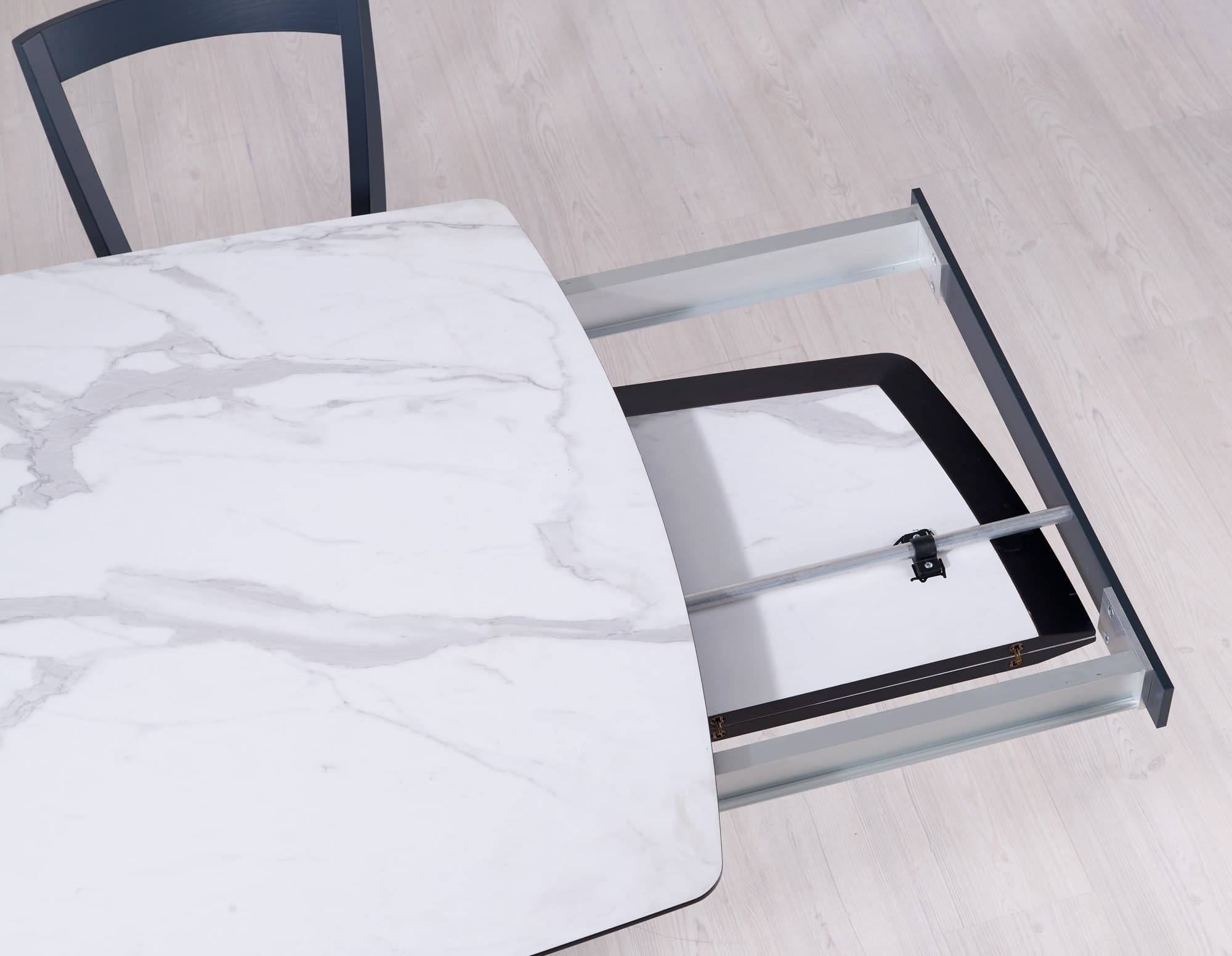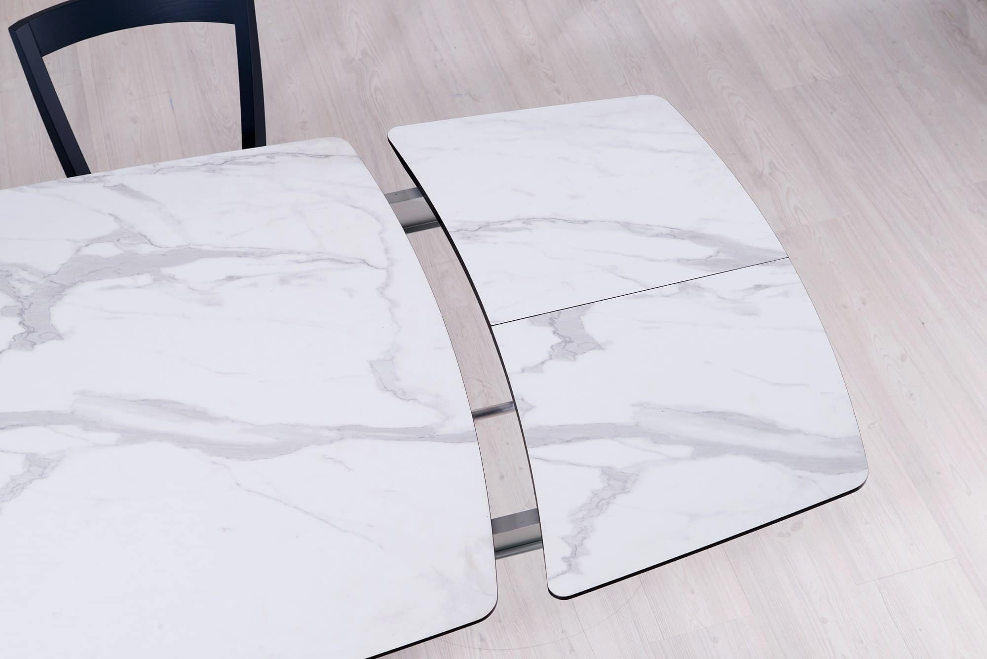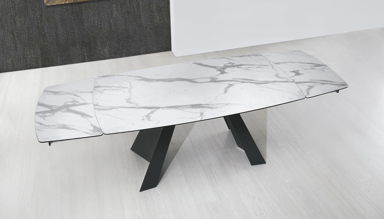 Tavolo allungabile sui due lati, piano arrotondato a “BOTTE”, allunghe solidali al tavolo inserite nel sistema di allungo; piano disponibile in Laminato, impiallacciato in Rovere; versione “Rovere Spaccato” (RSP) vero legno vecchio; supporto in HDF tecnologico spessore 20mm bordo rastremato a 8mm perimetralmente; sistema di allungo bilaterale in alluminio anodizzato indipendente con allunghe solidali allo stesso; basamento in acciaio verniciato a polvere epossidica e o smalti materici, dotato di piedini regolabili.