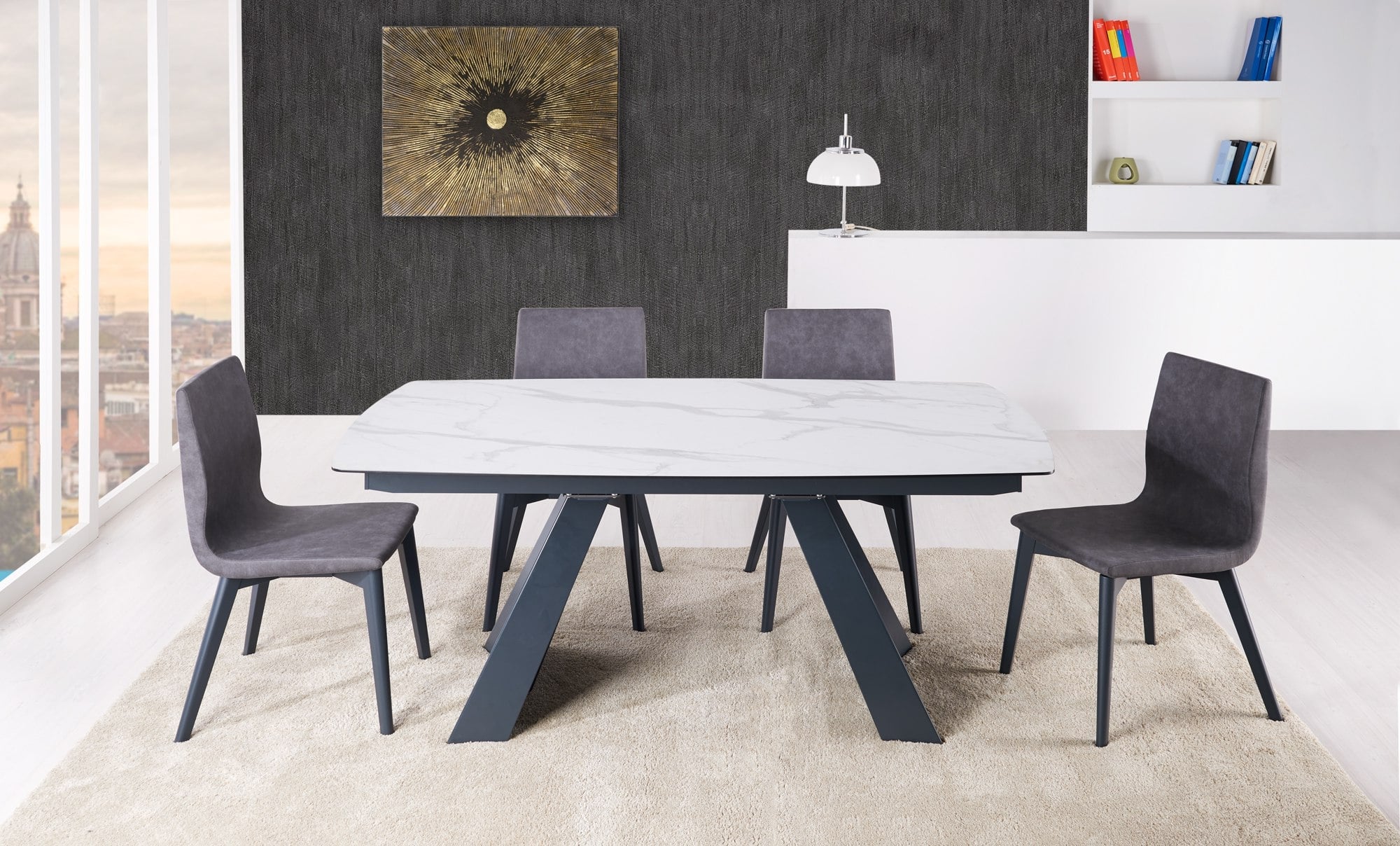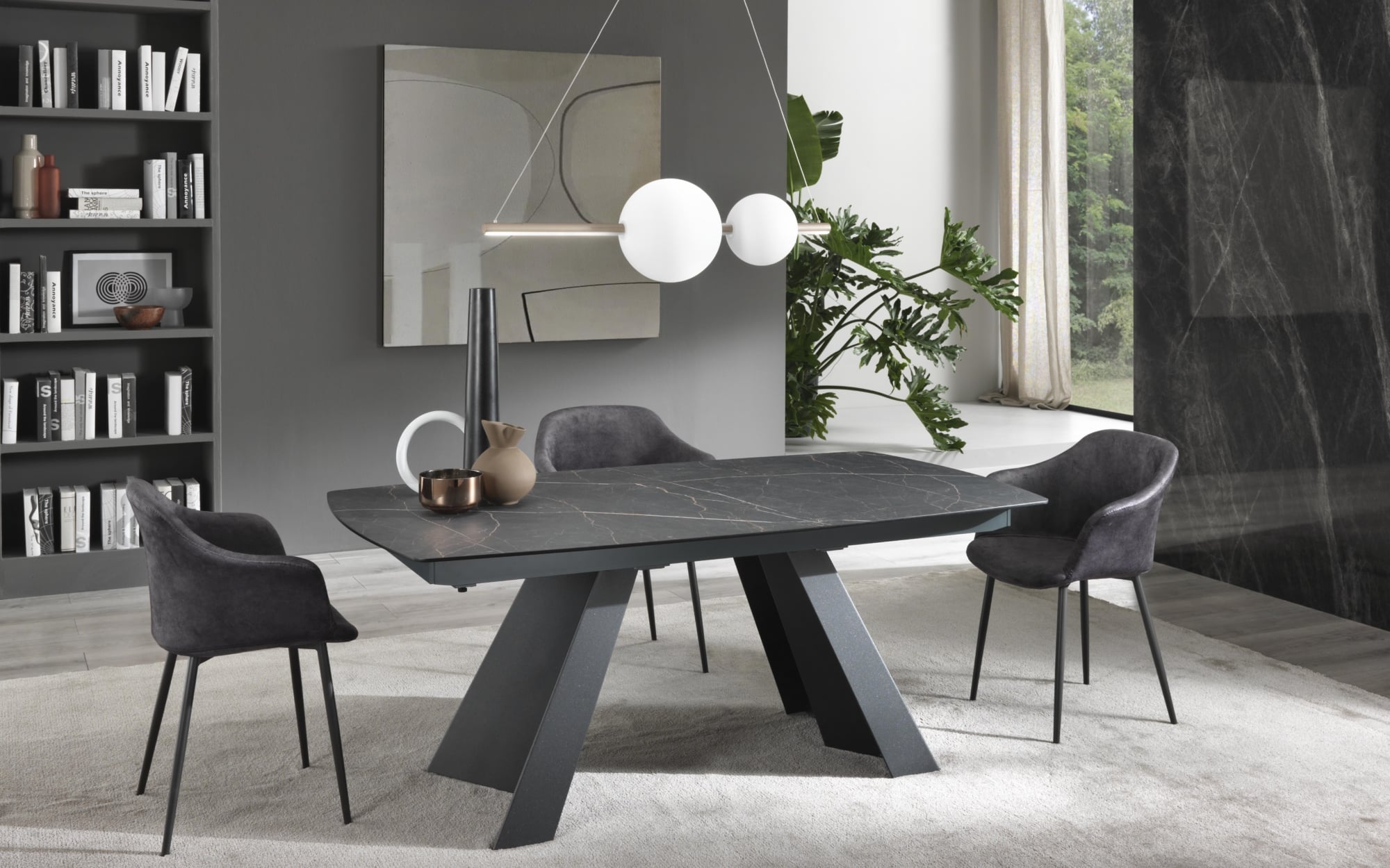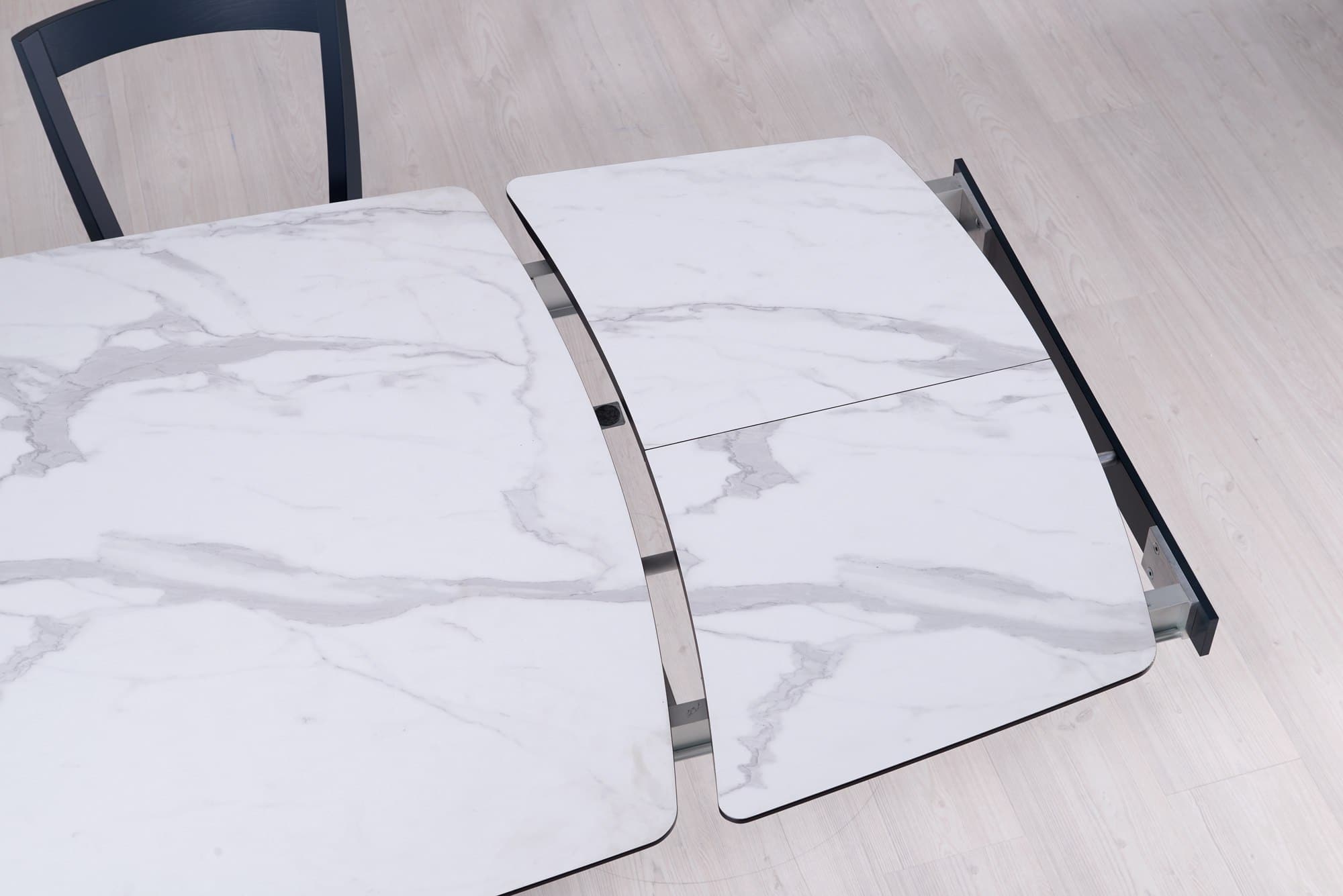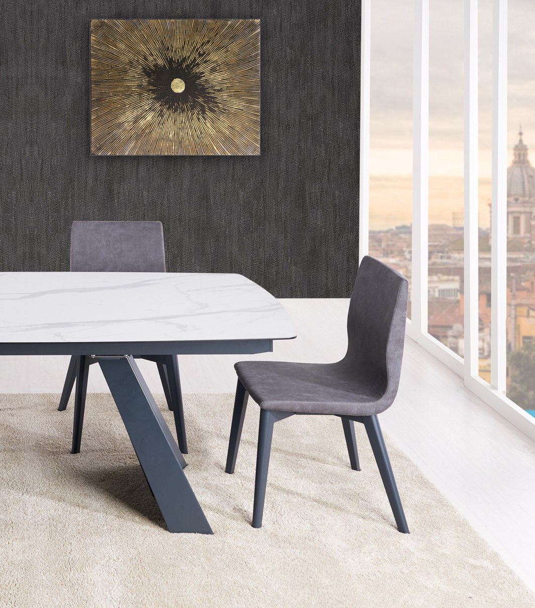 Tavolo allungabile sui due lati, piano arrotondato a “BOTTE”, allunghe solidali al tavolo inserite nel sistema di allungo; piano disponibile in Laminato, impiallacciato in Rovere; versione “Rovere Spaccato” (RSP) vero legno vecchio; supporto in HDF tecnologico spessore 20mm bordo rastremato a 8mm perimetralmente; sistema di allungo bilaterale in alluminio anodizzato indipendente con allunghe solidali allo stesso; basamento in acciaio verniciato a polvere epossidica e o smalti materici, dotato di piedini regolabili.