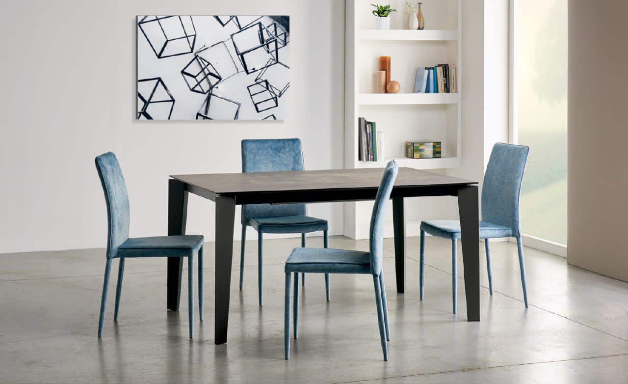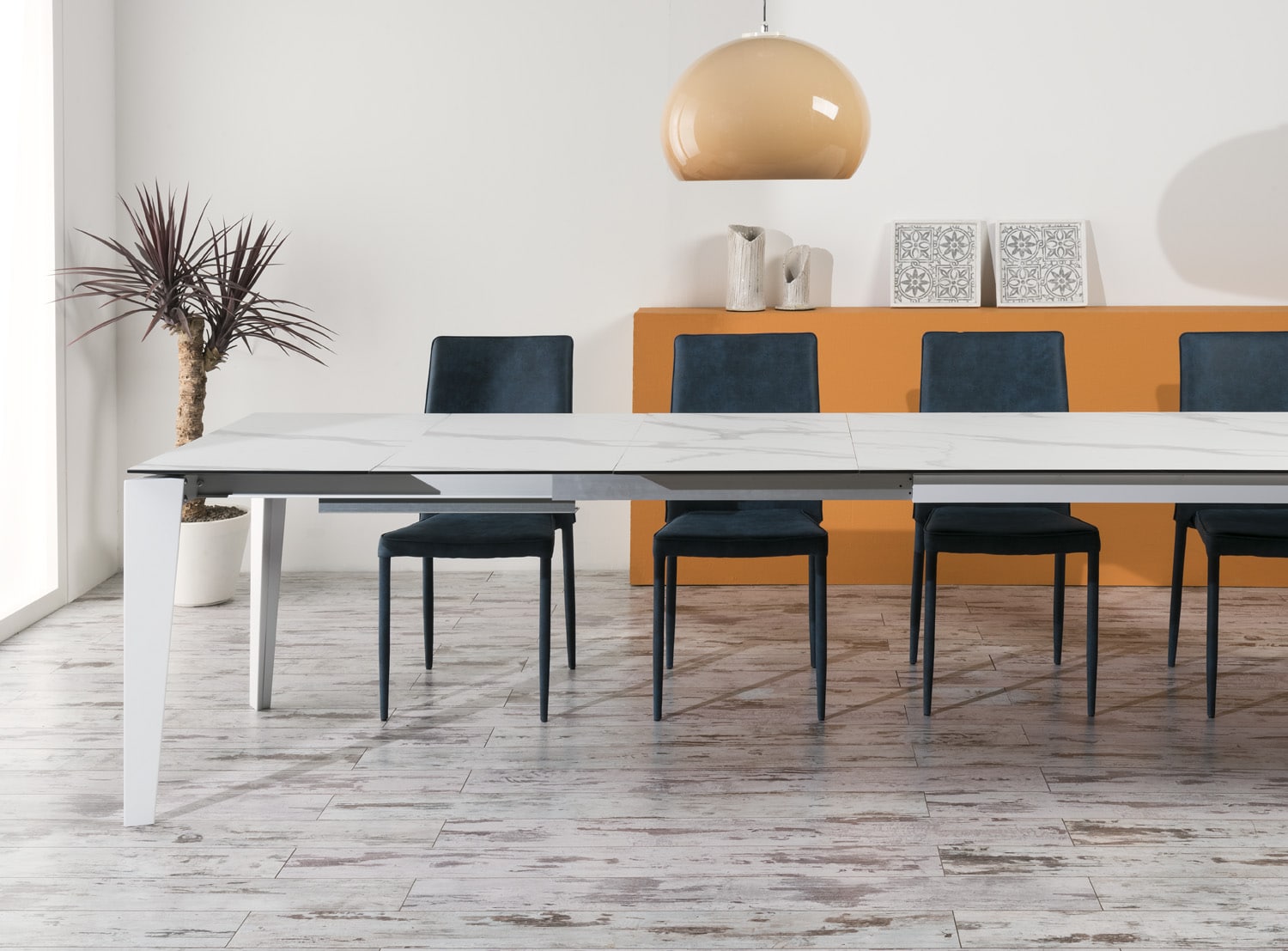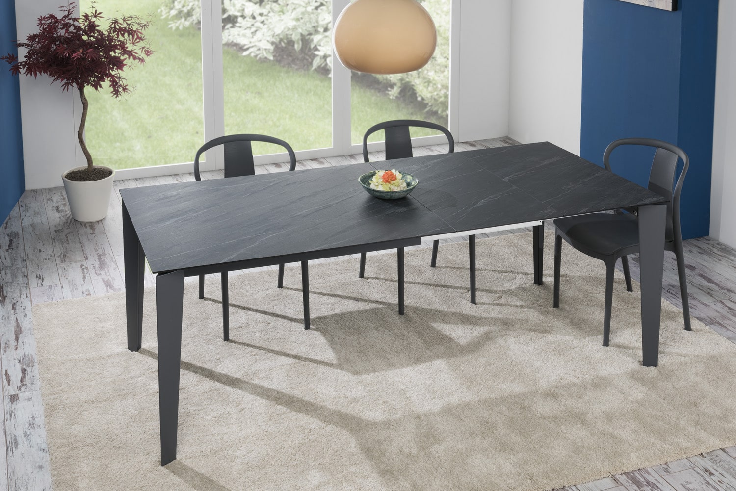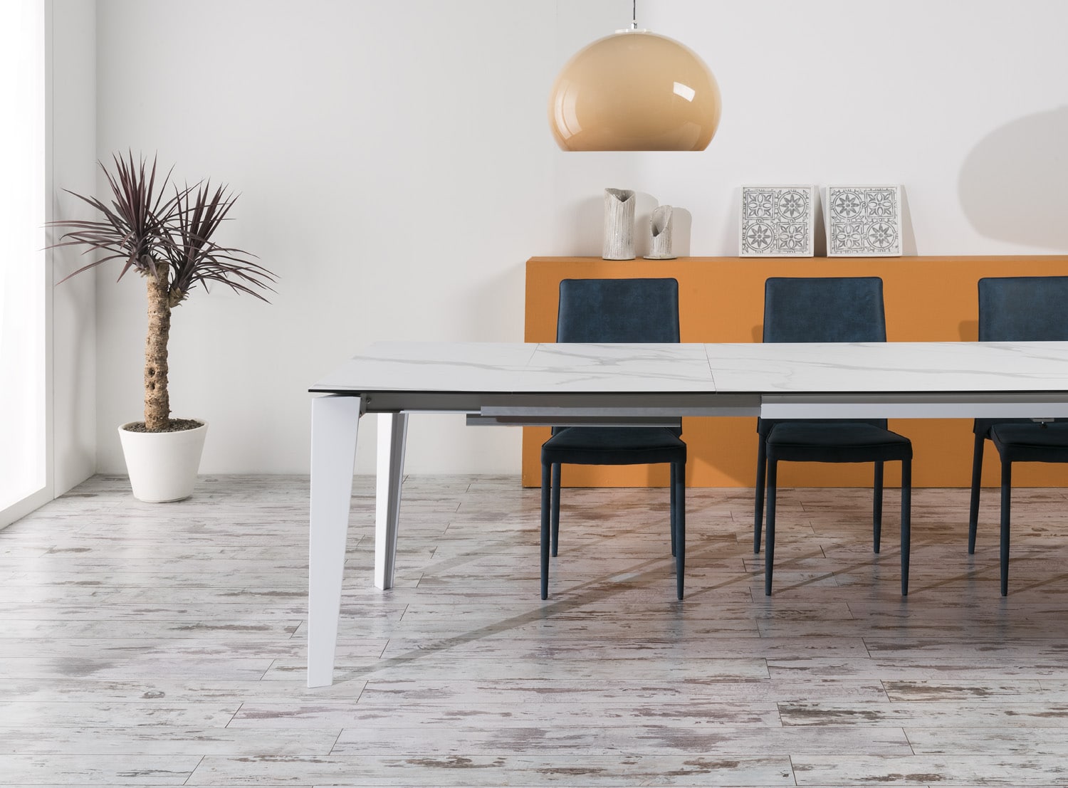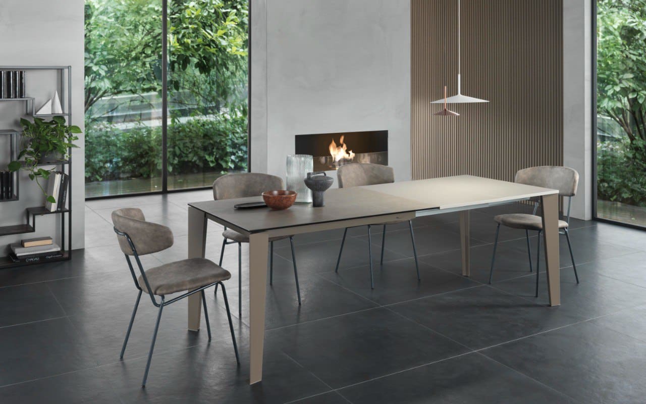Tavolo allungabile lateralmente con piano unico pezzo. Le allunghe sono contenute all’interno del tavolo. Il piano è disponibile in Nobilitato, Laminato, vetro temperato opaco, vetroceramica o impiallacciato in Rovere, inclusa la versione “Rovere Spaccato” (RSP) realizzata in vero legno vecchio. Il sistema di allungo è in alluminio anodizzato. I gambi sono in acciaio verniciato a polvere epossidica e rifiniti con smalti materici, e sono dotati di ruote scorrevoli nel lato di allungo.