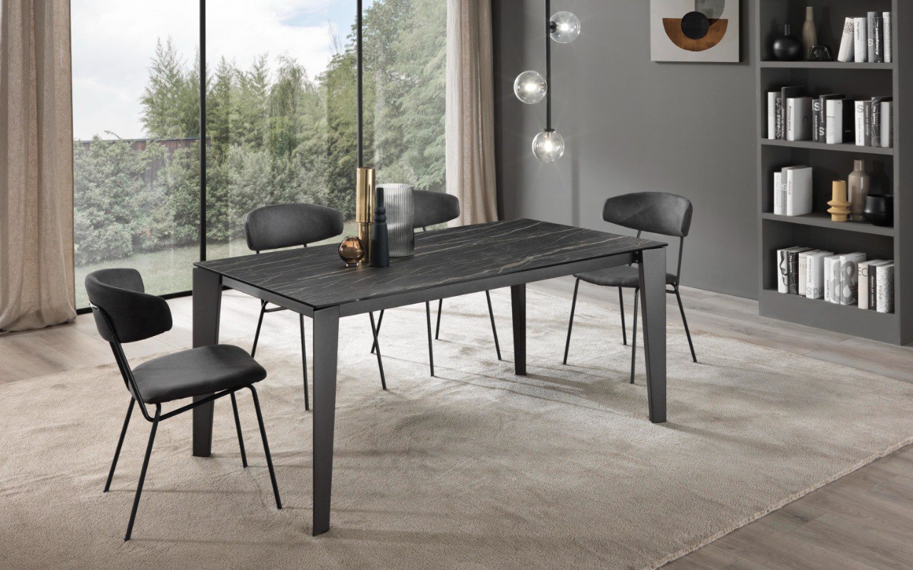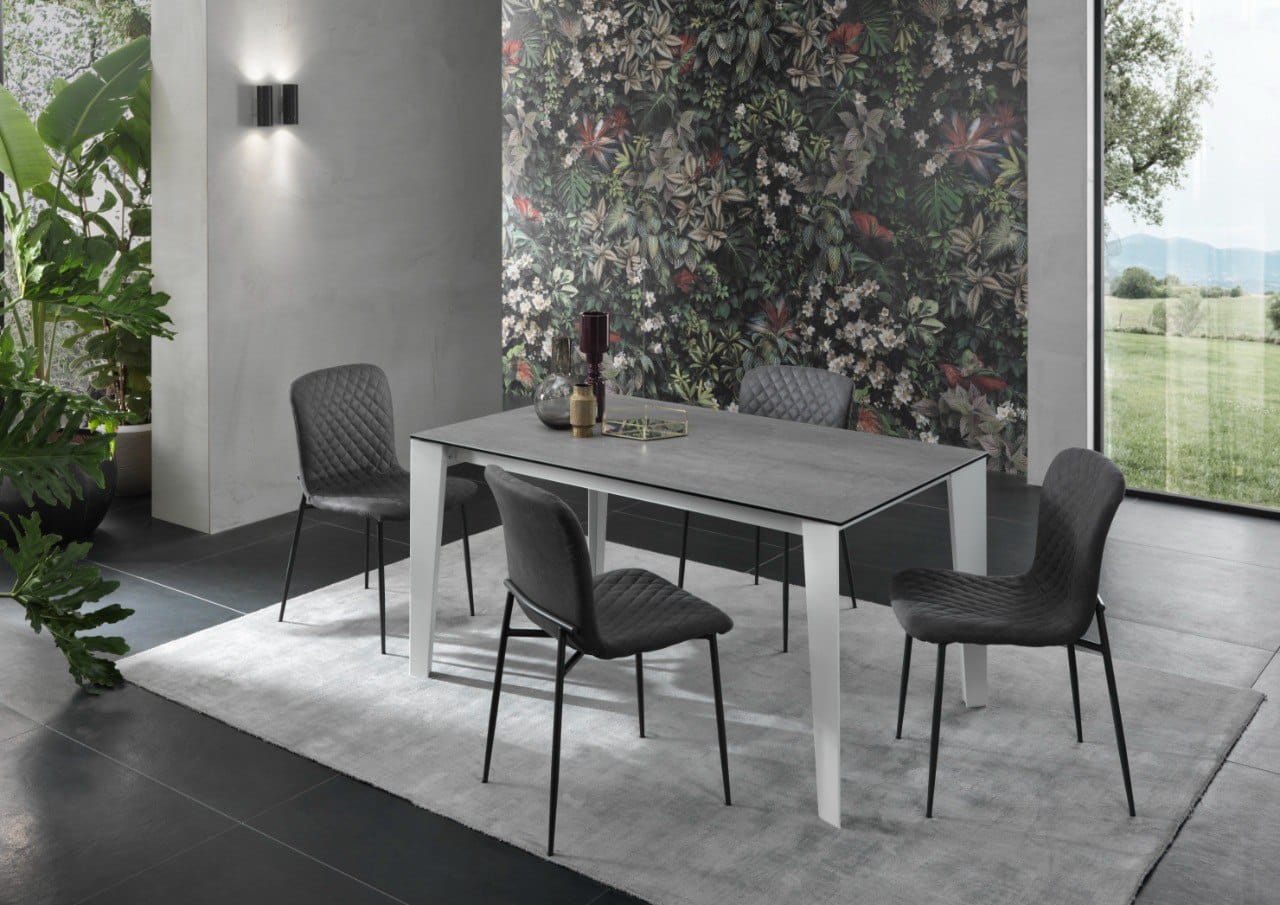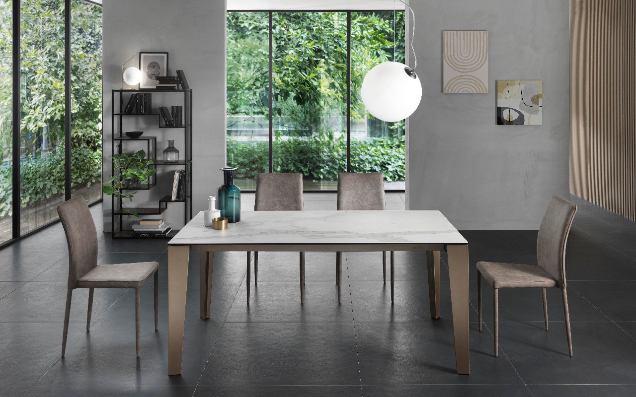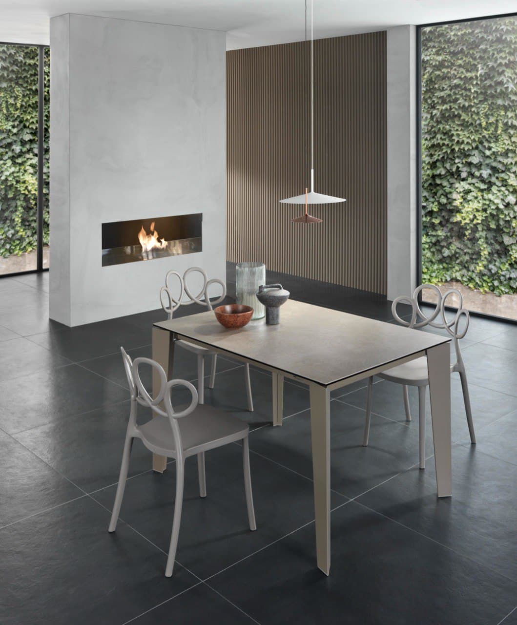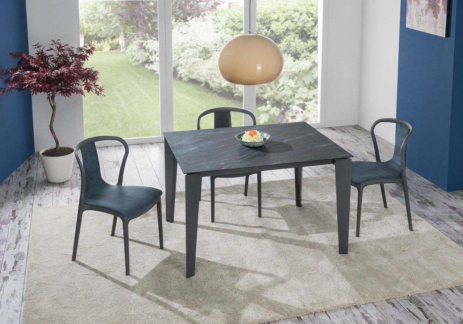 Tavolo allungabile lateralmente con piano unico pezzo. Le allunghe sono contenute all’interno del tavolo. Il piano è disponibile in Nobilitato, Laminato, vetro temperato opaco, vetroceramica o impiallacciato in Rovere, inclusa la versione “Rovere Spaccato” (RSP) realizzata in vero legno vecchio. Il sistema di allungo è in alluminio anodizzato. I gambi sono in acciaio verniciato a polvere epossidica e rifiniti con smalti materici, e sono dotati di ruote scorrevoli nel lato di allungo.