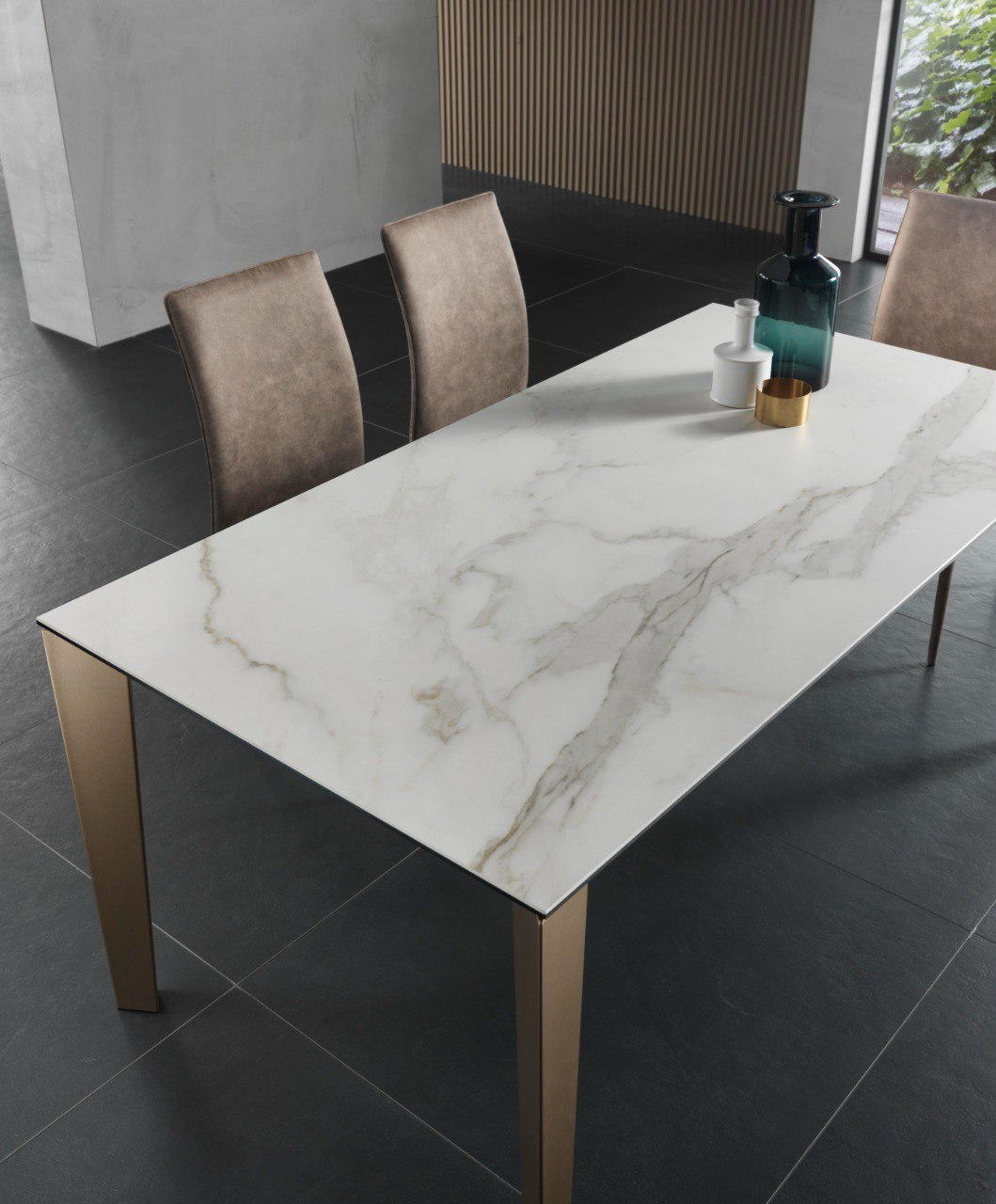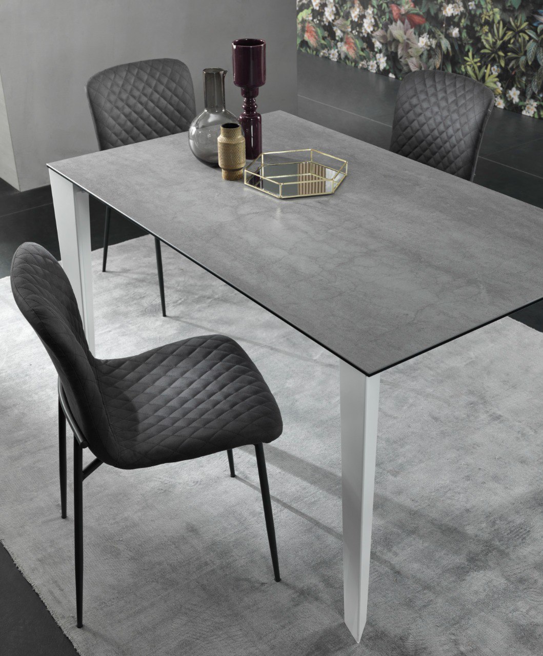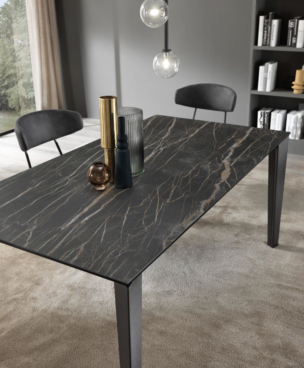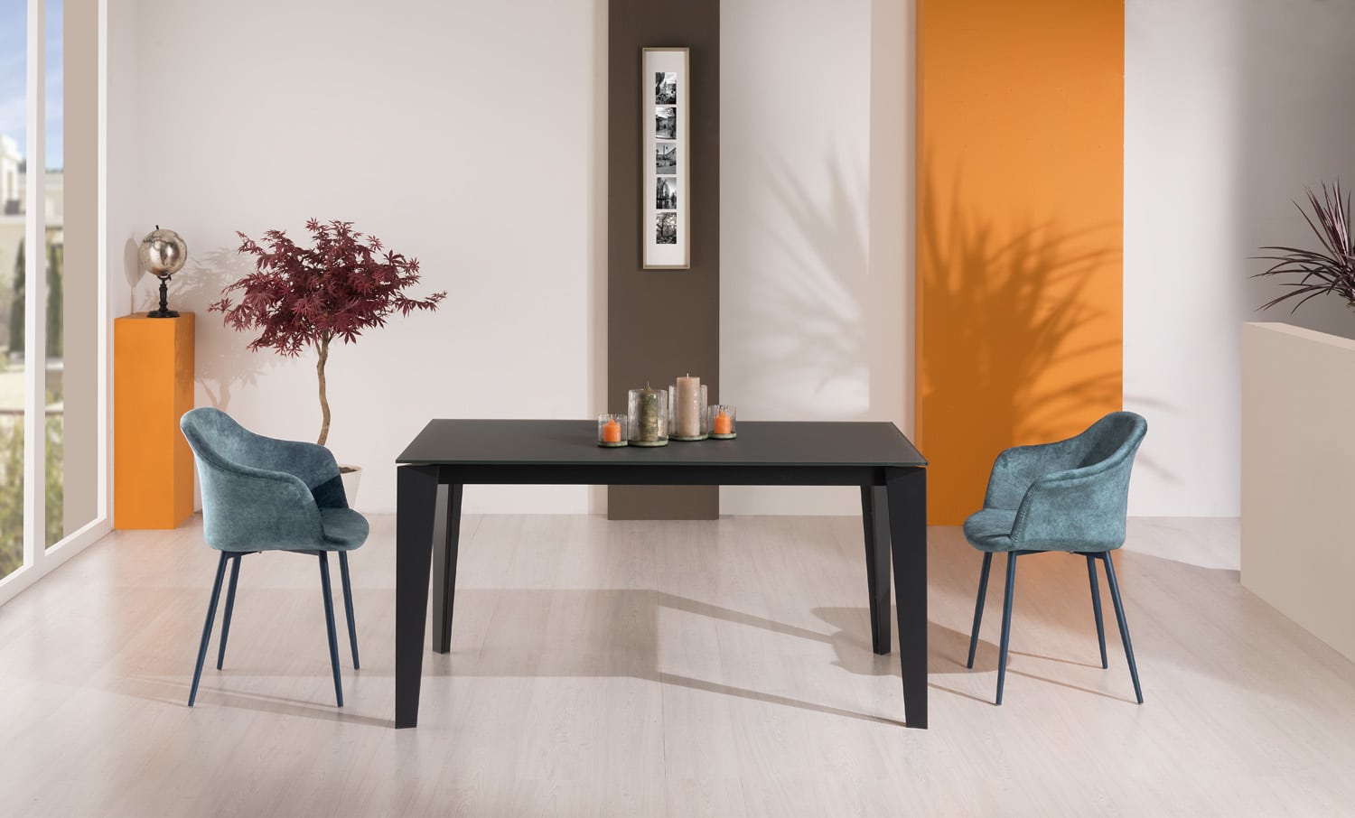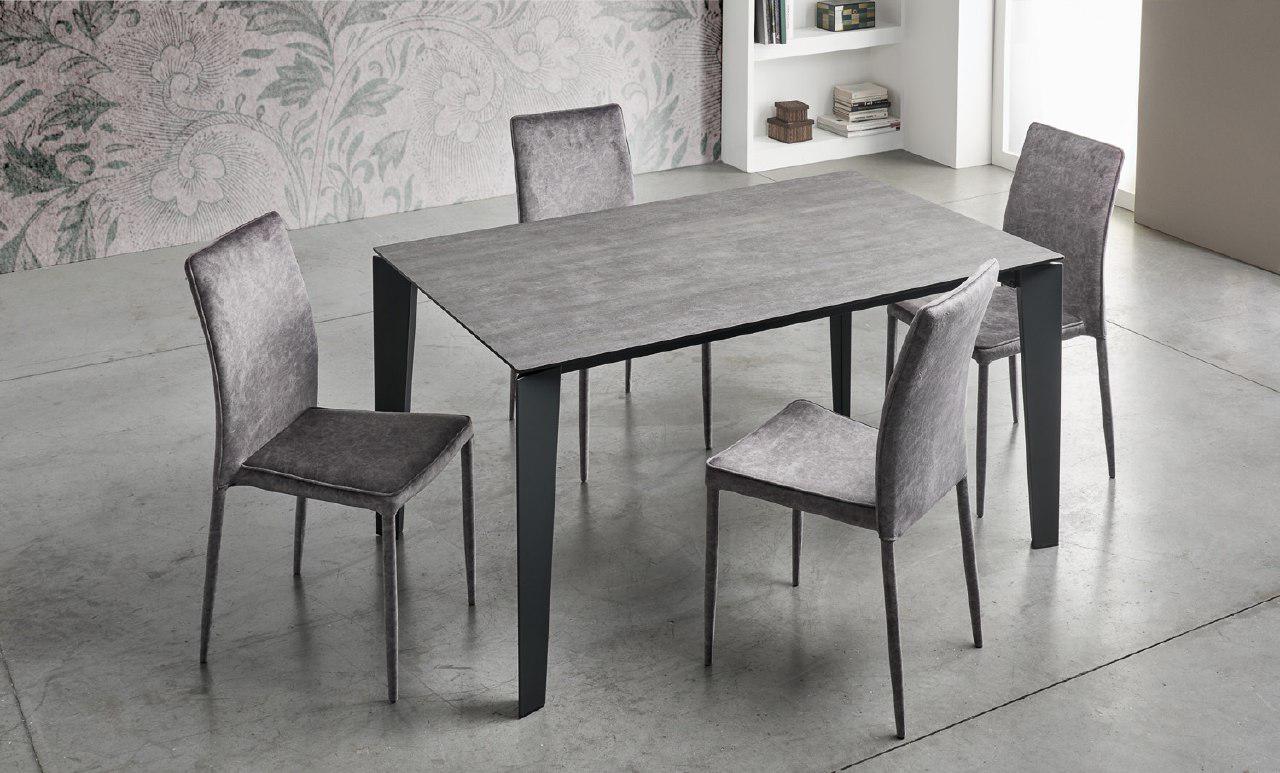Tavolo allungabile lateralmente con piano unico pezzo. Le allunghe sono contenute all’interno del tavolo. Il piano è disponibile in Nobilitato, Laminato, vetro temperato opaco, vetroceramica o impiallacciato in Rovere, inclusa la versione “Rovere Spaccato” (RSP) realizzata in vero legno vecchio. Il sistema di allungo è in alluminio anodizzato. I gambi sono in acciaio verniciato a polvere epossidica e rifiniti con smalti materici, e sono dotati di ruote scorrevoli nel lato di allungo.