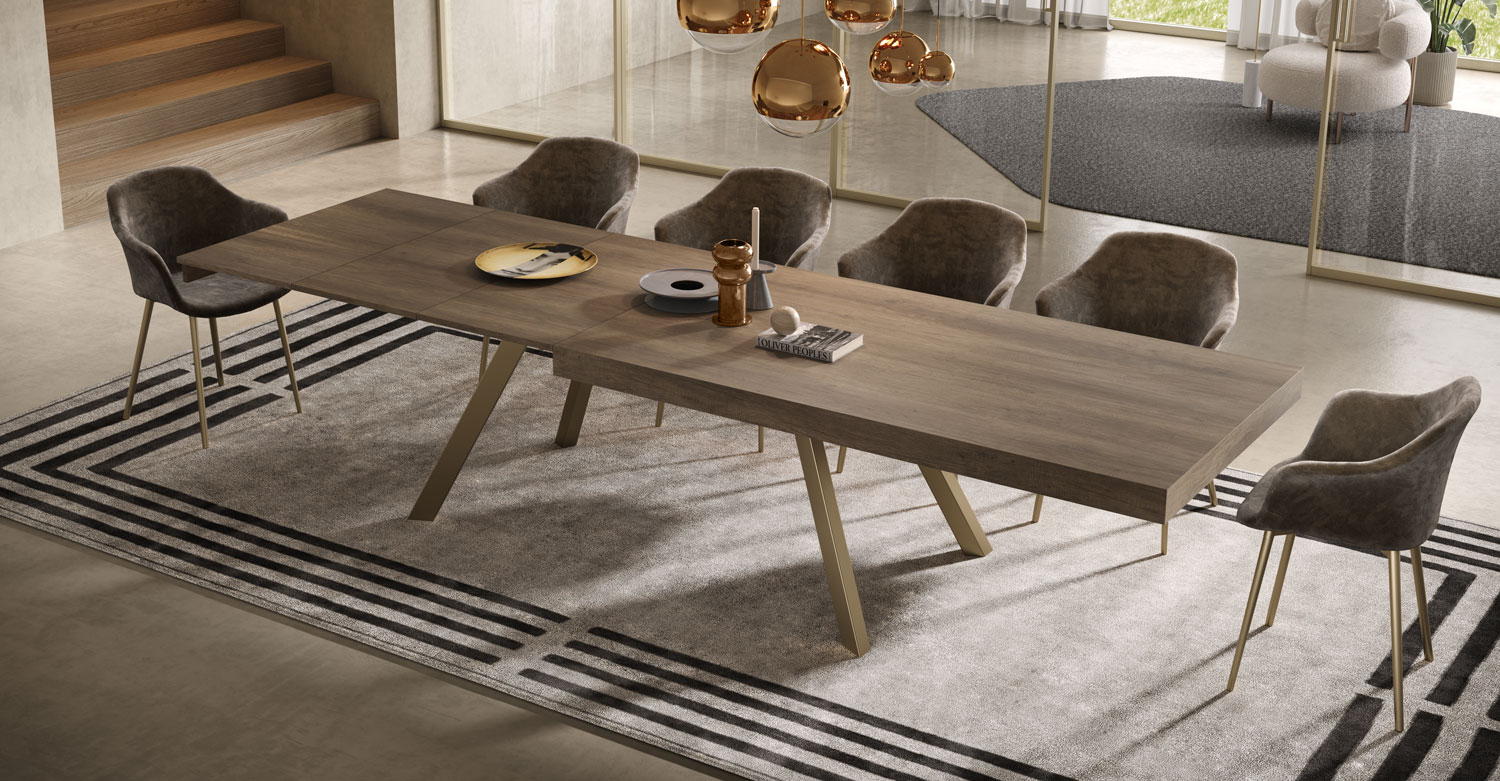 Tavolo allungabile lateralmente da un lato, piano in un unico pezzo a lavorazione “Folding” su tre lati, altezza bordo laterale 90mm, allunghe contenute all’interno del tavolo, piano disponibile in Nobilitato (solo versione 160.31), Laminato o Impiallacciato Rovere, versione “Rovere Spaccato” (RSP) vero legno vecchio; base in metallo, sistema di allungo telescopico sincronizzato interamente in Alluminio, verniciati a polvere epossidica o smalti materici, dotato di piedini regolabili.
