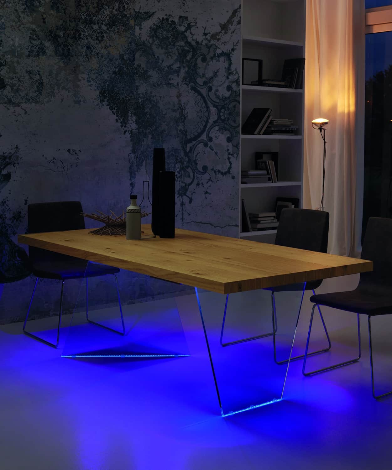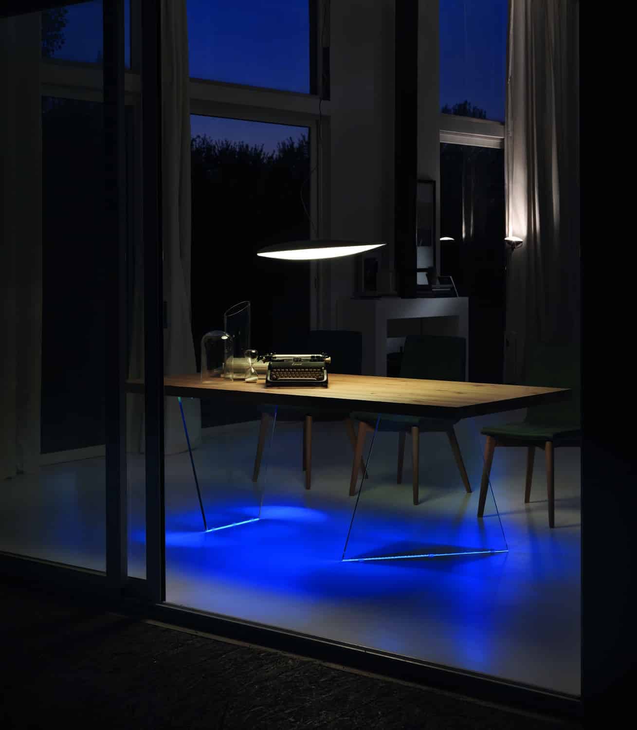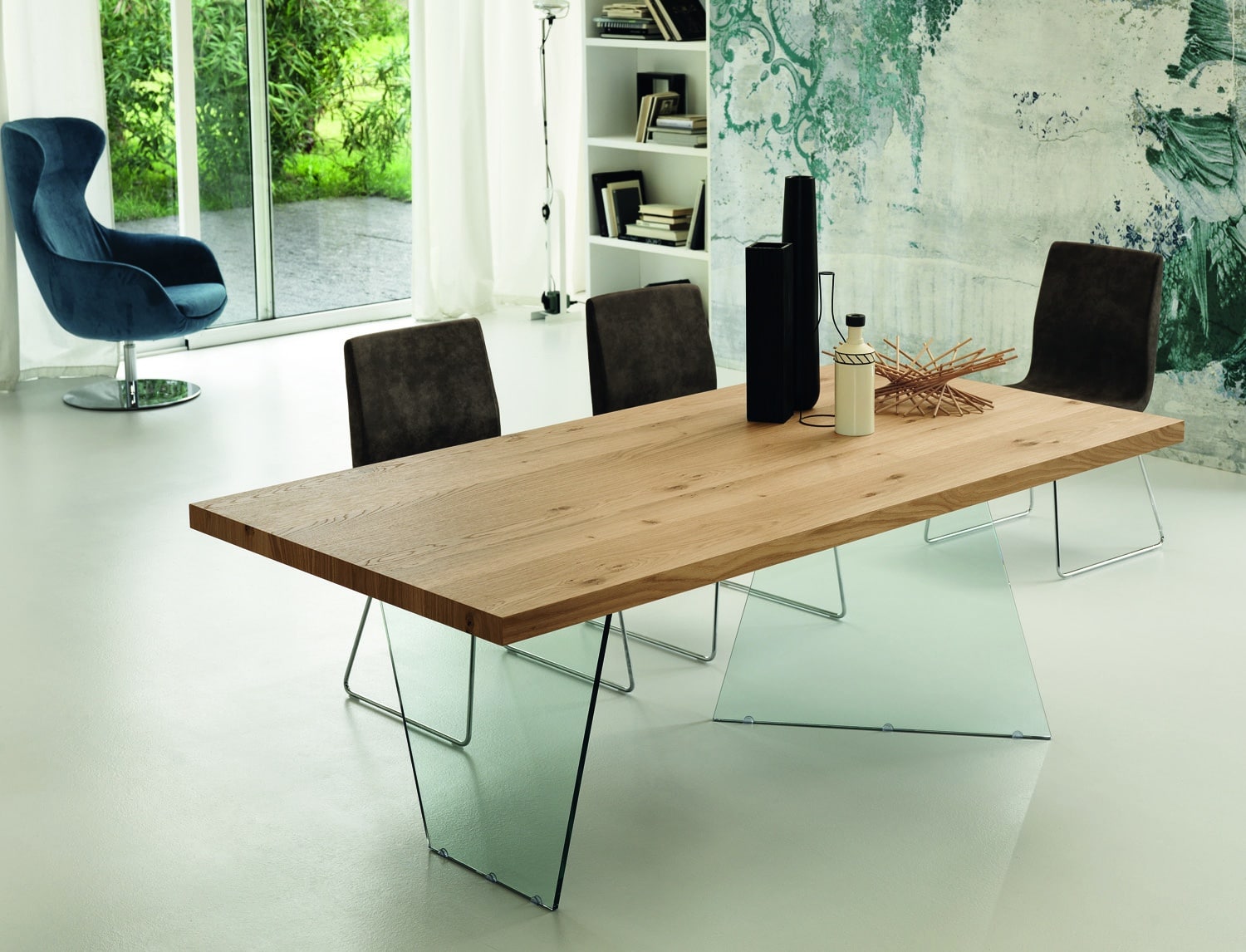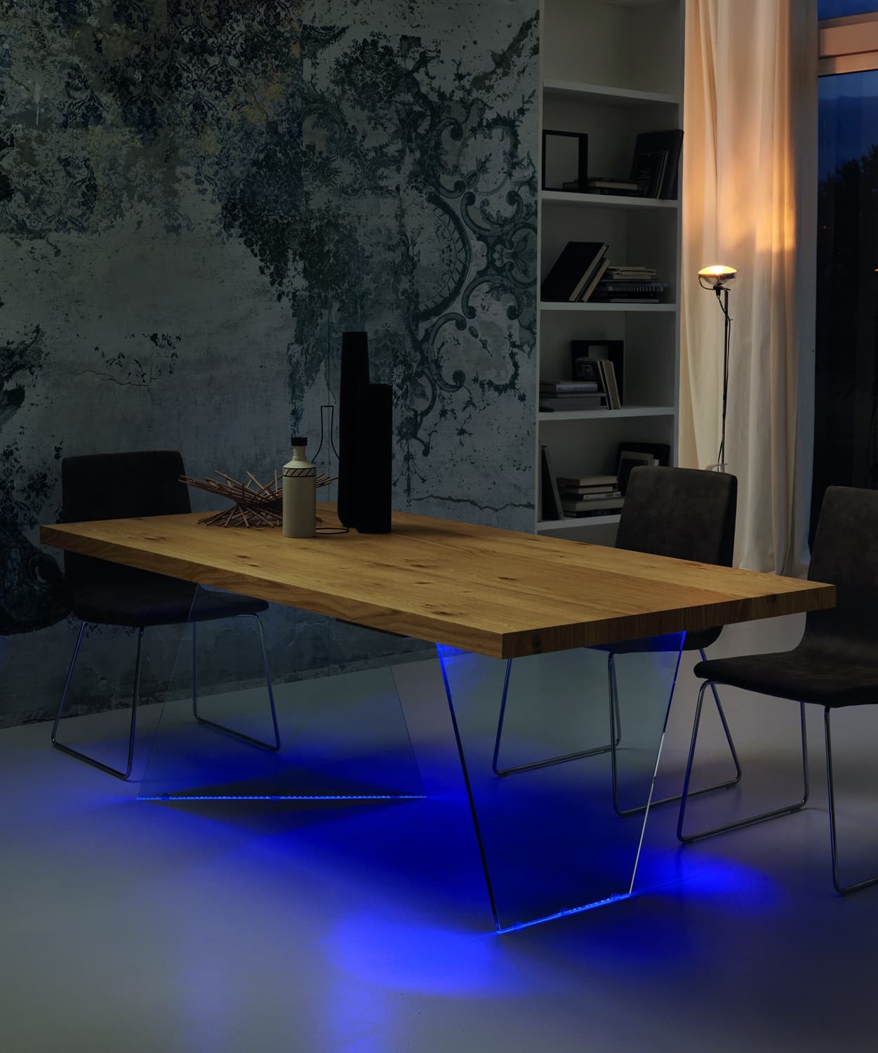 Tavolo LUMIA, fisso, con piano a lavorazione “folding” e bordo laterale di altezza 50 mm. Il piano è disponibile in laminato, impiallacciato in frassino e rovere, inclusa la versione “Rovere Spaccato” (RSP) in vero legno vecchio. I piedi sono realizzati in vetro trasparente di spessore 19 mm con forma trapezoidale. È disponibile un sistema opzionale di luci di cortesia a LED colorati (RGB), alimentati a batteria ricaricabile e comandati tramite telecomando RF multifunzione.