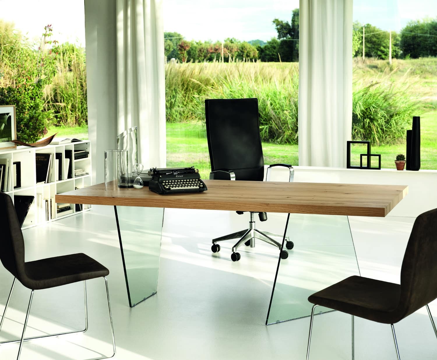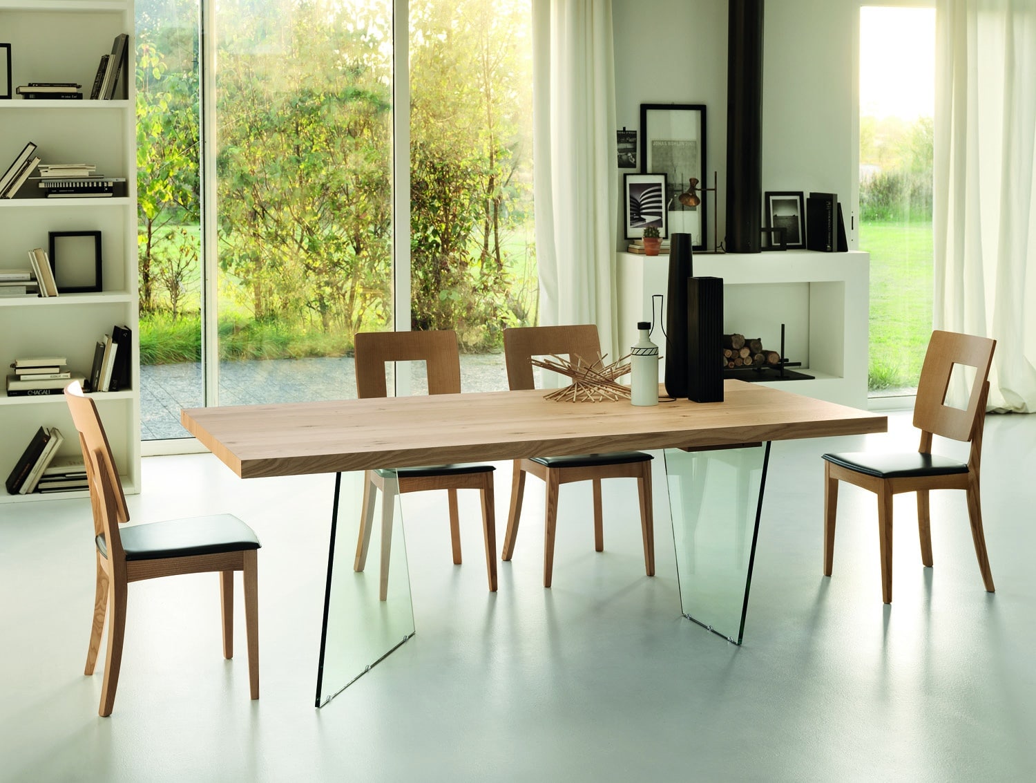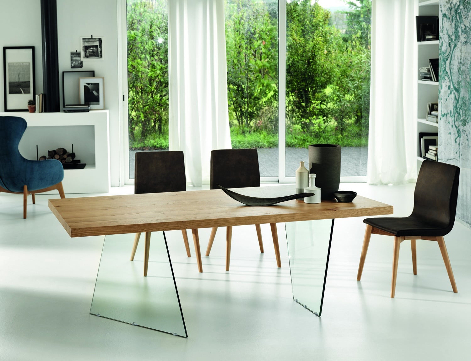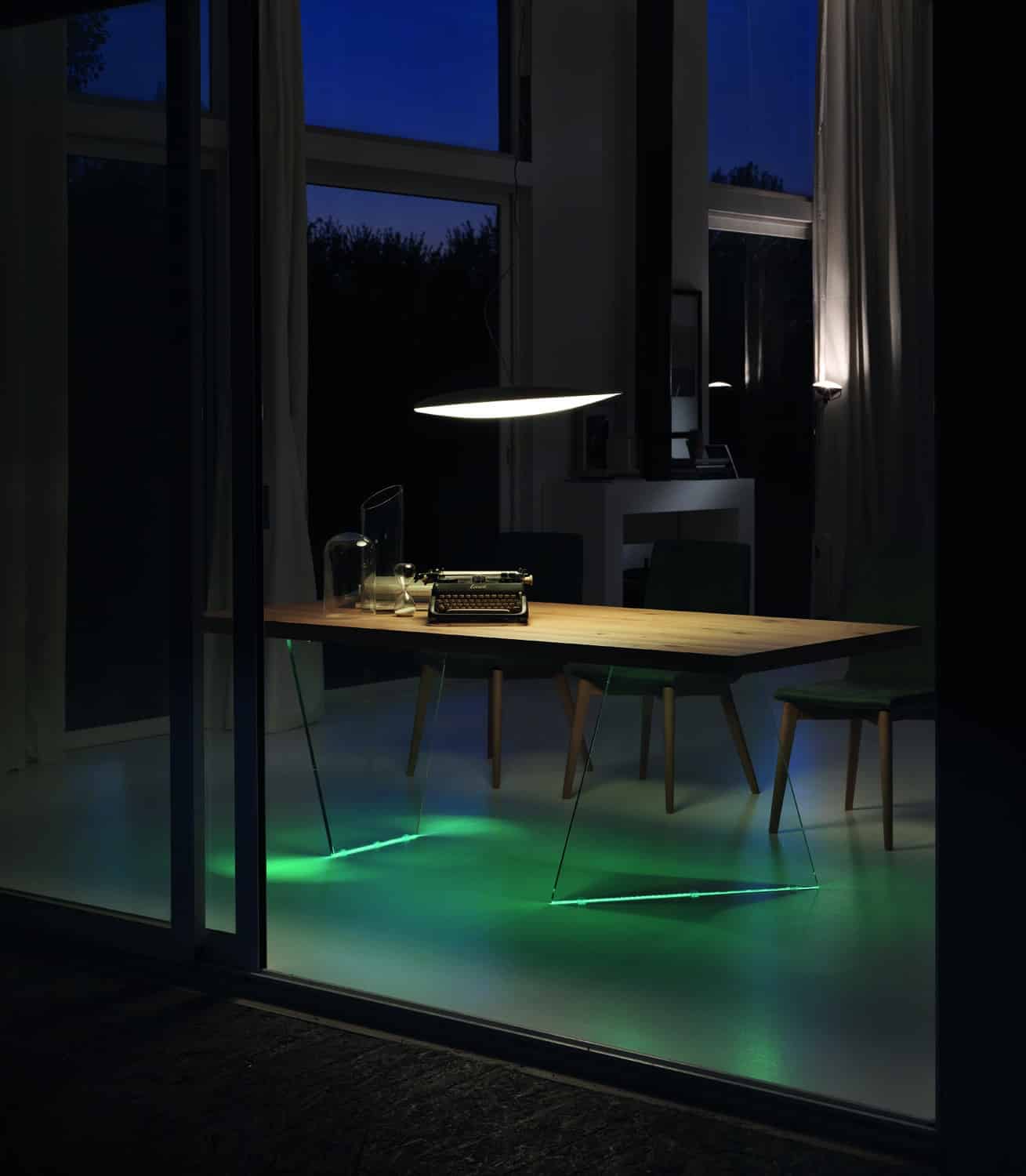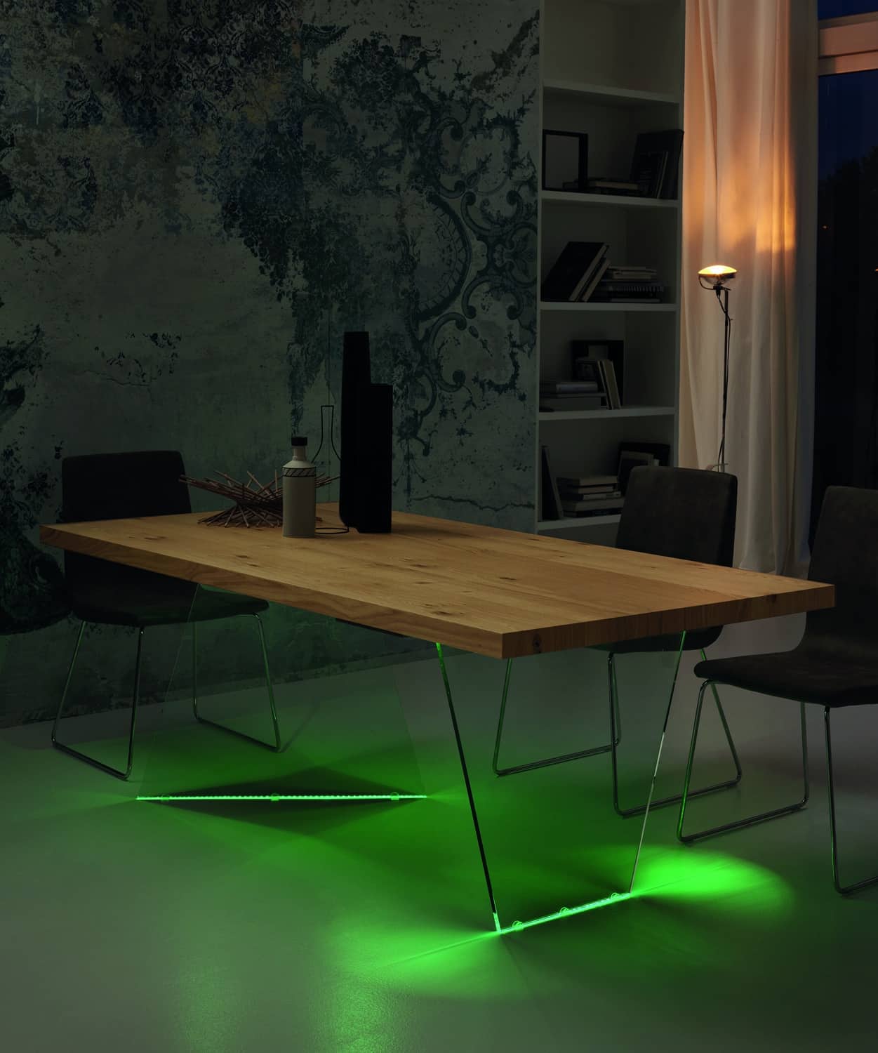 Tavolo LUMIA, fisso, con piano a lavorazione “folding” e bordo laterale di altezza 50 mm. Il piano è disponibile in laminato, impiallacciato in frassino e rovere, inclusa la versione “Rovere Spaccato” (RSP) in vero legno vecchio. I piedi sono realizzati in vetro trasparente di spessore 19 mm con forma trapezoidale. È disponibile un sistema opzionale di luci di cortesia a LED colorati (RGB), alimentati a batteria ricaricabile e comandati tramite telecomando RF multifunzione.
