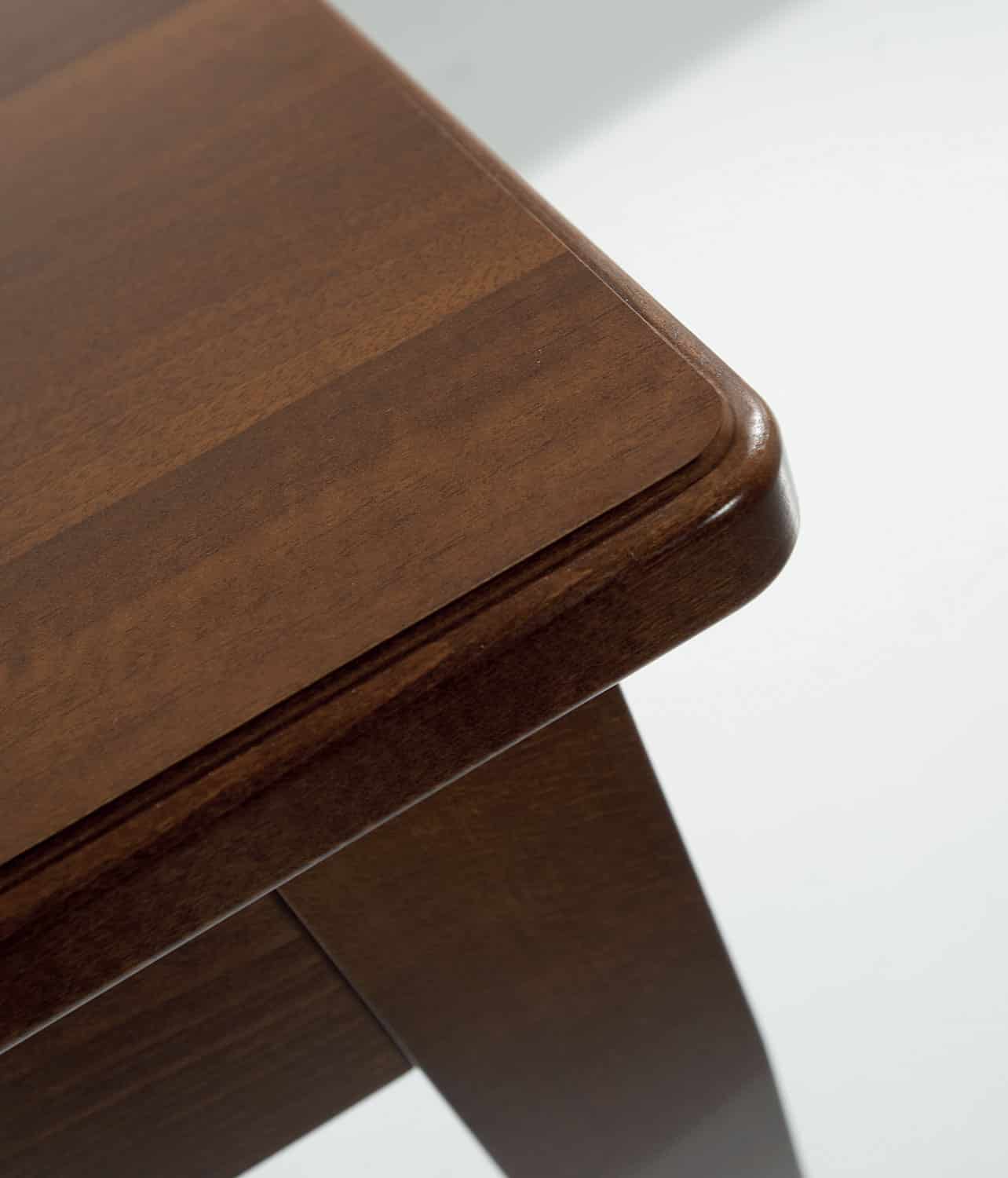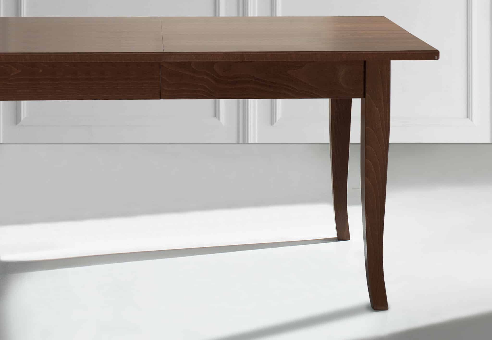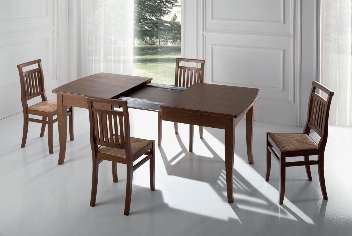 Tavolo allungabile al centro, gambi sempre perimetrali dotati di ruotine di scorrimento; piano spessore 30mm, bordo massello lavorato a becco di civetta disponibile in Laminato o impiallacciato in Frassino; struttura e piedi in legno massiccio meccanismo di allungo sincronizzato in acciaio e alluminio anodizzato, bloccabile in qualsiasi posizione; allunghe contenute all’interno del tavolo.