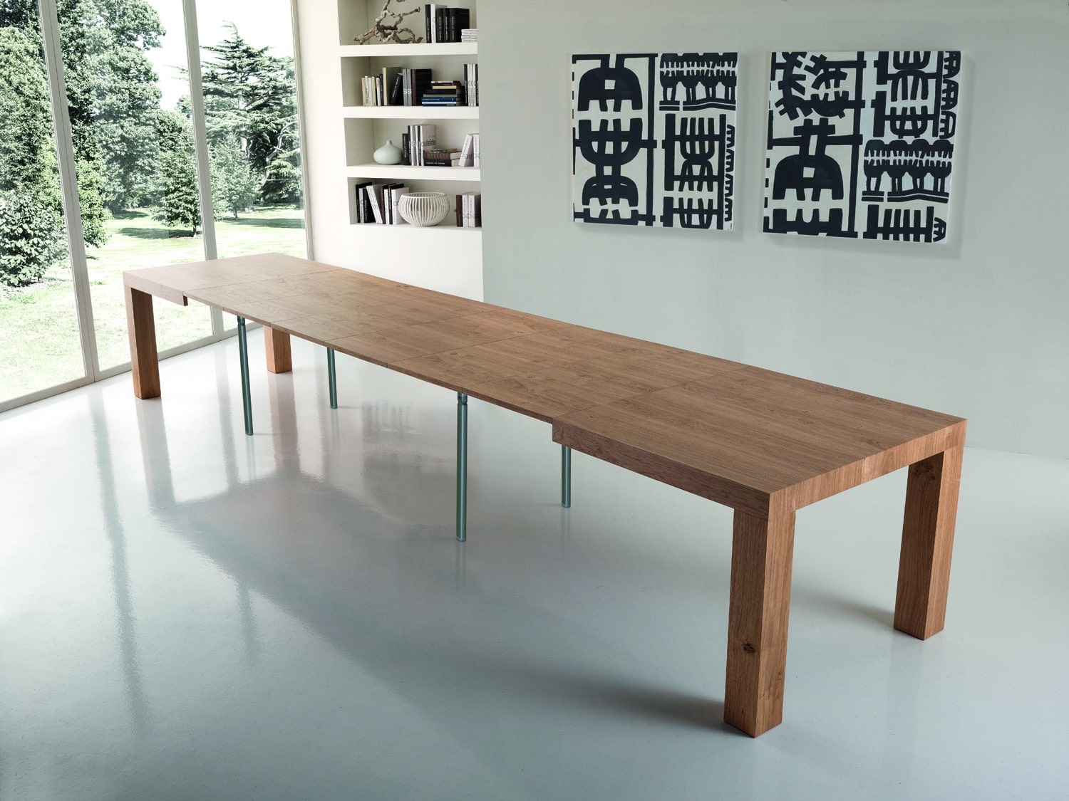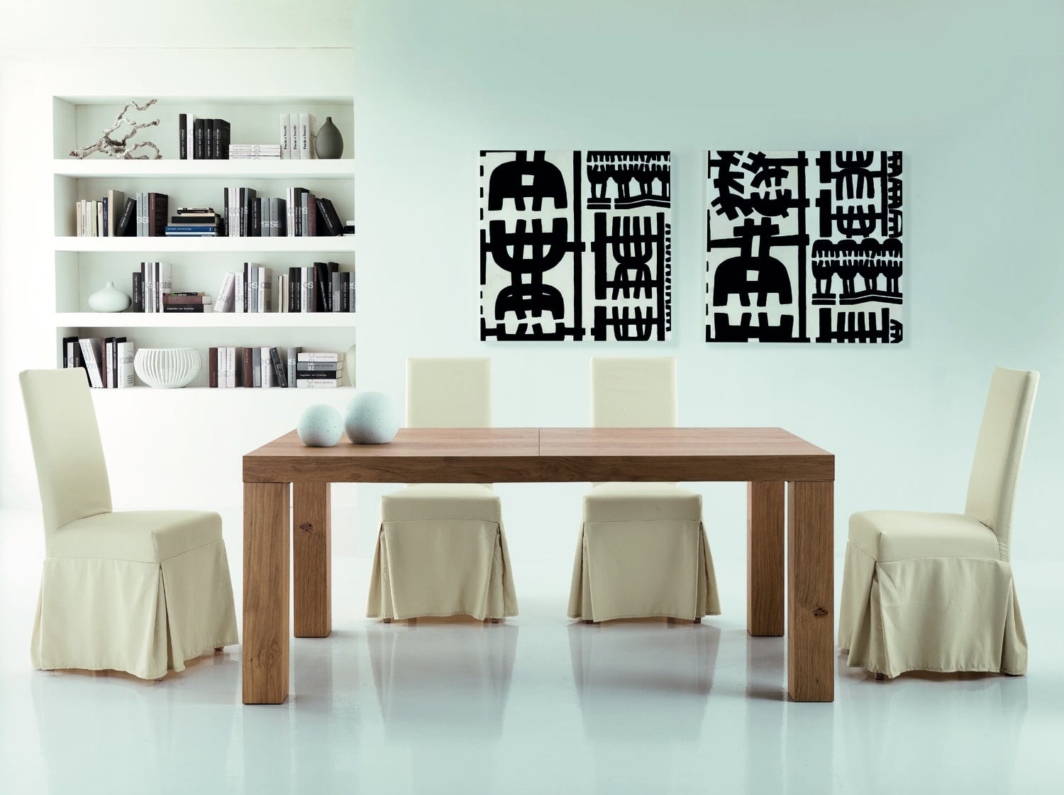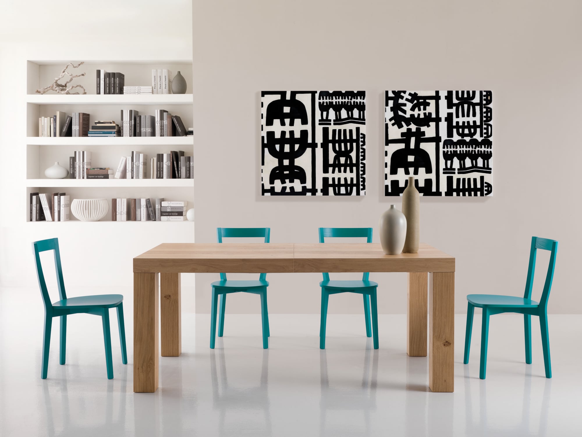 Tavolo fisso o allungabile al centro, con gambi sempre perimetrali. Il piano è lavorato con tecnica “folding” e ha un bordo laterale di 80mm. Piano e allunghe sono disponibili in laminato, impiallacciato in Frassino o in Rovere, con la versione “Rovere Spaccato” (RSP) che rappresenta vero legno vecchio. Il meccanismo di allungo è in alluminio anodizzato e bloccabile in qualsiasi posizione. Le allunghe non sono contenute all’interno del tavolo. I gambi sono in legno massiccio o rivestiti in accordo con la finitura del piano, oppure in acciaio inox. Nella versione allungabile, una coppia di gambi è dotata di ruotino di scorrimento per facilitare l’allungamento (esclusi i gambi in acciaio inox).
