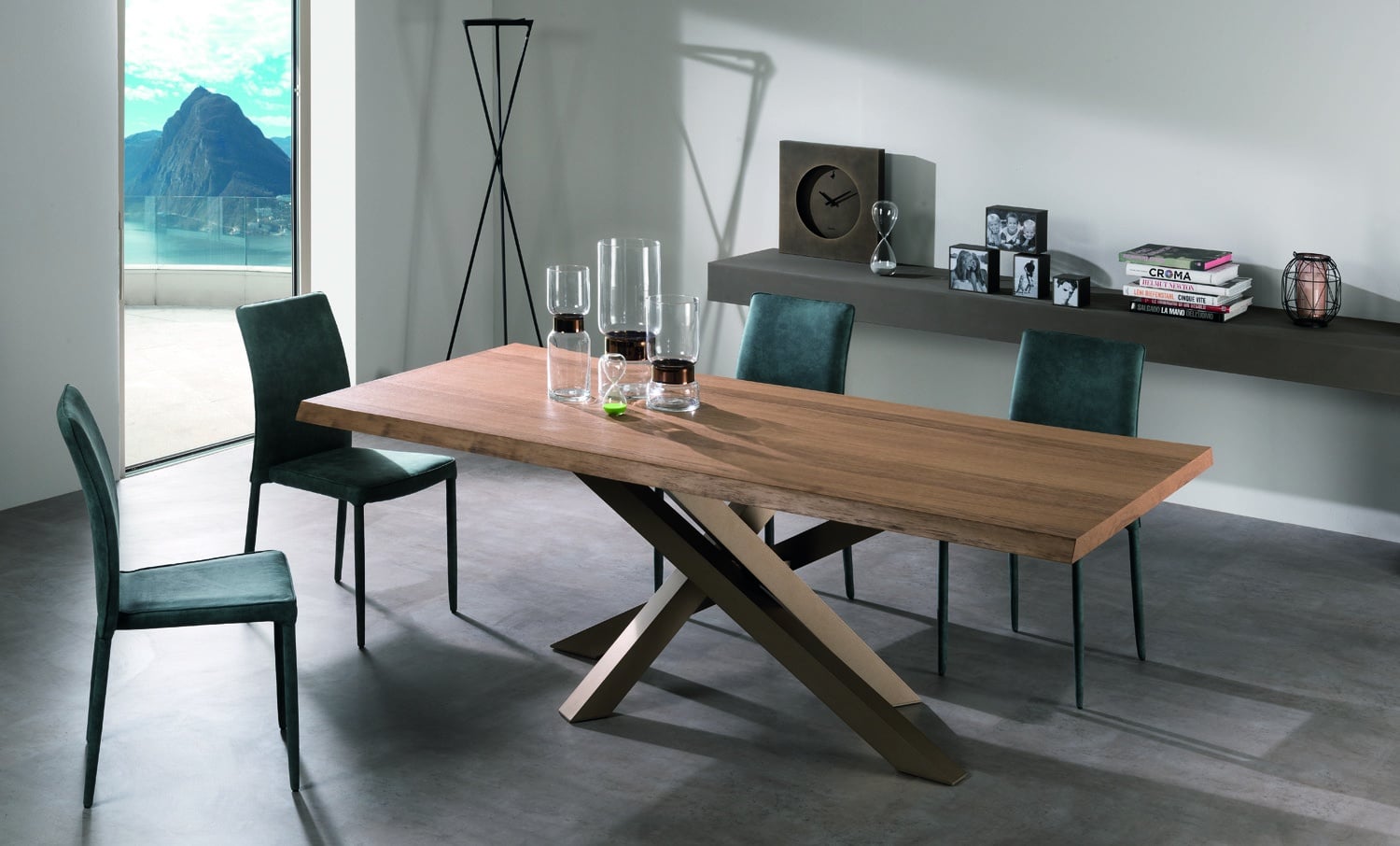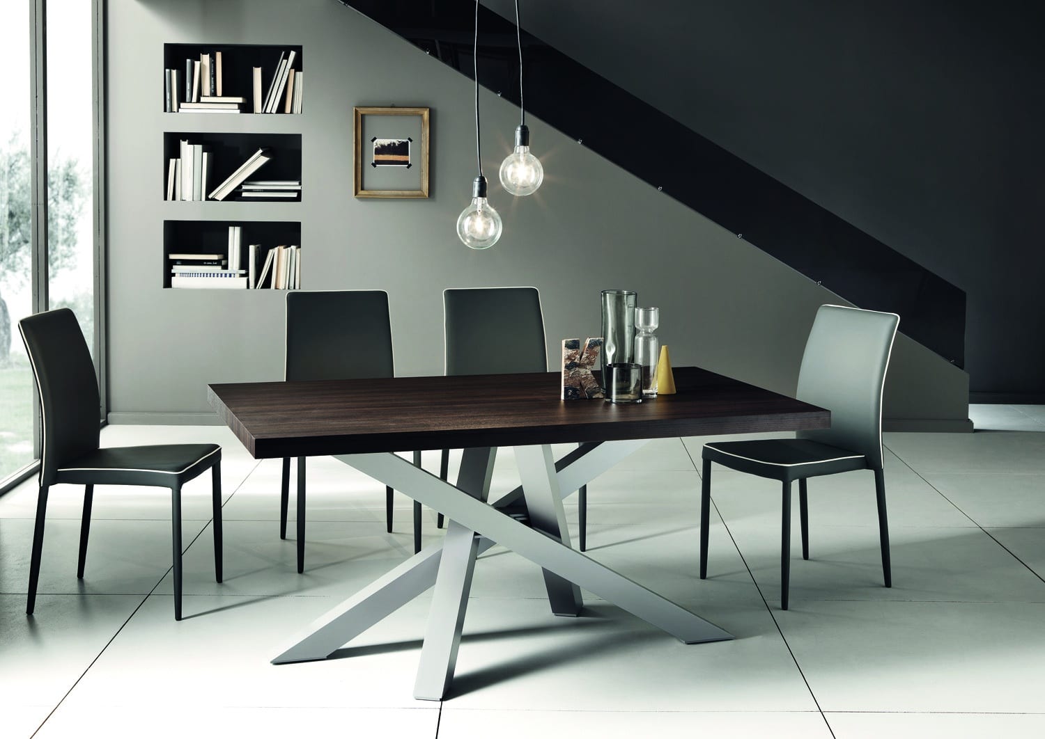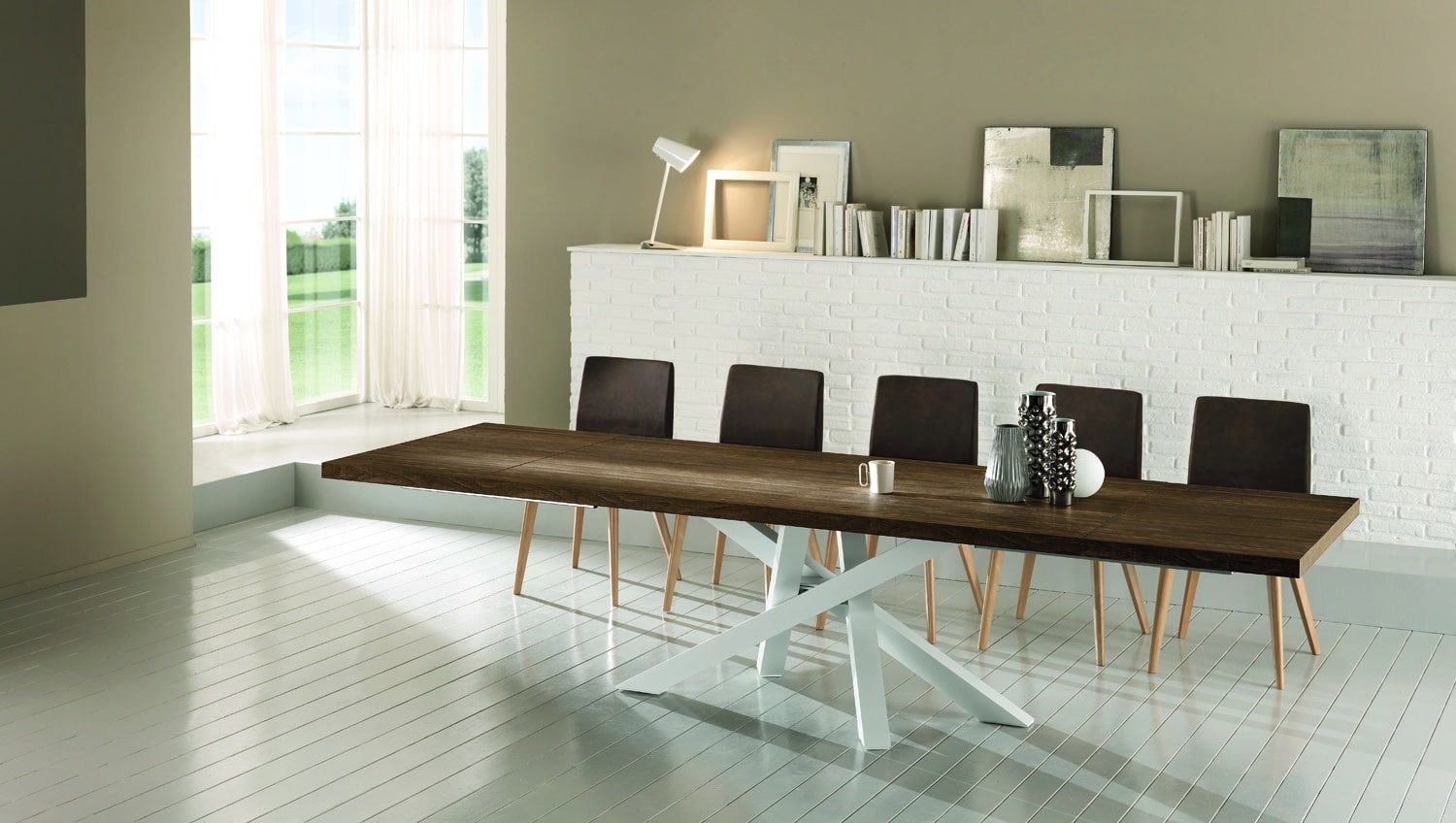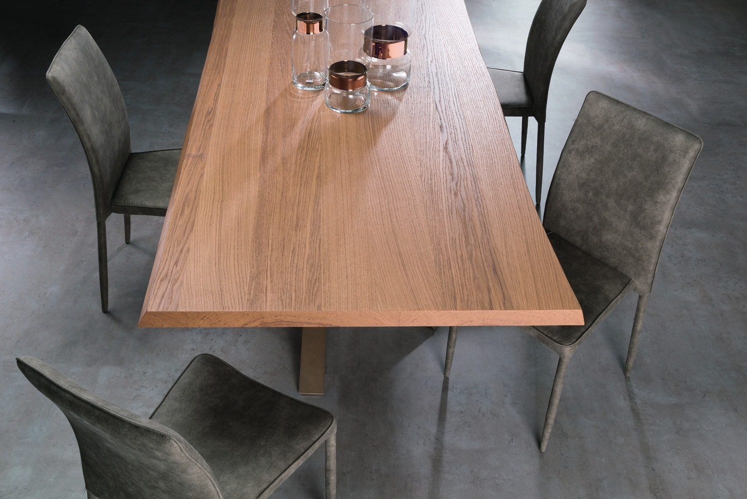 Tavolo QUARK .5, allungabile (A) o fisso (F), con piano a lavorazione “folding” e bordo di altezza laterale di 50 mm. Le allunghe non sono contenute all’interno del tavolo. Il piano è disponibile in Laminato, impiallacciato in Frassino e in Rovere Nodato, inclusa la versione “Rovere Spaccato” (RSP) realizzata in vero legno vecchio. Il sistema di allungo è in alluminio anodizzato, verniciato a polvere epossidica. Il basamento è in alluminio anodizzato, verniciato a polvere epossidica e rifinito con smalti materici, ed è dotato di piedini regolabili.