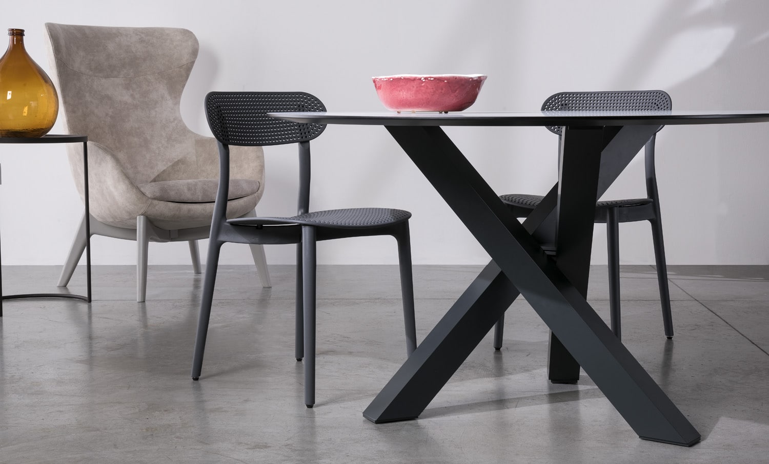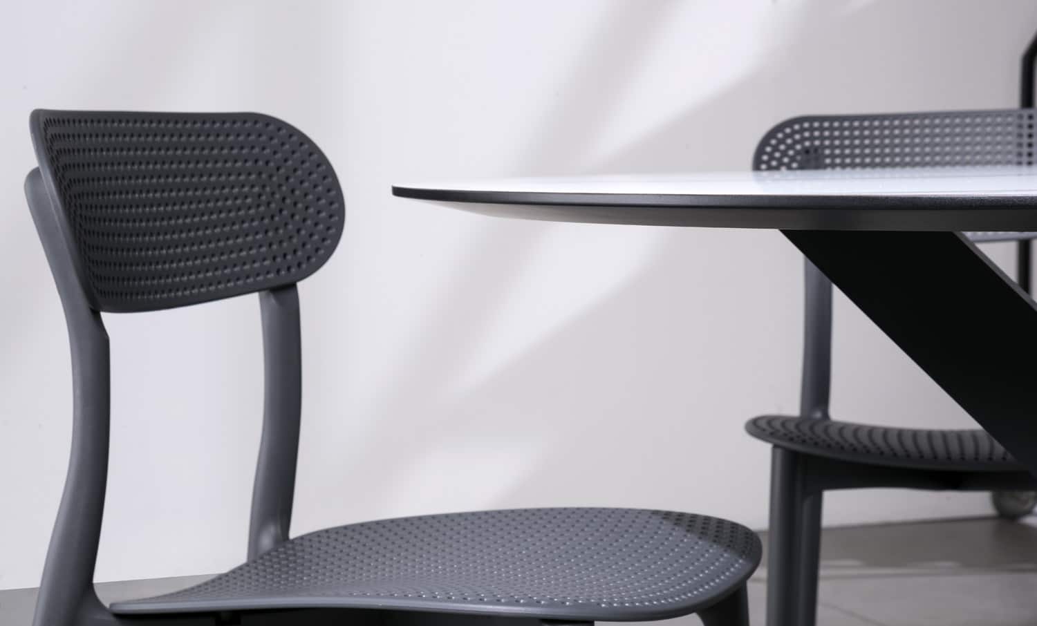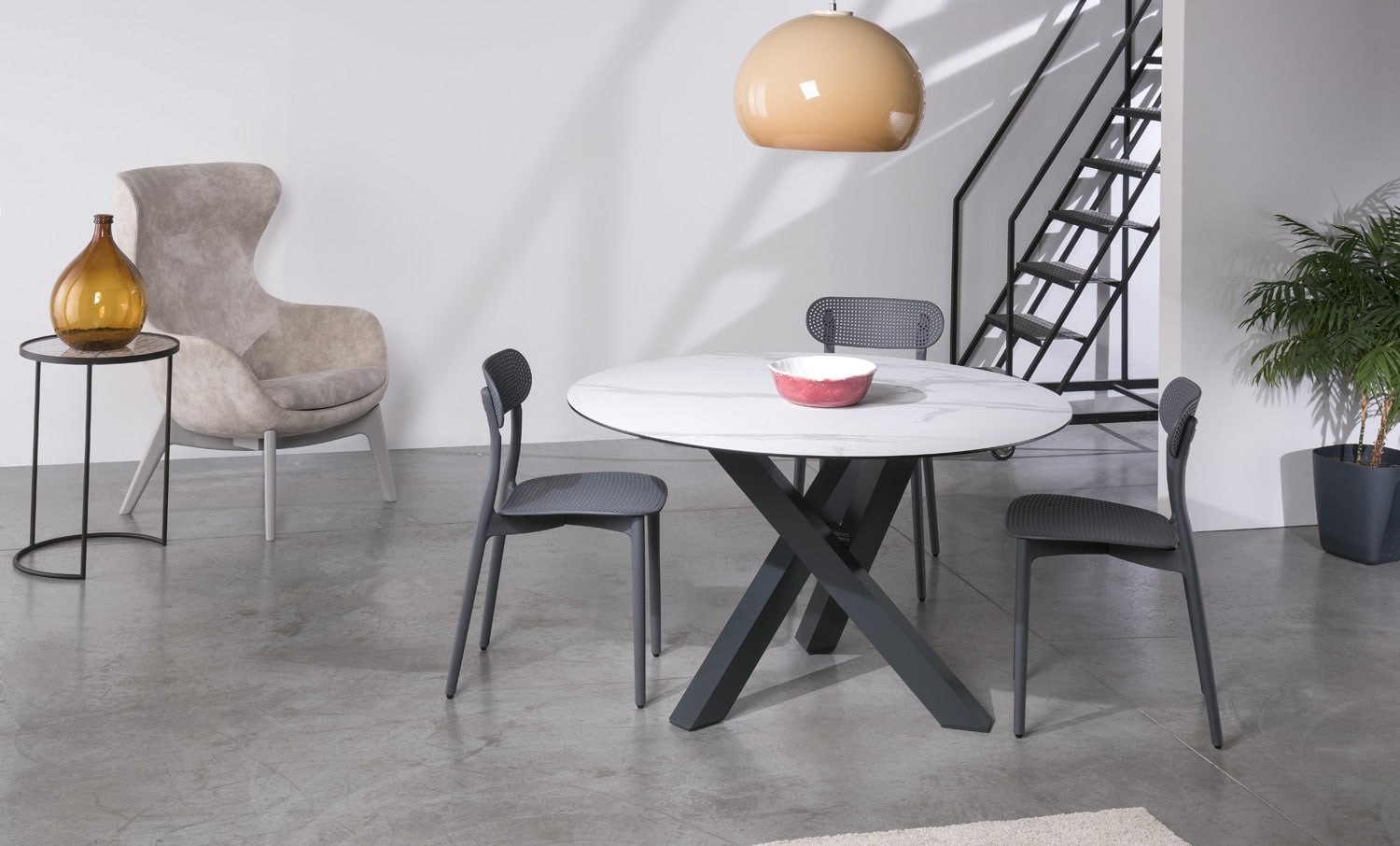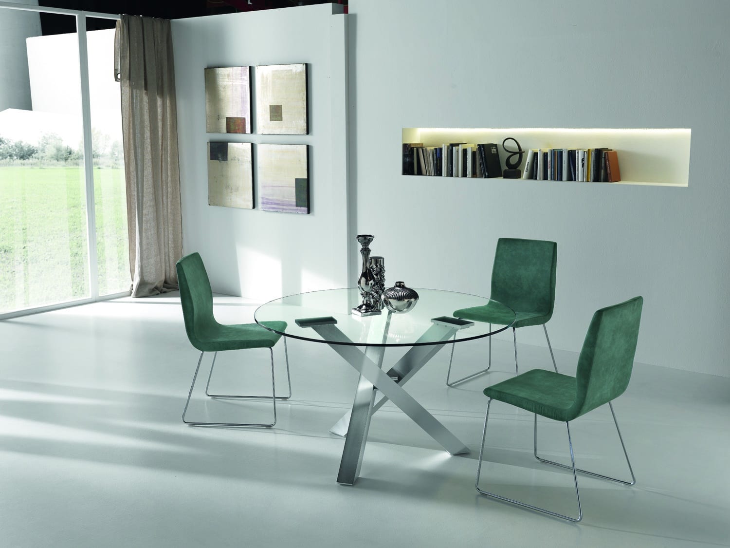 Tavolo fisso con piano rotondo, disponibile in vetro temperato trasparente con spessore di 12 mm, in Laminato o impiallacciato in Rovere, inclusa la versione “Rovere Spaccato” (RSP) realizzata in vero legno vecchio. Il supporto è in MDF tecnologico con spessore di 32 mm e bordo rastremato a 8 mm perimetralmente. Il basamento è un treppiede in alluminio anodizzato, verniciato a polvere epossidica e rifinito con smalti materici, ed è dotato di piedini regolabili.