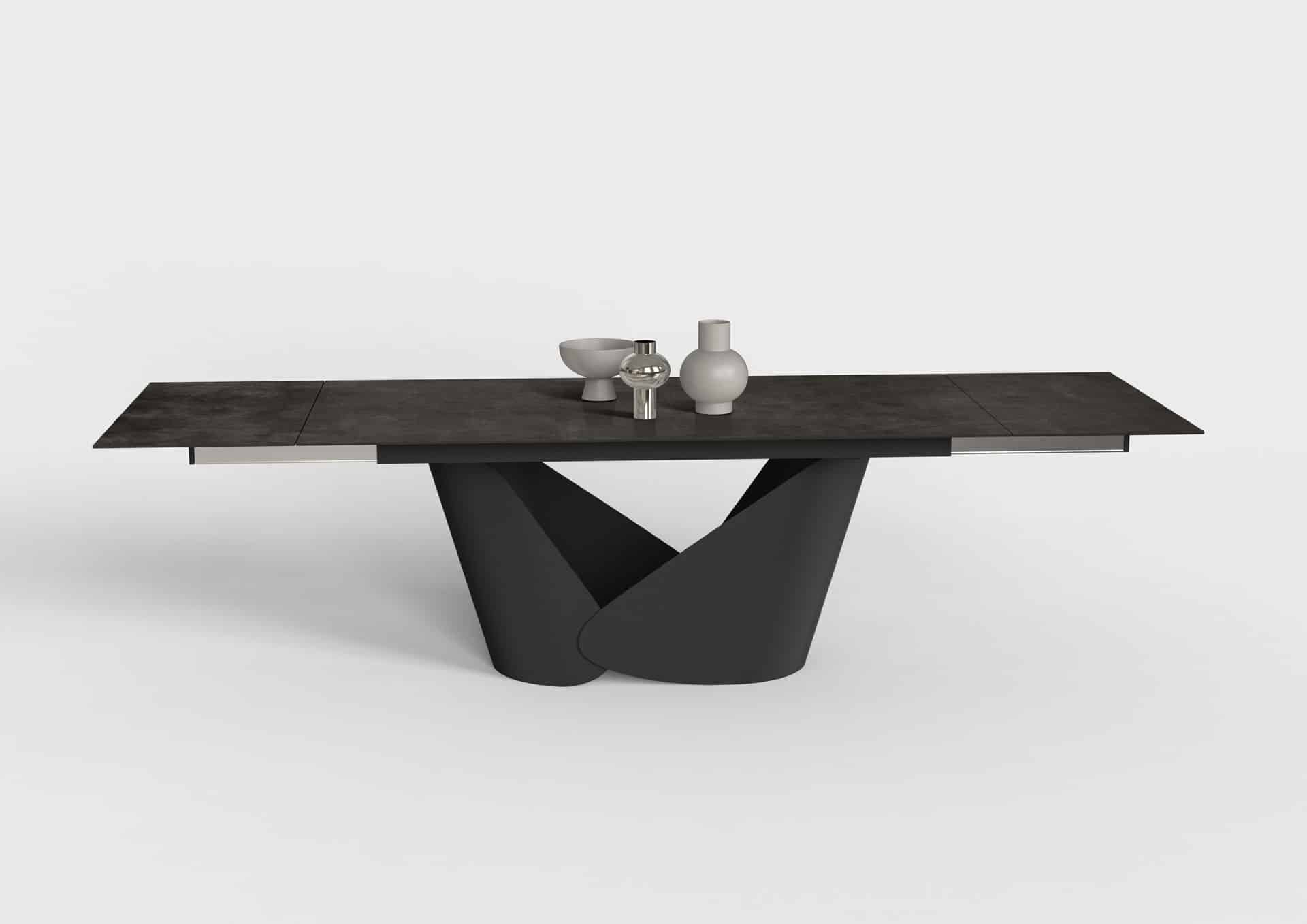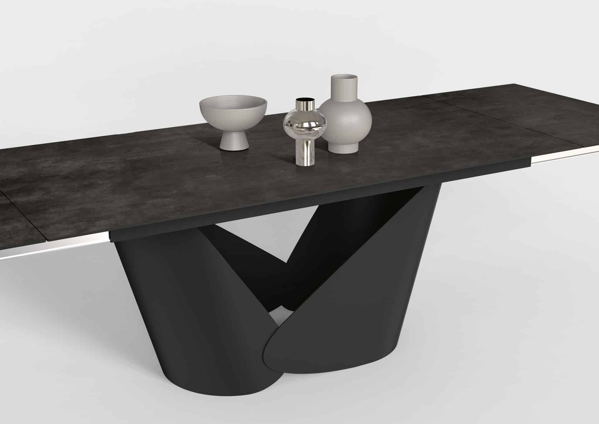 Tavolo con piano Rettangolare, fisso (F) o allungabile bilateralmente (A), piano in HDF supporto tecnologico spessore 32mm o 20mm bordo rastremato a 8mm perimetralmente, disponibile in Laminato o Impiallacciato in Rovere, versione “Rovere Spaccato” (RSP) vero legno vecchio, o in Vetro-Ceramica spessore 11/14mm; meccanismo allungo bilaterale indipendente interamente in alluminio anodizzato con sistema di apertura servo assistito e allunghe solidali allo stesso, basamento in acciaio verniciato a polvere epossidica e o smalti materici, dotato di piedini regolabili.