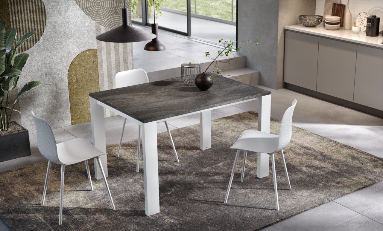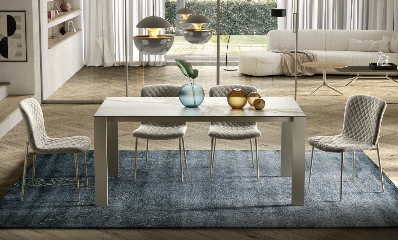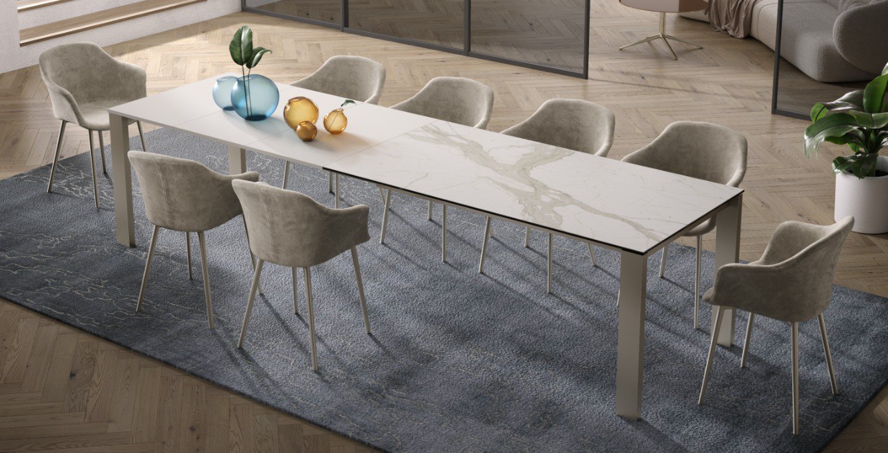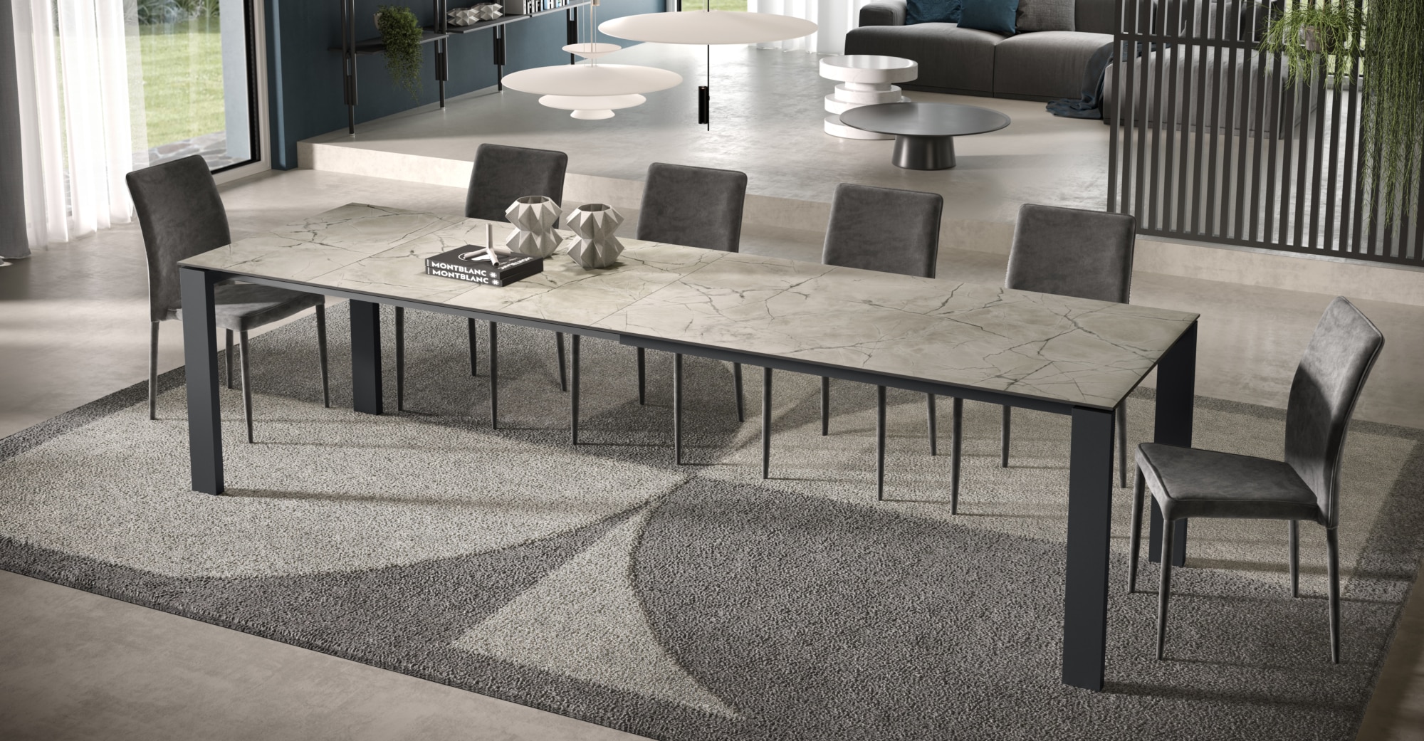 Tavolo allungabile da un lato, con piano in unico pezzo. Le allunghe sono contenute all’interno del tavolo. Il piano è disponibile in Nobilitato, Laminato, Vetro-Ceramica o impiallacciato in Rovere, con la versione “Rovere Spaccato” (RSP) in vero legno vecchio. I gambi sono in metallo, mentre il sistema di allungo telescopico è interamente realizzato in Alluminio anodizzato, verniciato a polvere epossidica o smalto materico. Inoltre, i gambi sono dotati di ruote scorrevoli sul lato di allungo.