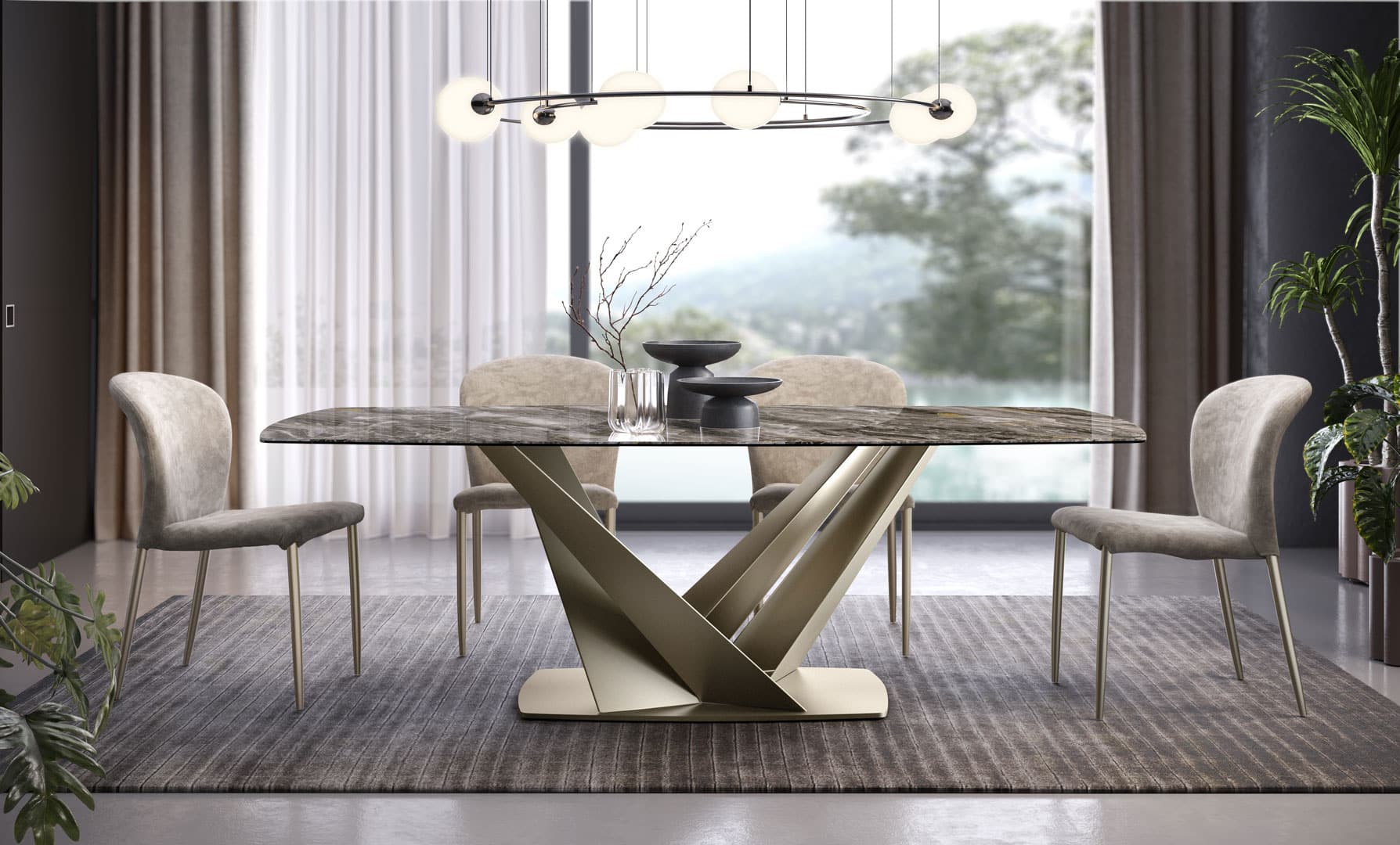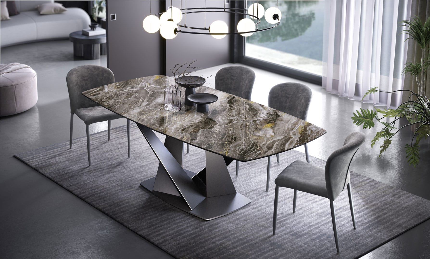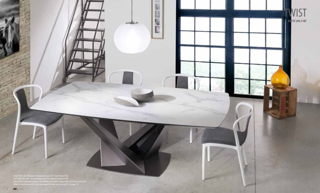 Tavolo fisso o allungabile con piano arrotondato a “BOTTE”. Le allunghe non sono contenute all’interno del tavolo. Il piano è disponibile in Laminato o impiallacciato in Rovere, con la versione “Rovere Spaccato” (RSP) realizzata in vero legno vecchio. Il supporto è in MDF tecnologico con spessore di 32 mm e bordo rastremato a 8 mm perimetralmente. Il basamento è in acciaio verniciato a polvere epossidica e rifinito con smalti materici.