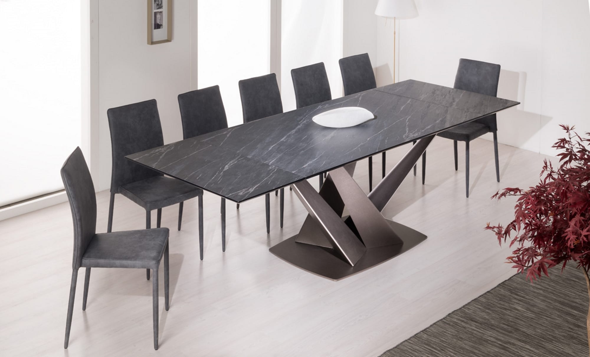Tavolo con piano rettangolare fisso o allungabile. Le allunghe non sono contenute all’interno del tavolo. Il piano è disponibile in Laminato o impiallacciato in Rovere, con la versione “Rovere Spaccato” (RSP) realizzata in vero legno vecchio. Il supporto è in MDF tecnologico con spessore di 32 mm e bordo rastremato a 8 mm perimetralmente. Il basamento è in acciaio verniciato a polvere epossidica e rifinito con smalti materici.