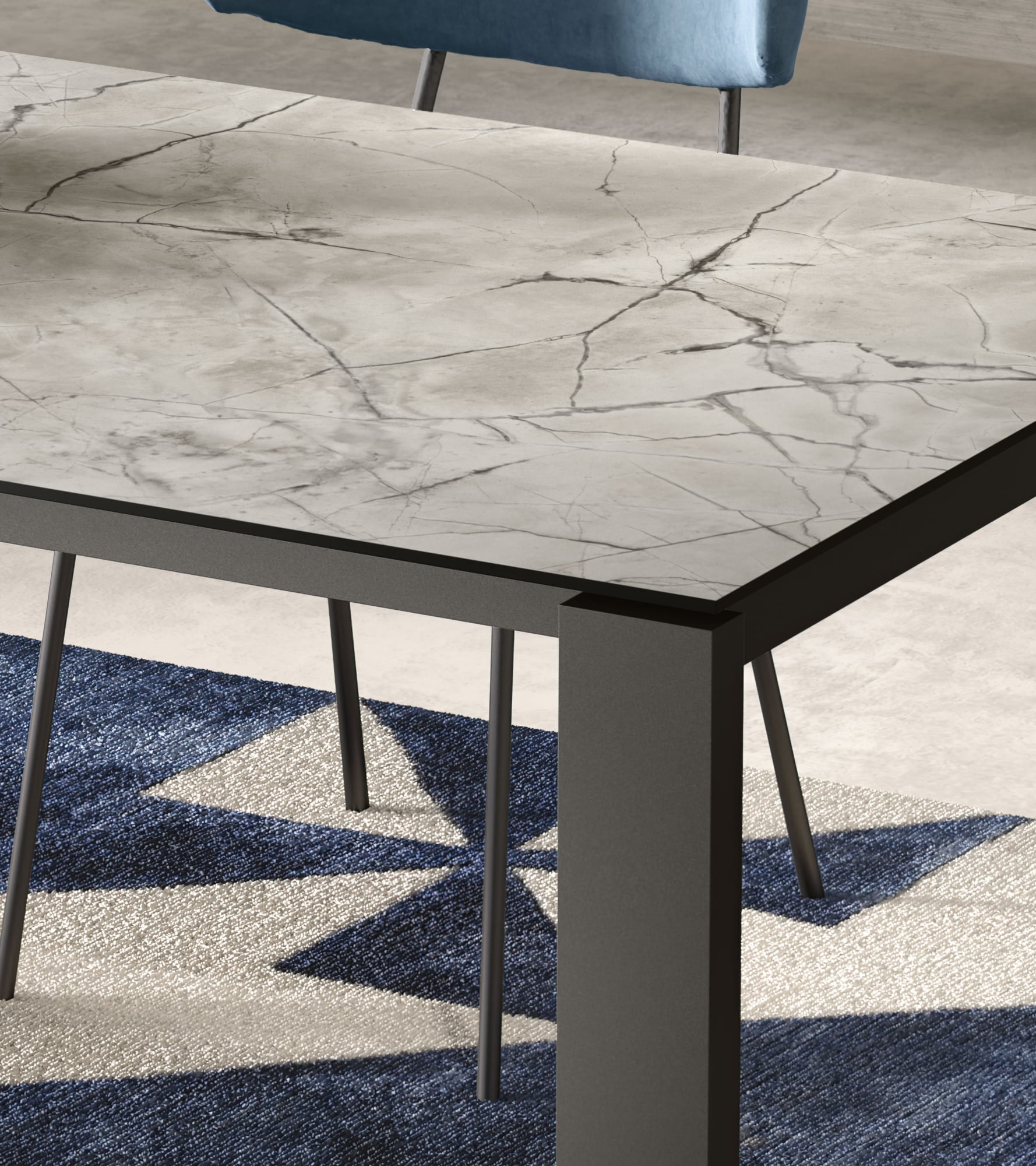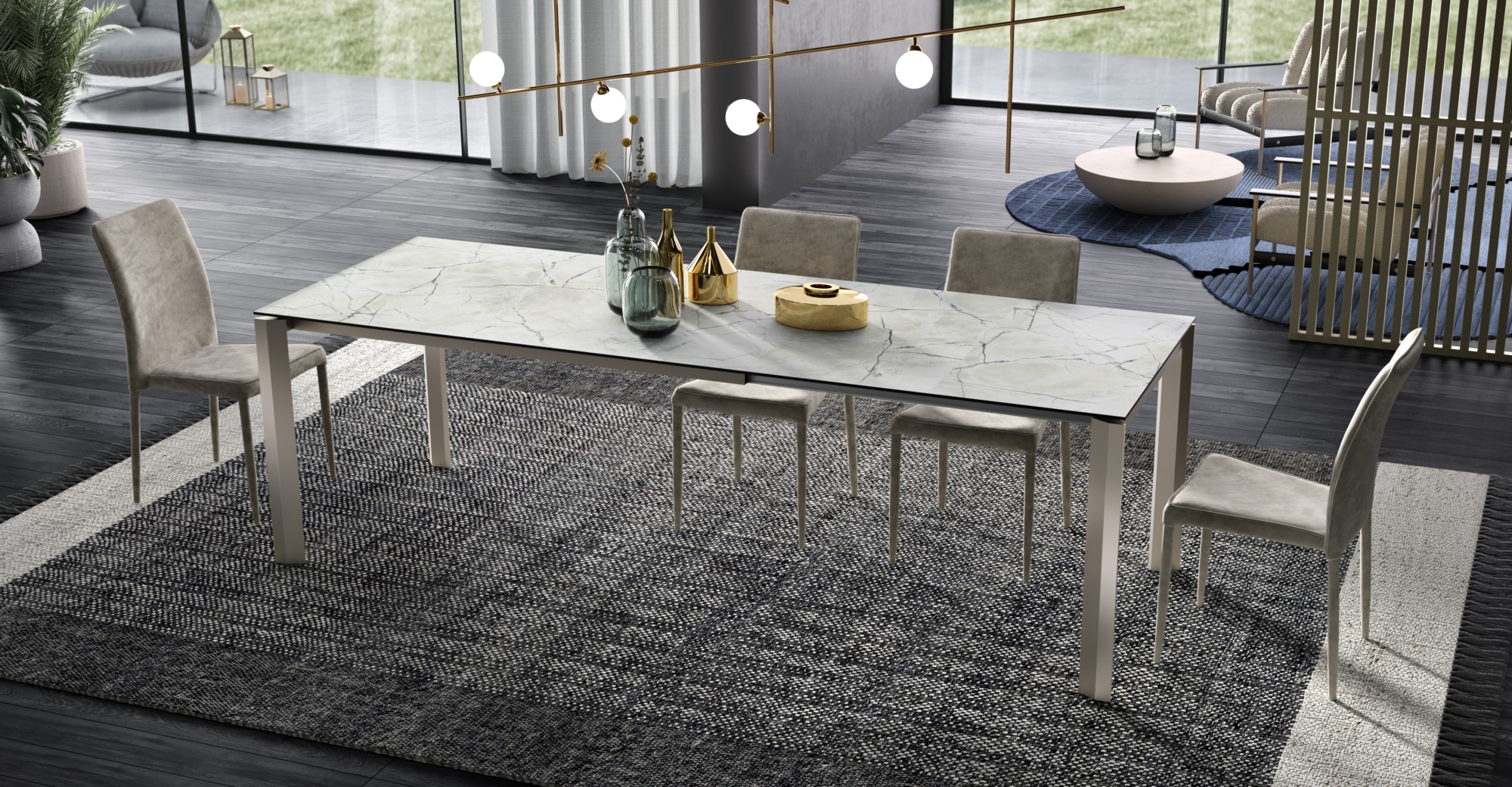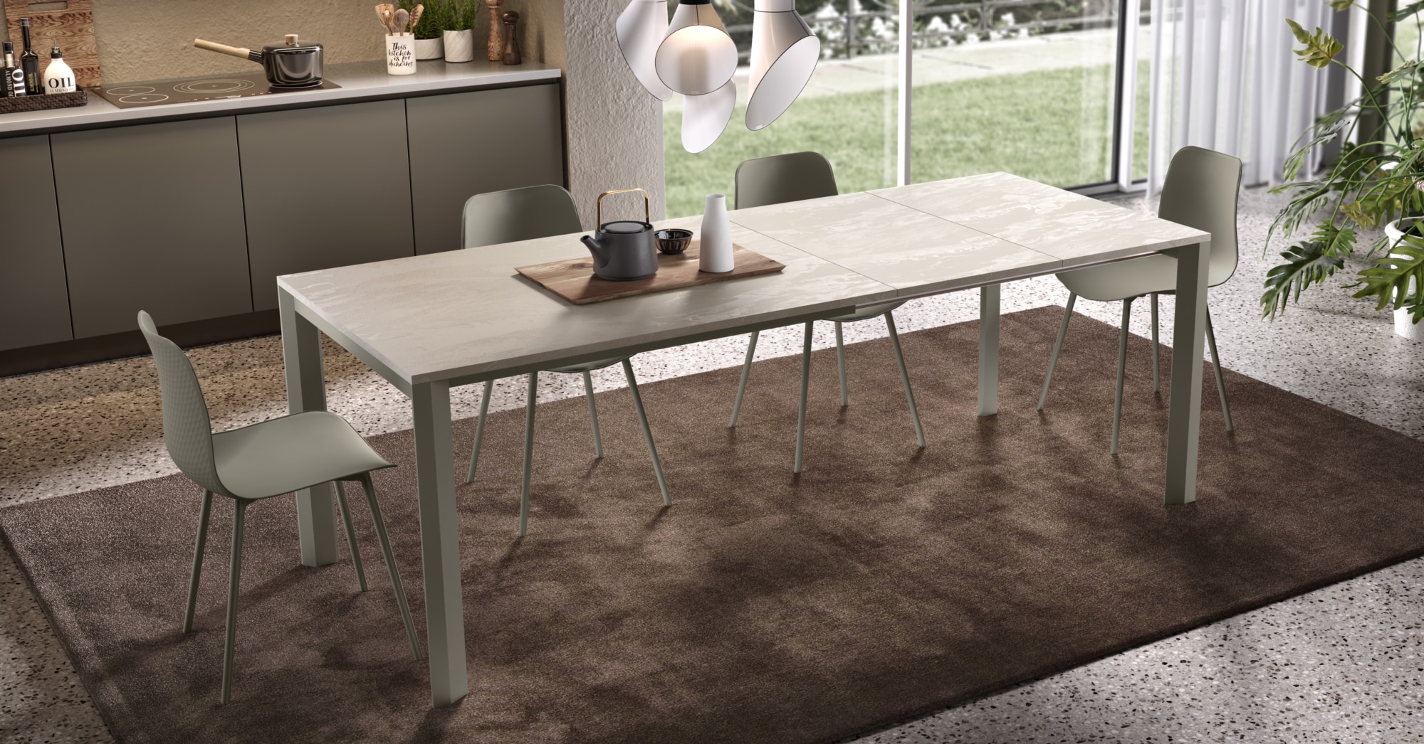 Tavolo allungabile da un lato, piano in unico pezzo, allunghe contenute all’interno del tavolo. Piano disponibile in Nobilitato, Laminato, Vetro-Ceramica o impiallacciato in Rovere. Versione “Rovere Spaccato” (RSP) in vero legno vecchio. Gambi e sistema di allungo telescopico interamente in Alluminio anodizzato, verniciato a polvere epossidica o smalti materici.