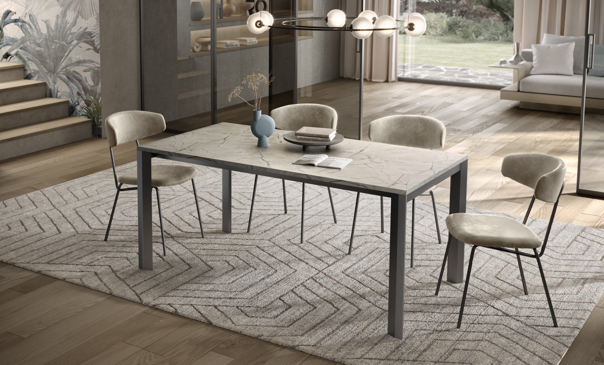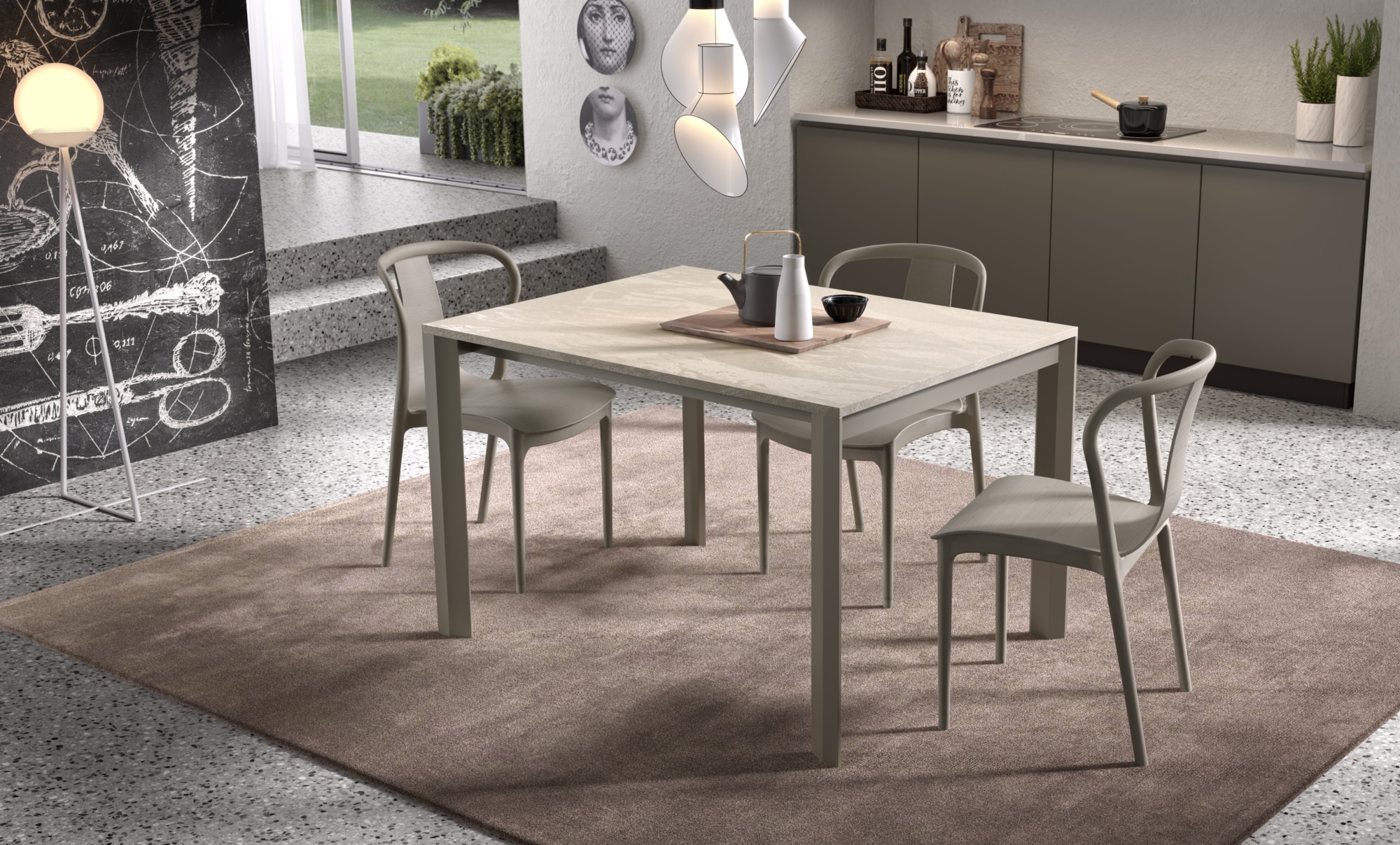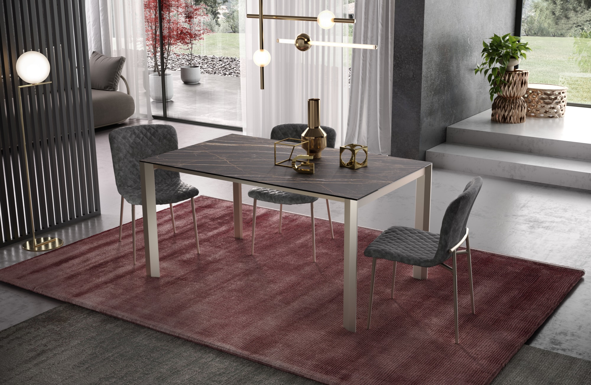 Tavolo allungabile da un lato, piano in unico pezzo, allunghe contenute all’interno del tavolo. Piano disponibile in Nobilitato, Laminato, Vetro-Ceramica o impiallacciato in Rovere. Versione “Rovere Spaccato” (RSP) in vero legno vecchio. Gambi e sistema di allungo telescopico interamente in Alluminio anodizzato, verniciato a polvere epossidica o smalti materici.