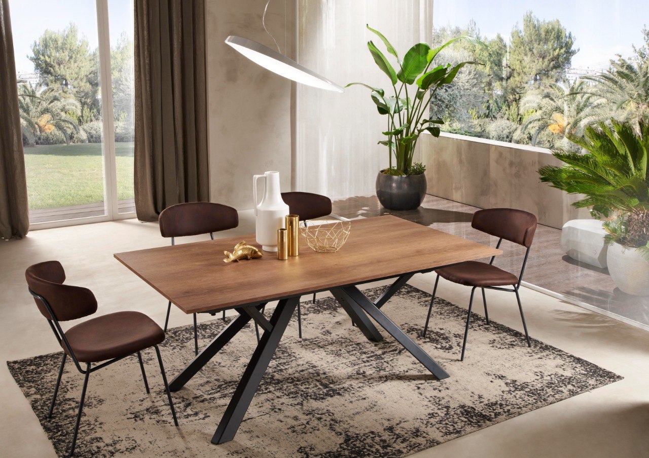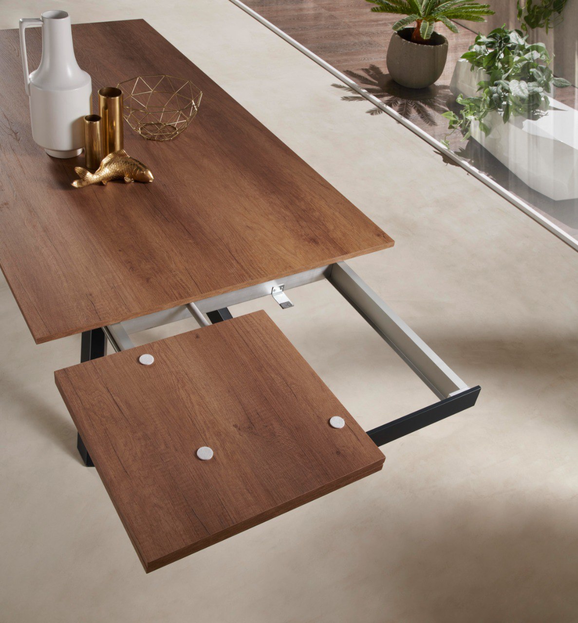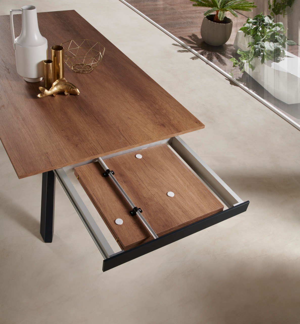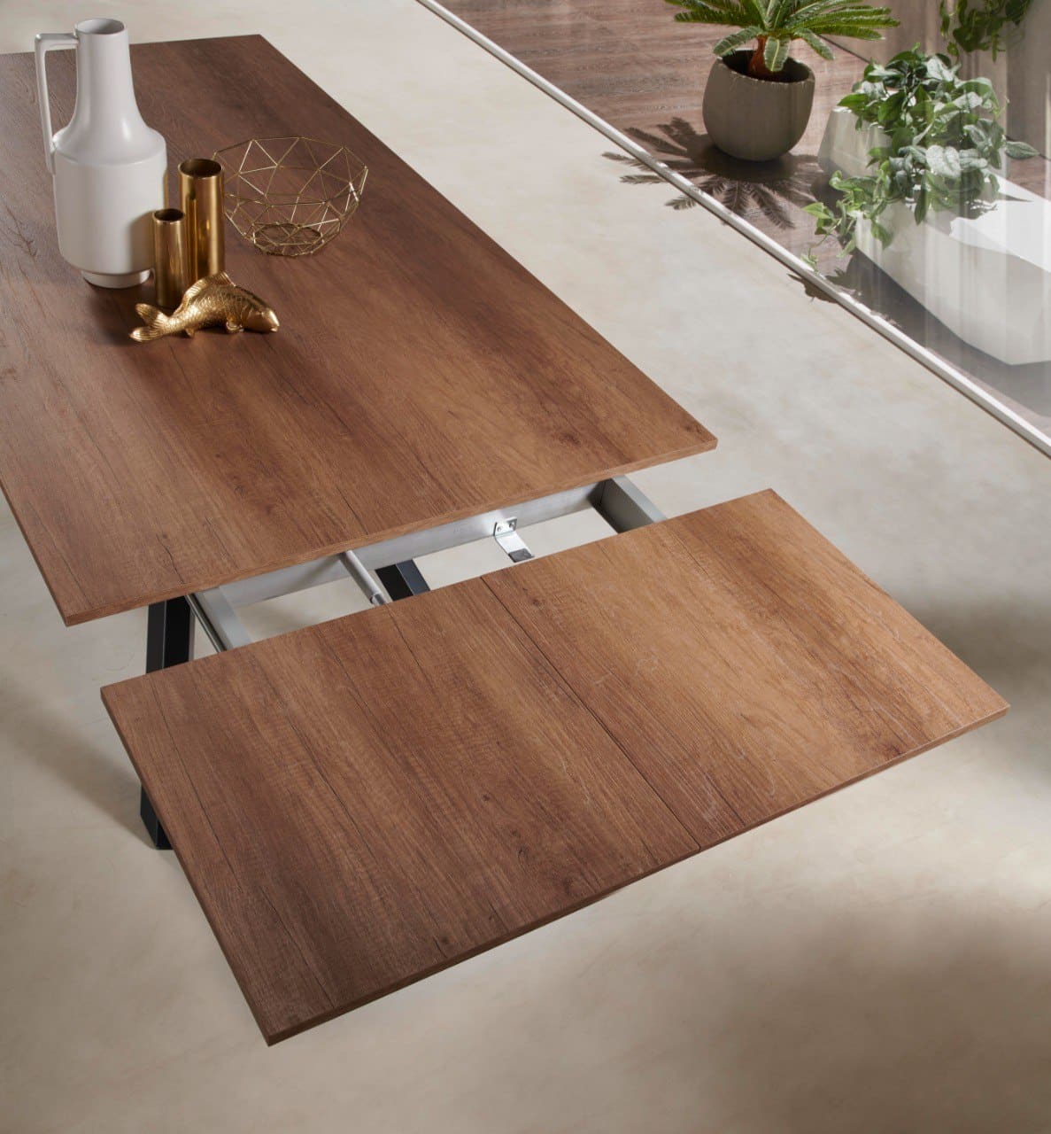Tavolo allungabile lateralmente sui due lati, piano rettangolare in unico pezzo, allunghe laterali pieghevoli solidali al tavolo e al sistema di allungo, piano disponibile in Nobilitato, Laminato o impiallacciato in Rovere, supporto pannello di particelle di legno misto pioppo a bassa emissione di formaldeide colle poliuretaniche a norma DIN EN 204 spessore 20mm (nobilitato spessore 18mm), sistema di allungo interamente in alluminio anodizzato, basamento interamente in alluminio anodizzato verniciato a polvere epossidica o smalti materici.