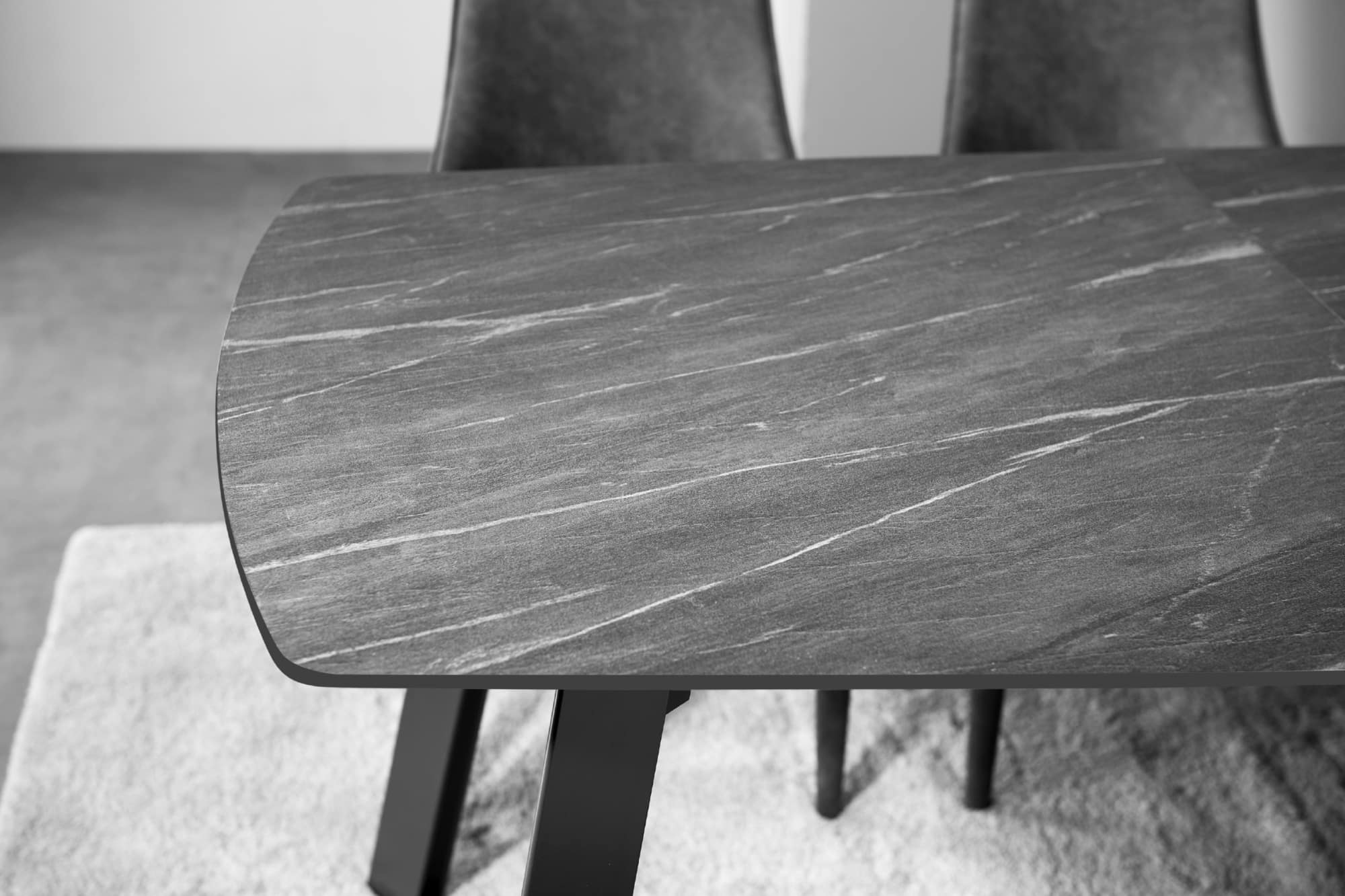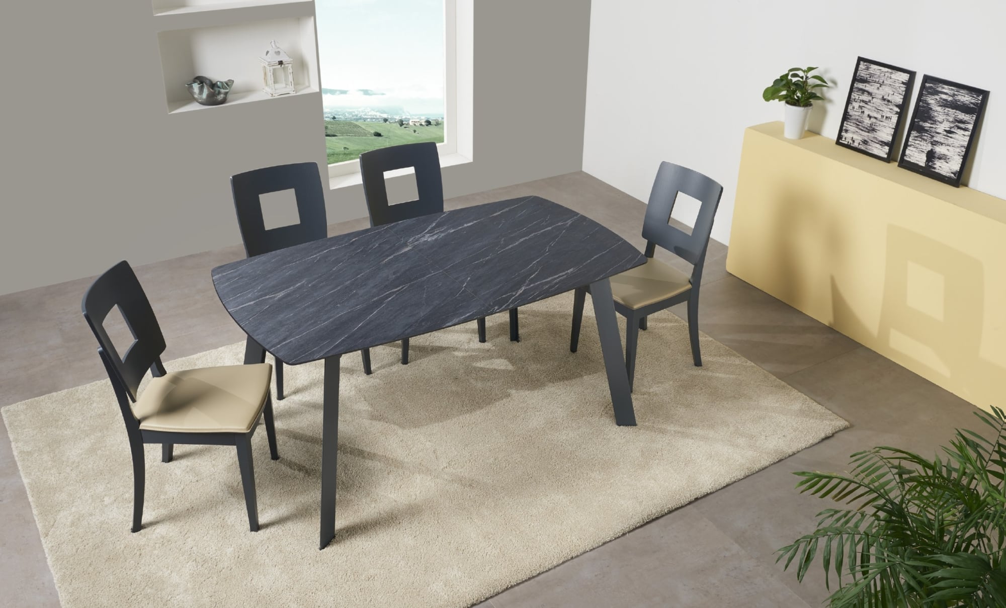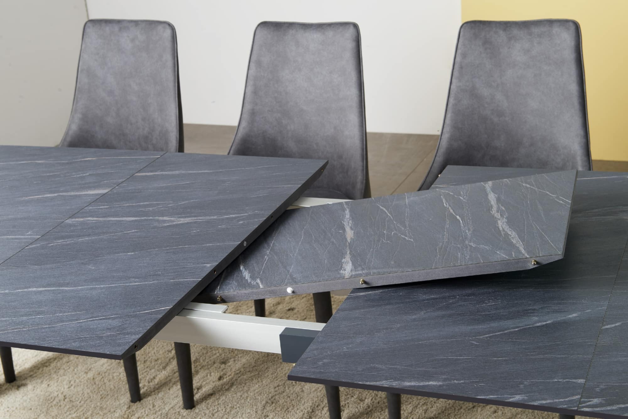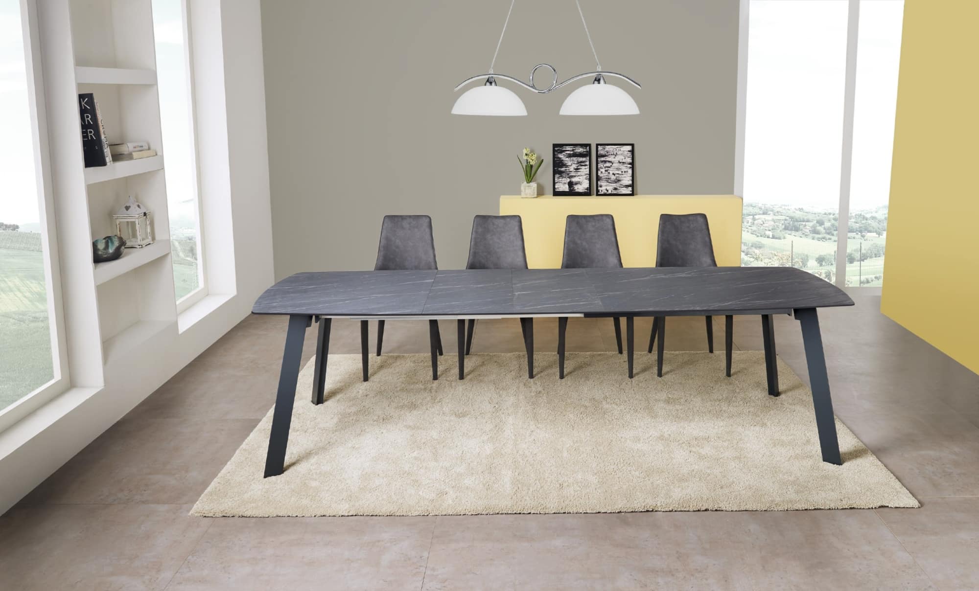 Tavolo allungabile al centro, con scorrimento laterale delle gambe che rimangono sempre perimetrali. Le allunghe sono contenute all’interno del tavolo. Il piano è disponibile in Nobilitato, Laminato o impiallacciato in Rovere, con la versione “Rovere Spaccato” (RSP), che utilizza vero legno vecchio. Il supporto è in MDF tecnologico con spessore di 20 mm e bordo rastremato a 8 mm perimetralmente (ad eccezione del piano in nobilitato). Il sistema di allungo è realizzato in alluminio anodizzato, mentre le gambe sono in alluminio anodizzato verniciato a polvere epossidica e rifinite con smalti materici.