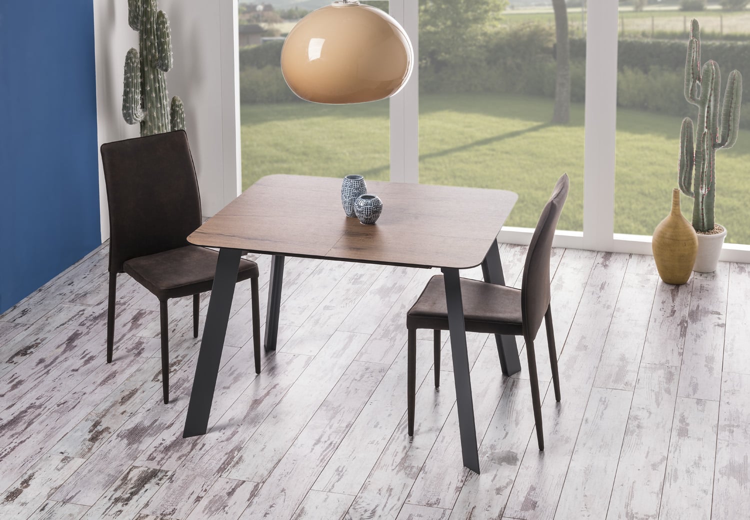 Tavolo allungabile al centro, con scorrimento laterale delle gambe che rimangono sempre perimetrali. Le allunghe sono contenute all’interno del tavolo. Il piano è disponibile in Nobilitato, Laminato o impiallacciato in Rovere, con la versione “Rovere Spaccato” (RSP), che utilizza vero legno vecchio. Il supporto è in MDF tecnologico con spessore di 20 mm e bordo rastremato a 8 mm perimetralmente (ad eccezione del piano in nobilitato). Il sistema di allungo è realizzato in alluminio anodizzato, mentre le gambe sono in alluminio anodizzato verniciato a polvere epossidica e rifinite con smalti materici.